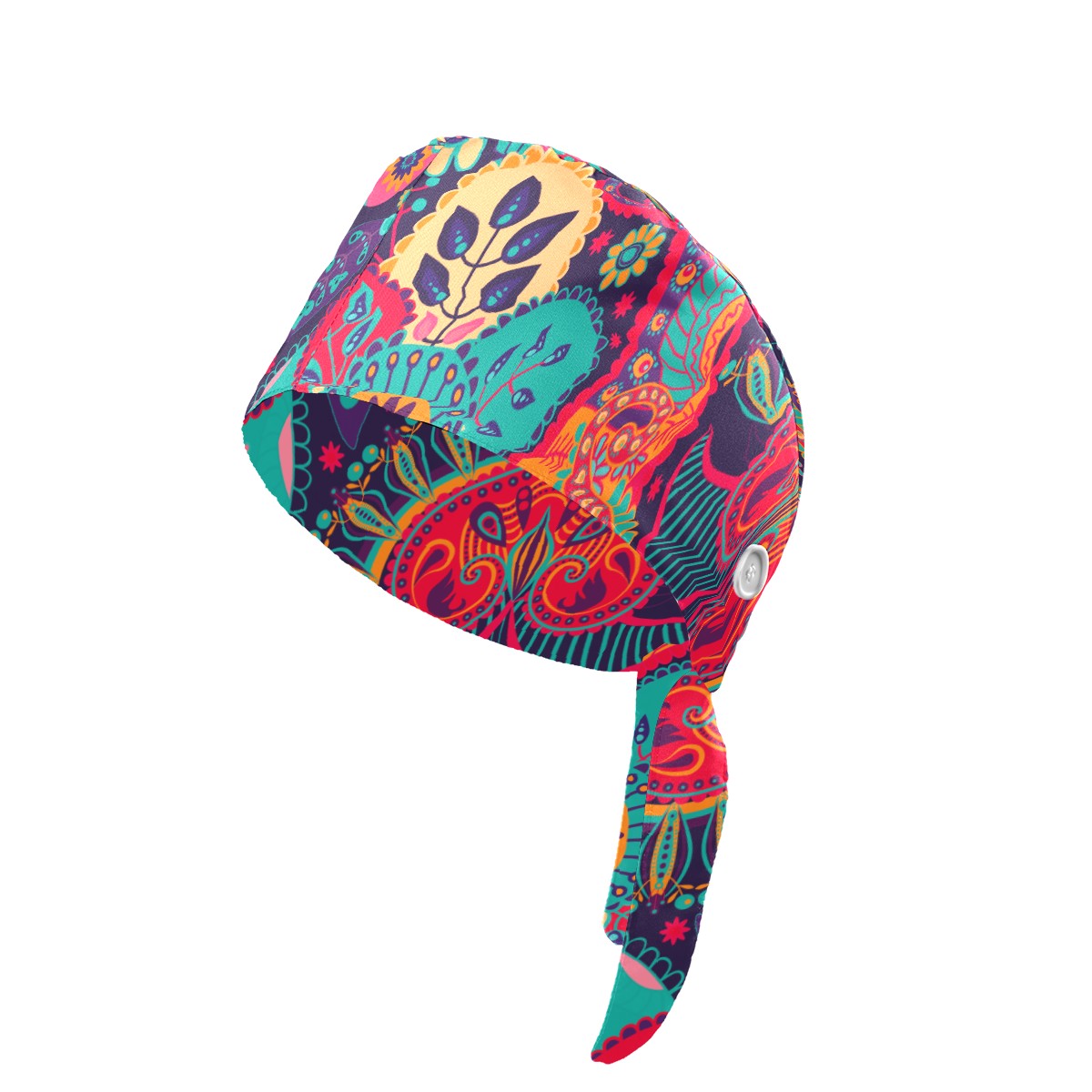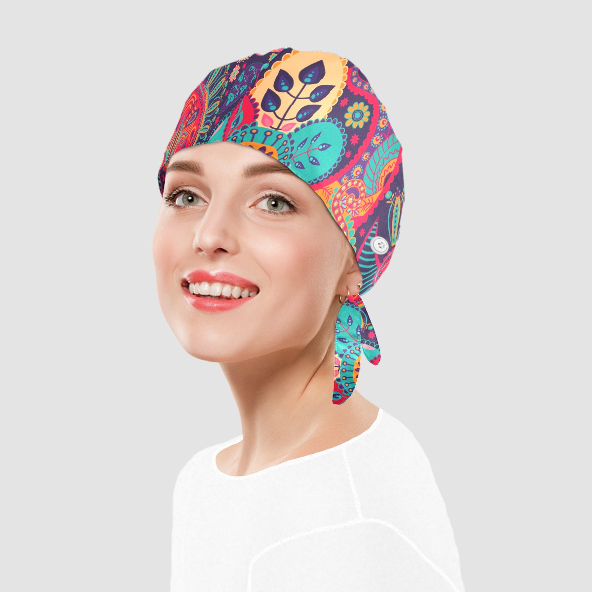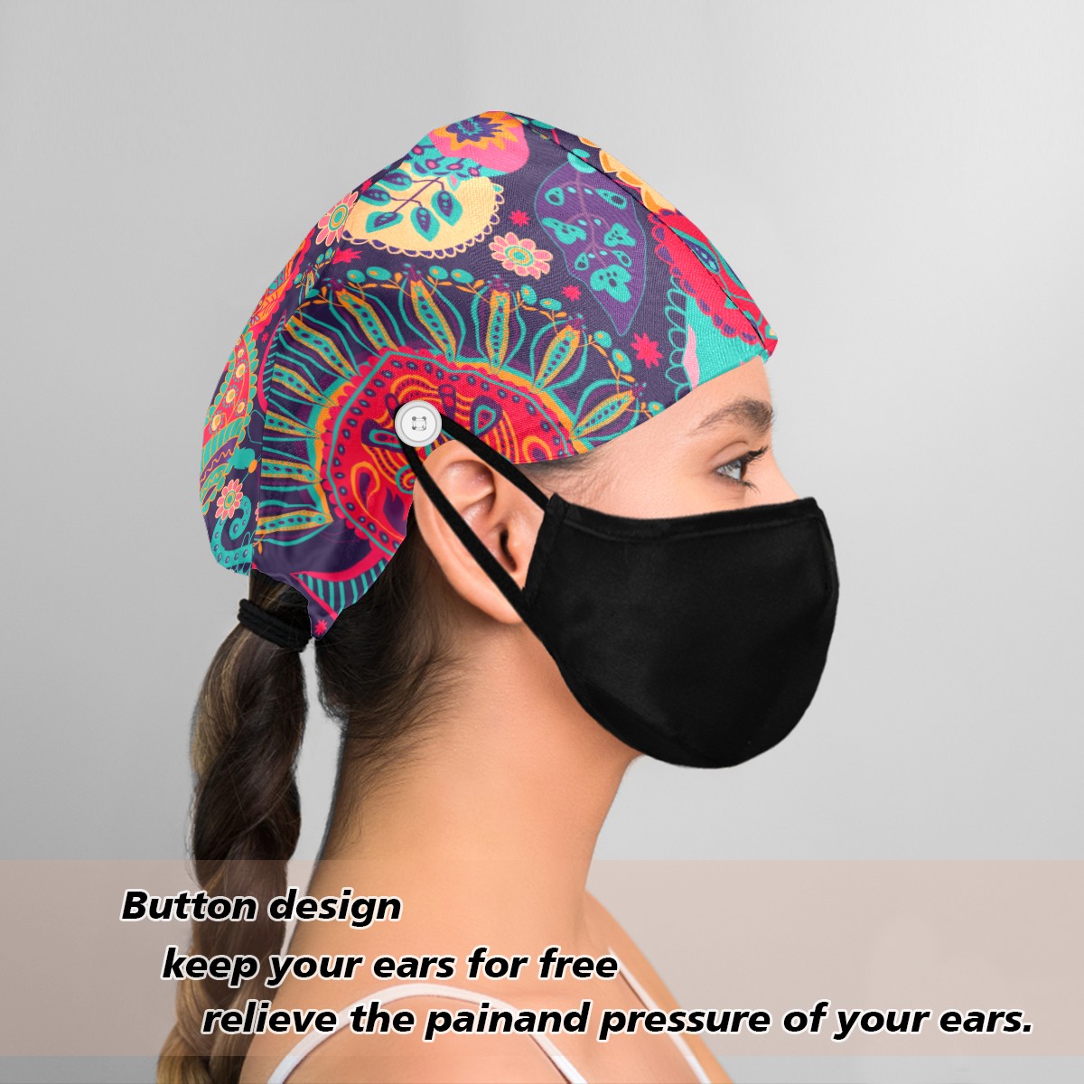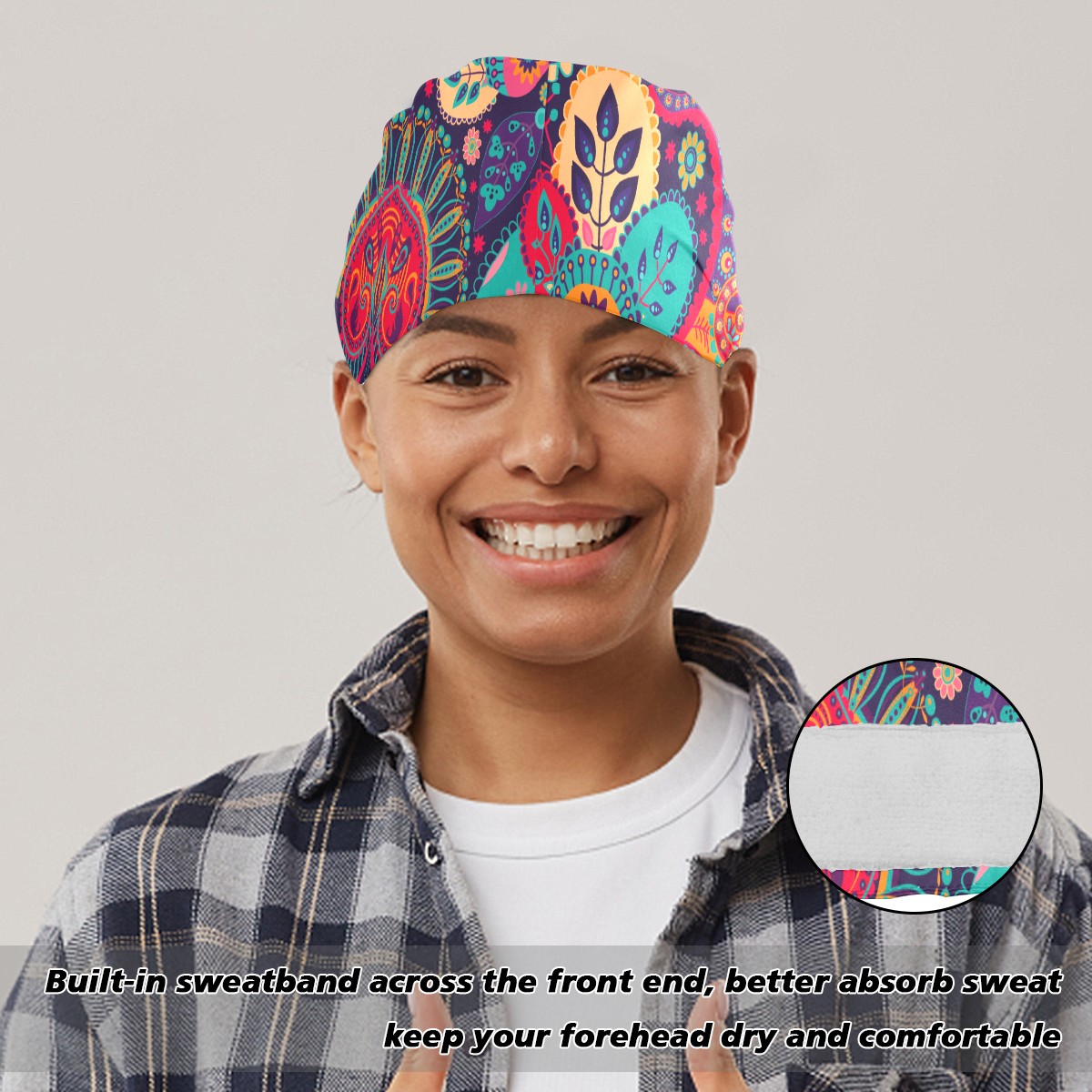 Adjustable Working Caps,Colorful Ethnic Floral Print Bouffant Hat With Button and Sweatband , Hair Covers Head Cover Turban Cap for Women/Men