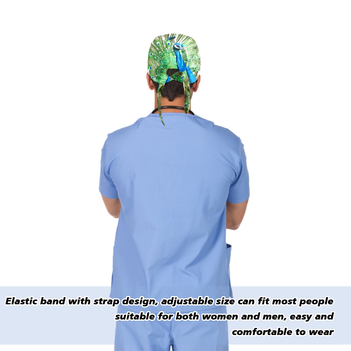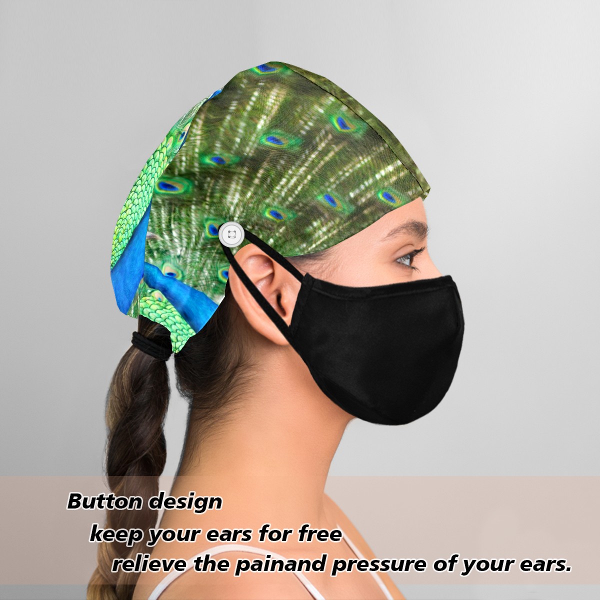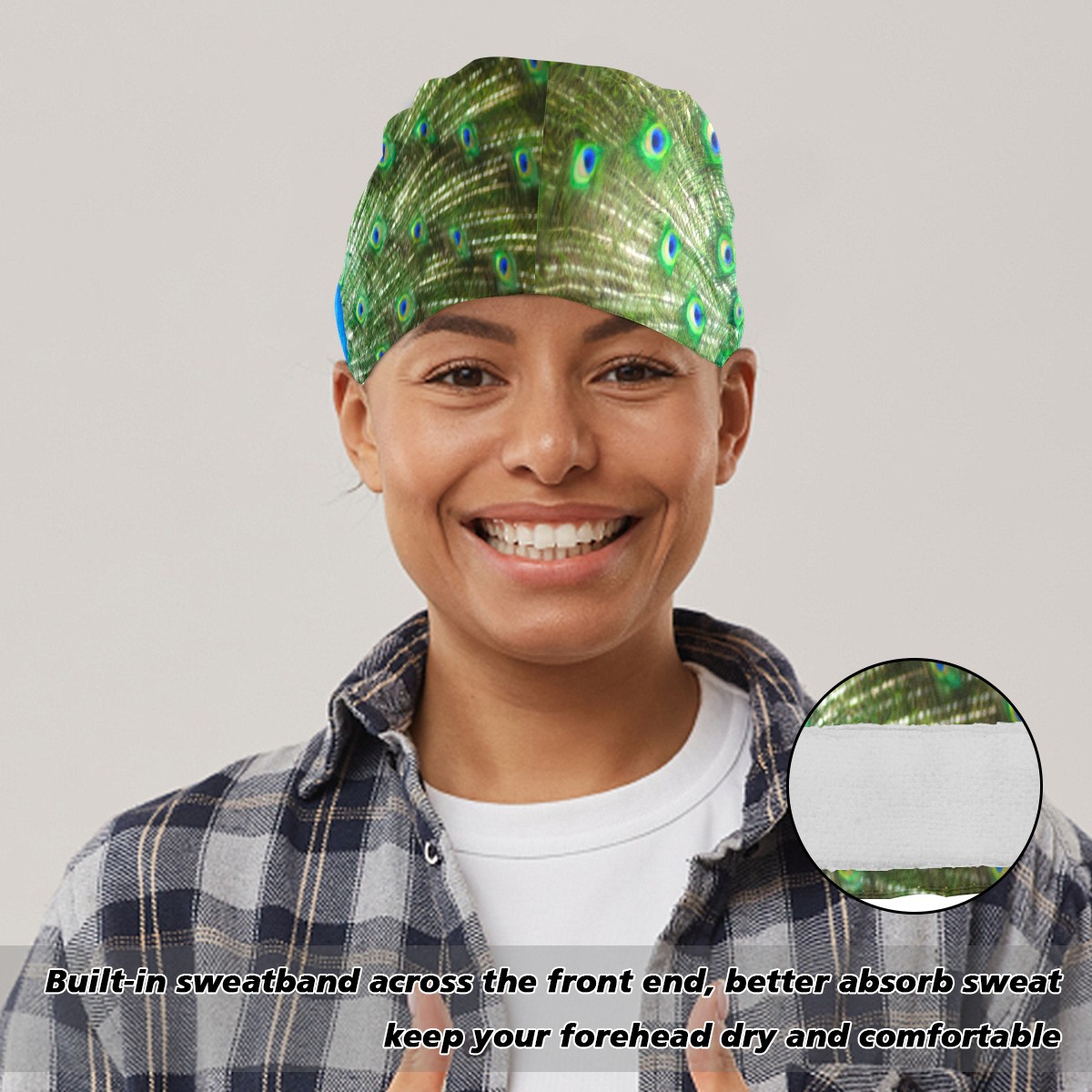 Adjustable Working Caps,Animal Peacock Feather Bouffant Hat With Button and Sweatband , Hair Covers Head Cover Turban Cap for Women/Men