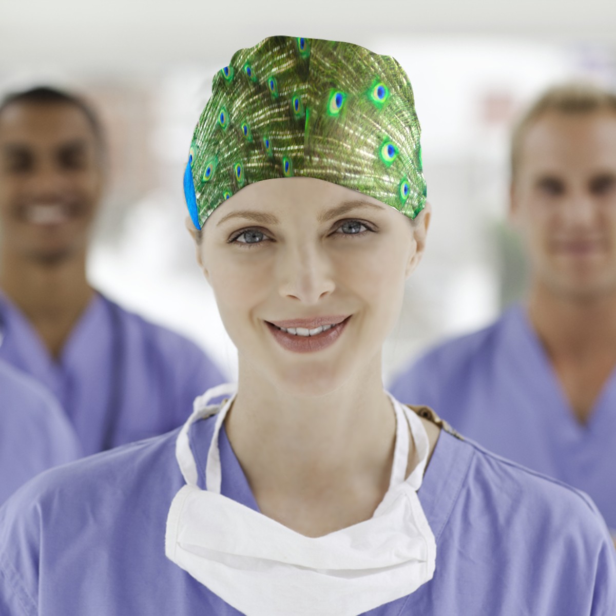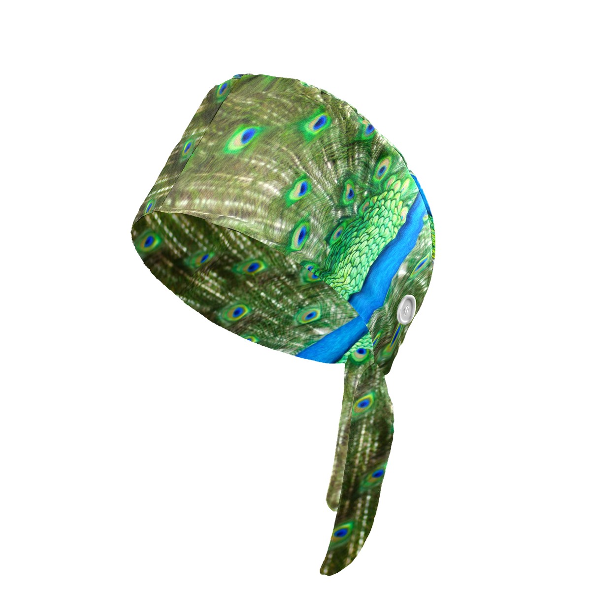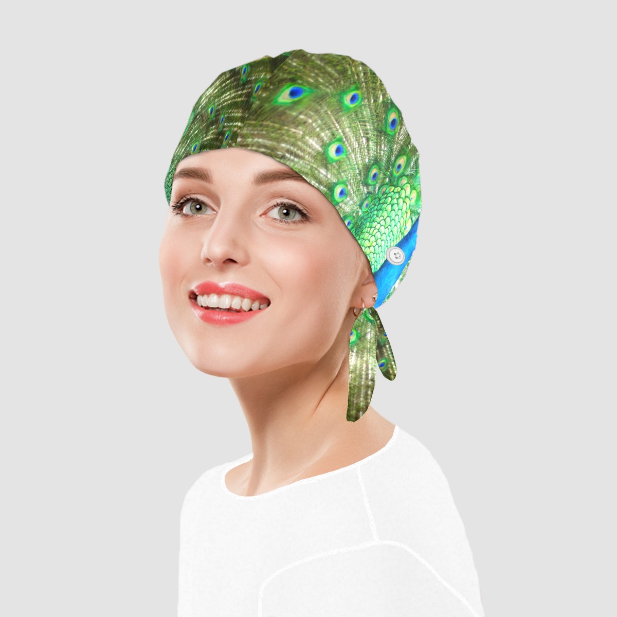 Adjustable Working Caps,Animal Peacock Feather Bouffant Hat With Button and Sweatband , Hair Covers Head Cover Turban Cap for Women/Men