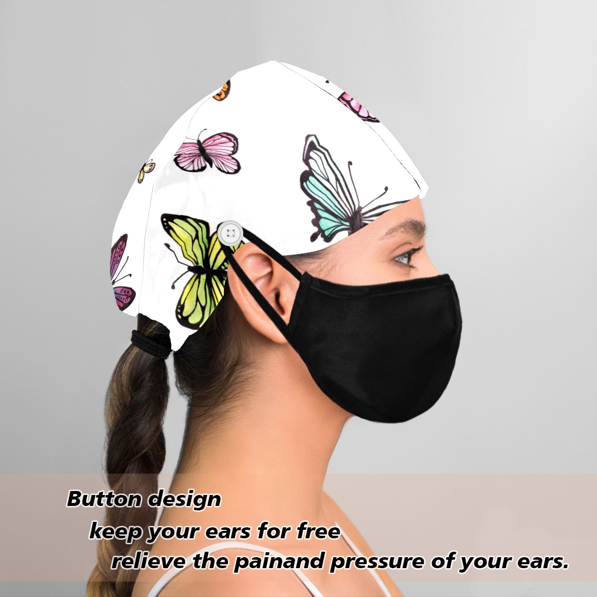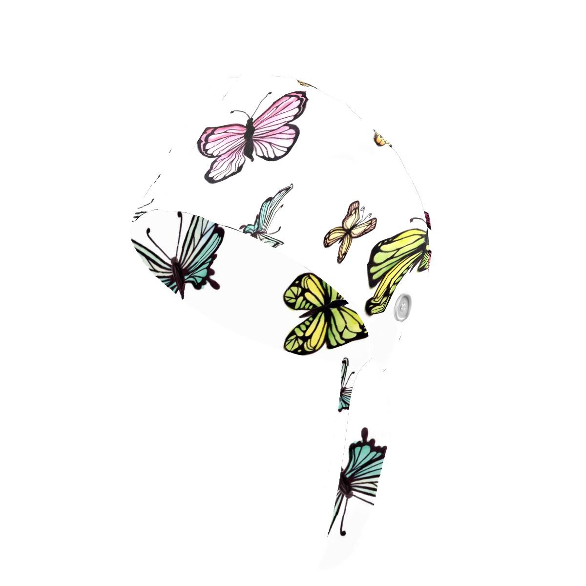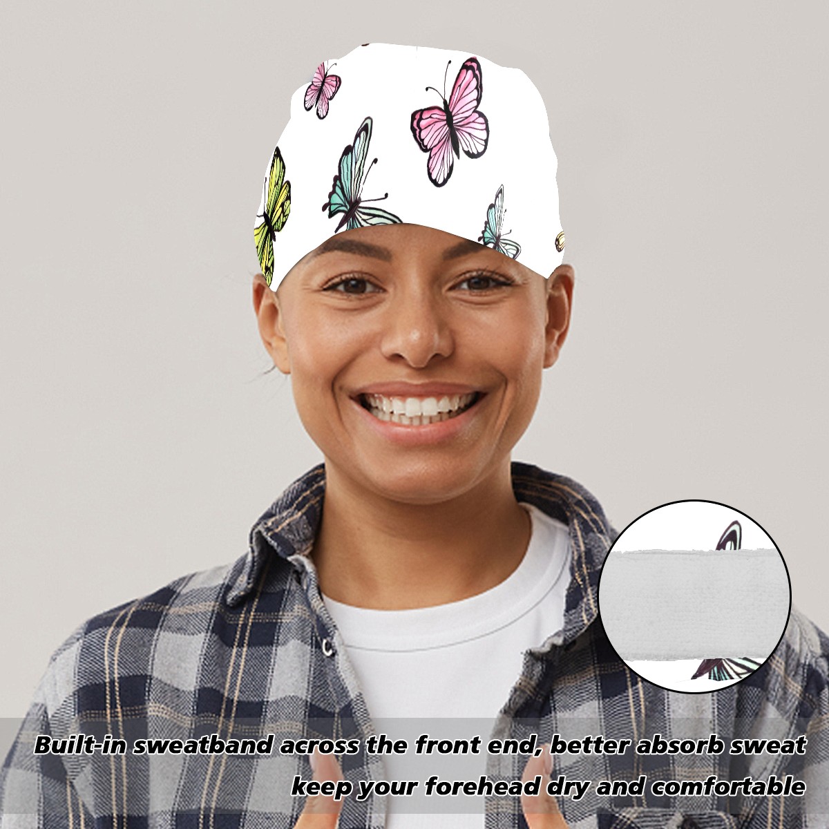 Adjustable Working Caps,Colorful Butterflies Print Bouffant Hat With Button and Sweatband , Hair Covers Head Cover Turban Cap for Women/Men