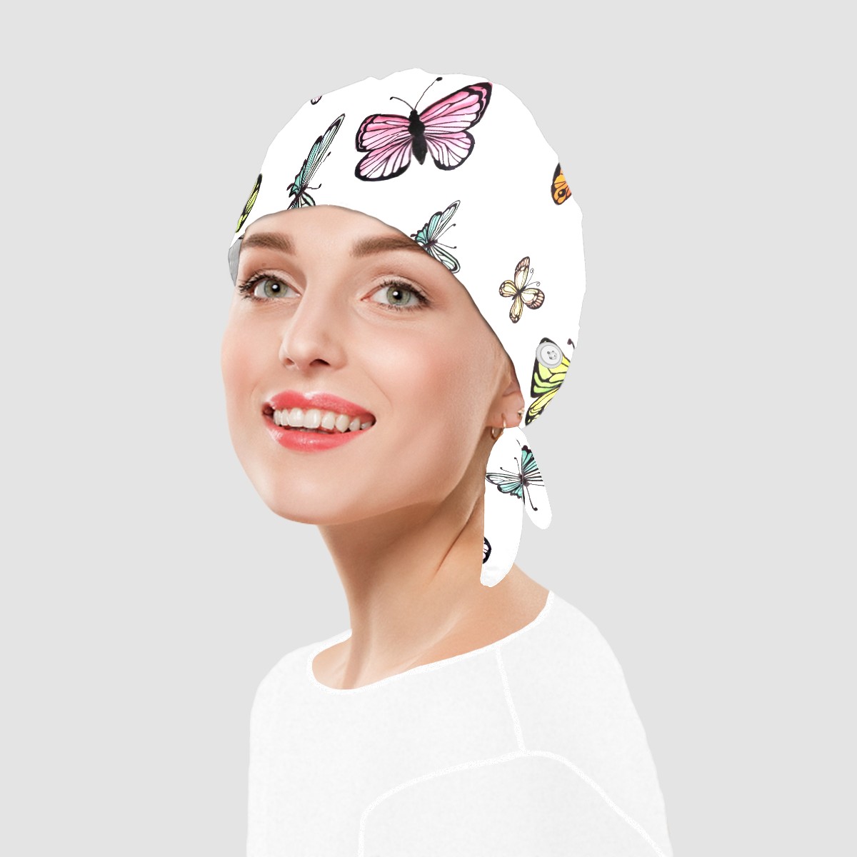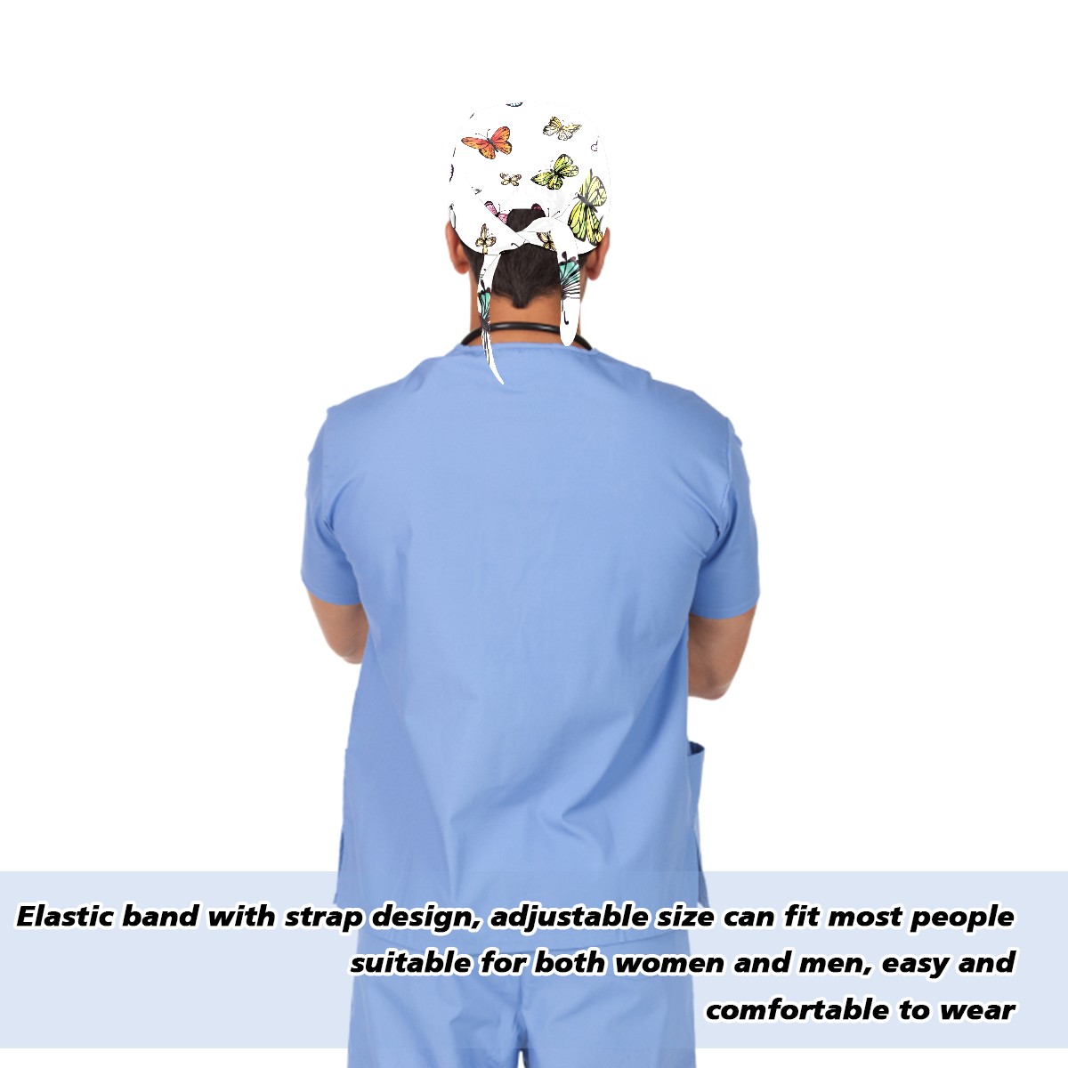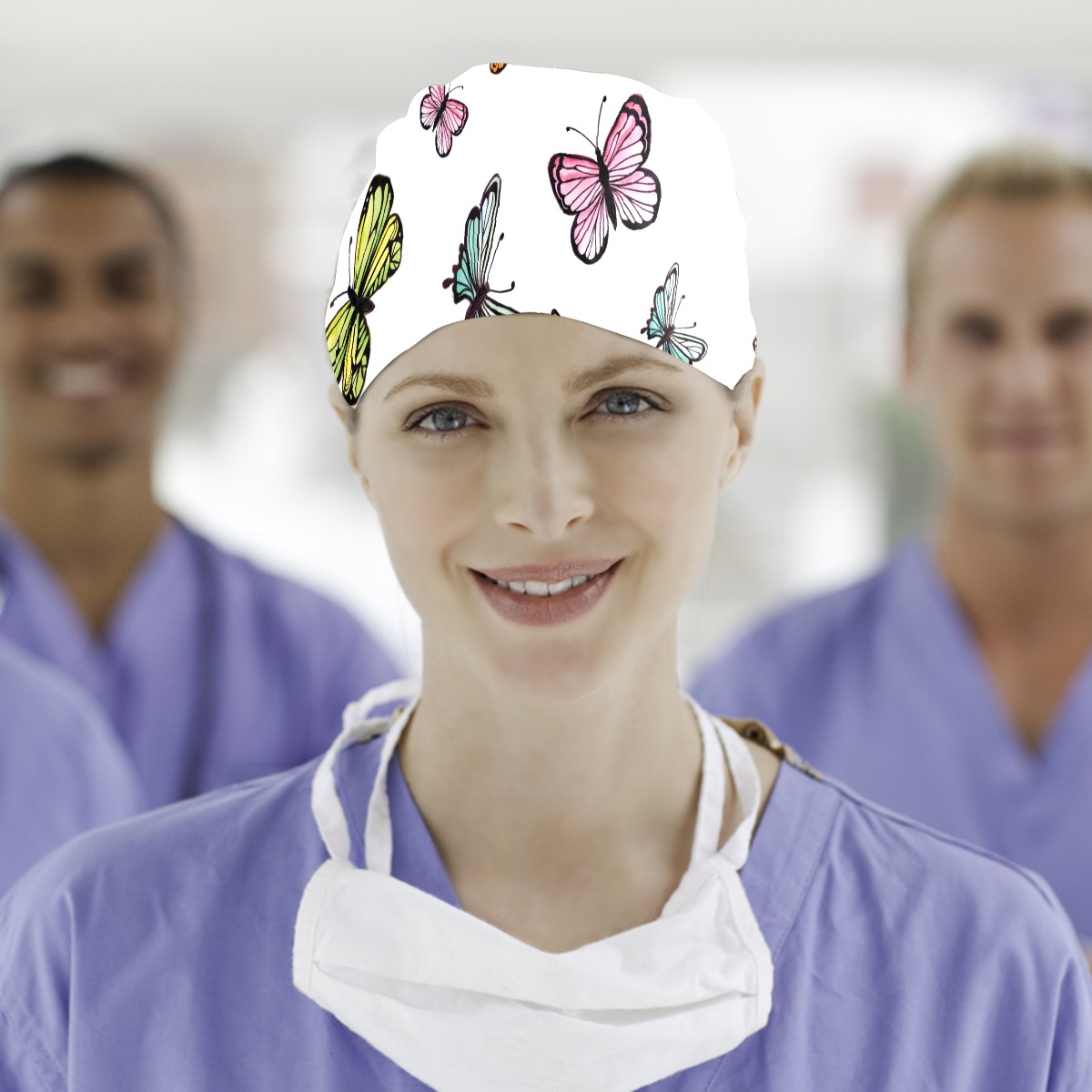 Adjustable Working Caps,Colorful Butterflies Print Bouffant Hat With Button and Sweatband , Hair Covers Head Cover Turban Cap for Women/Men