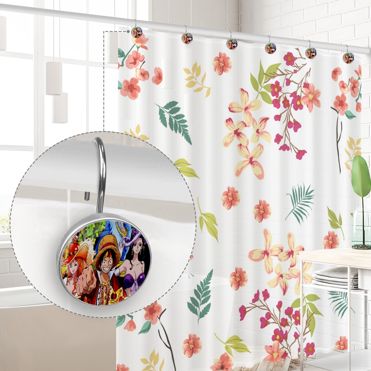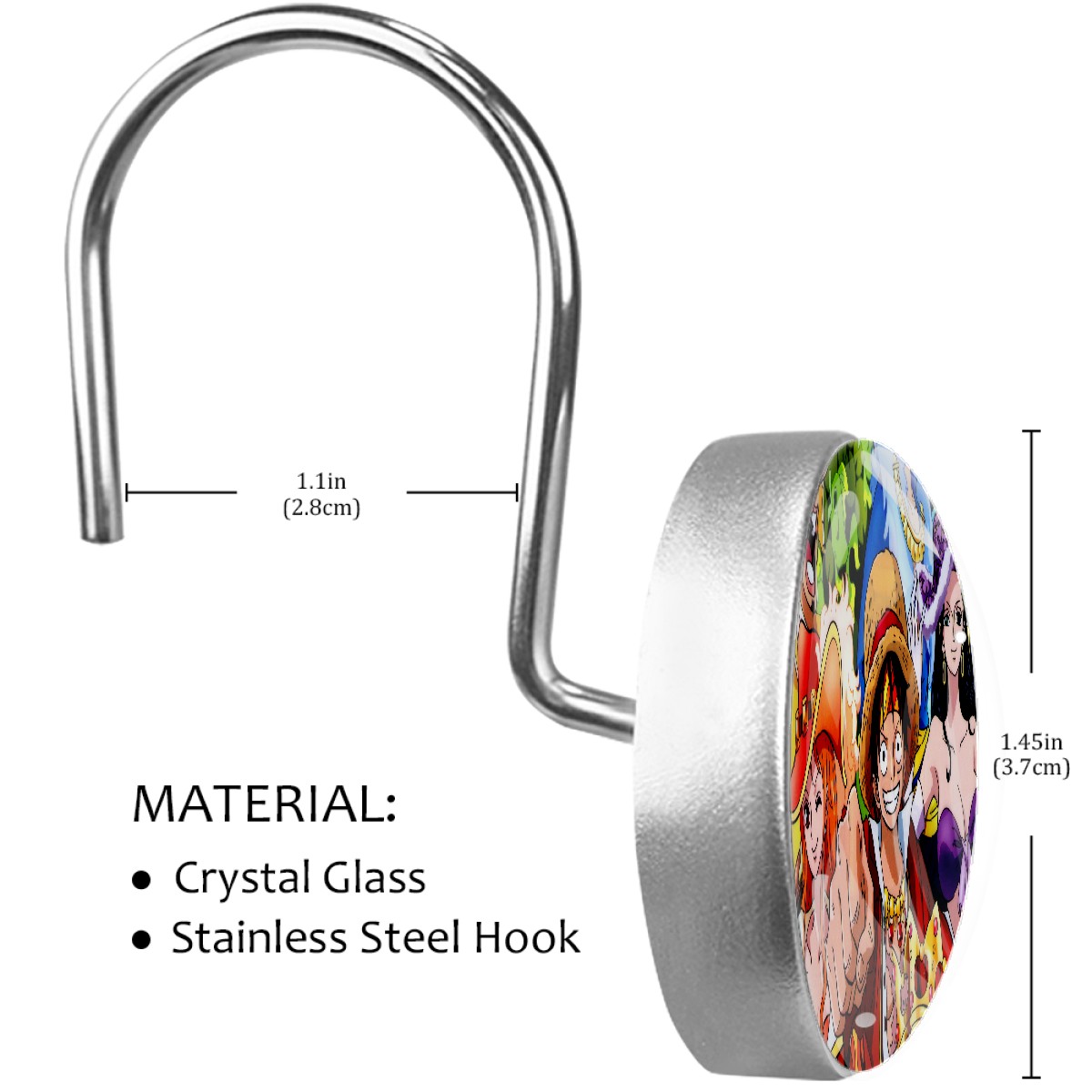 <p><b>Diamond Shaped Shower Curtain Hooks12PCS Shower Curtain Rings for Shower Rods Curtain and Liner Home Decor&nbsp;</b></p><p><b>Size:</b>Crystal glass diameter-1.45x1.45in/ 3.7x3.7cm. Hook diameter is about 1.1in</p><p><b>Material:</b>Crystal Glass + Stainless Steel Hook, Single-sided printing</p><p>Package included: 12&nbsp;x Shower Curtain Hooks</p><p></p><p><b>Features:</b></p><p>-Simply thread through existing holes and hang over shower rod.This decorative shower curtain rings allow effortless gliding across the rod with virtually no effort at all.</p><p>-The shower curtain hook adopts U-shaped hook design, with strong load-bearing capacity, safe and stable, without slide out and fall.</p><p>-Inlaid with crystals, a row of round crystal hooks sparkle and charming under the refraction of light, creating a warm and romantic home for you</p><p>-This bling bling decorative shower curtain rings can attach to your shower curtain eyelets and curtain pole very quickly and easily.</p><p>-Durable rust-resistant design that won't detach or break when moderate stress is put on the curtain. The stainless steel material, non-magnetic metal is corrosion-free, meaning it will last indoors and outdoors without rusting</p><p>-Best Birthday/Christmas Gift&nbsp;to your family, friends, kids, girls, boys, girlfriend, boyfriend, men, women, etc.&nbsp;</p>