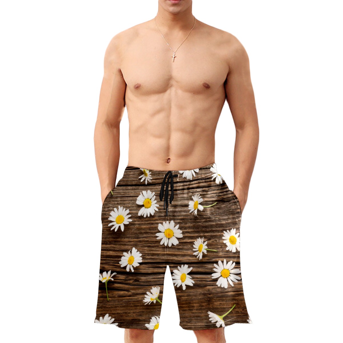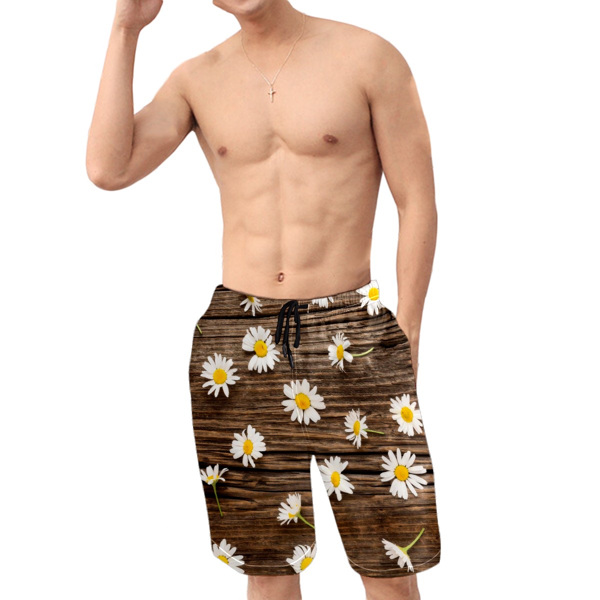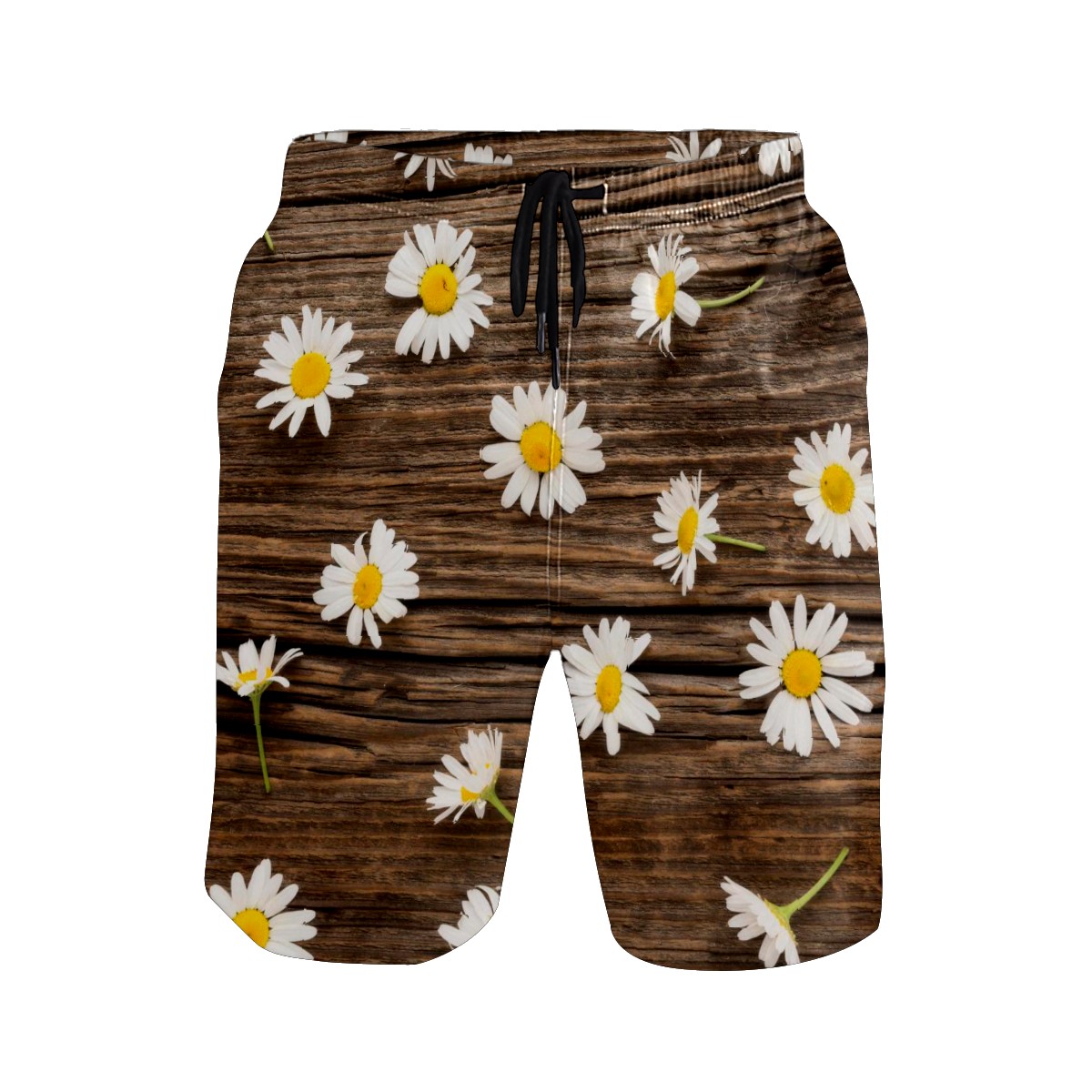 Mens Swim Trunks White Little Daisy Brown Wood Board Beach Board Shorts