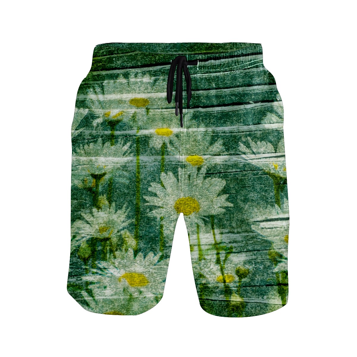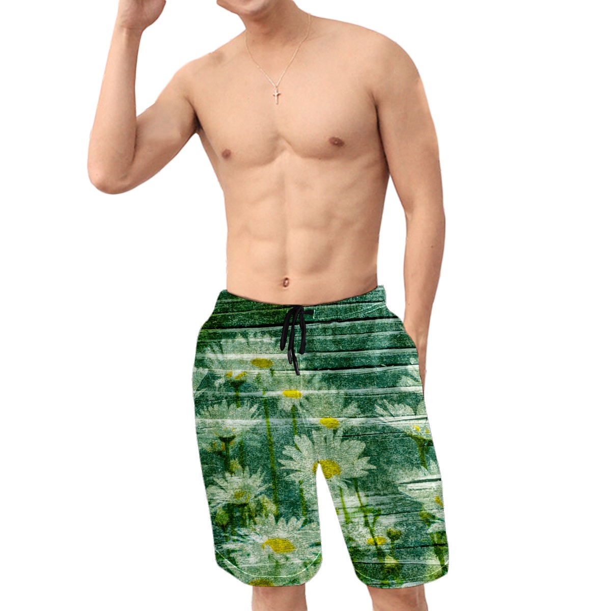Mens Swim Trunks Rustic Green Wood Daisy Flower Beach Board Shorts