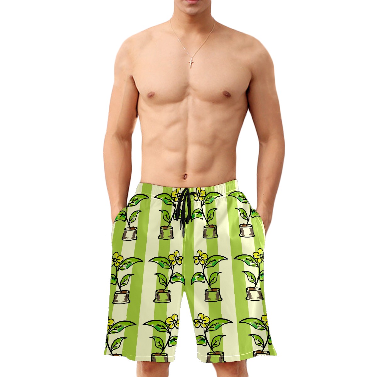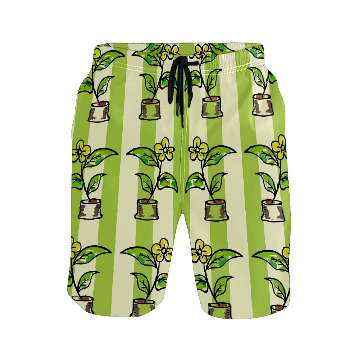 Mens Swim Trunks Potted Flowers Green Stripes Beach Board Shorts