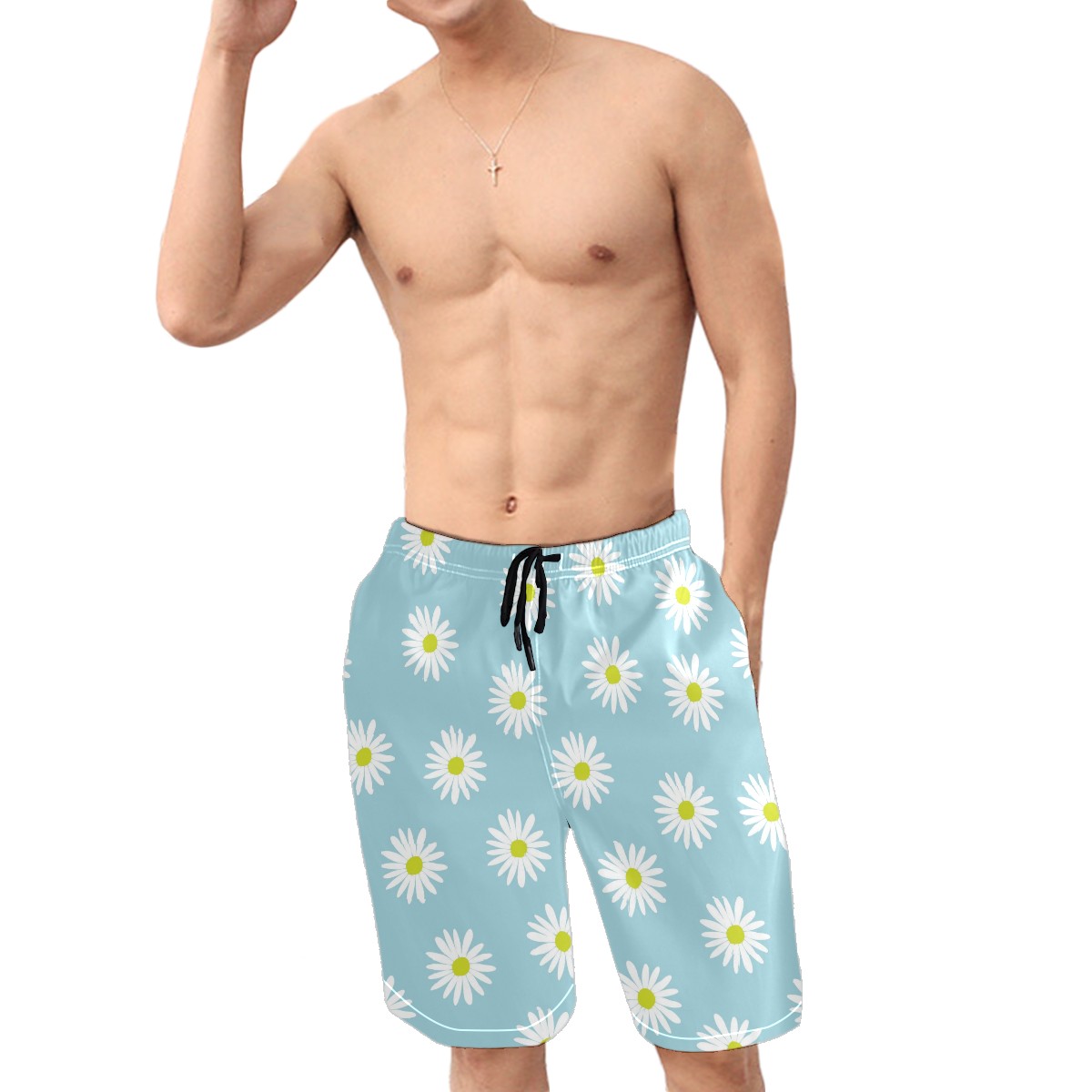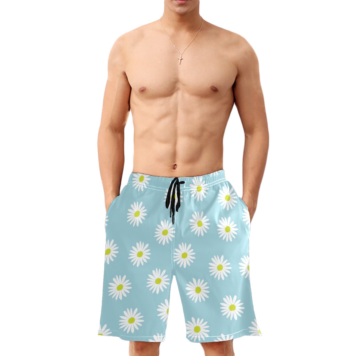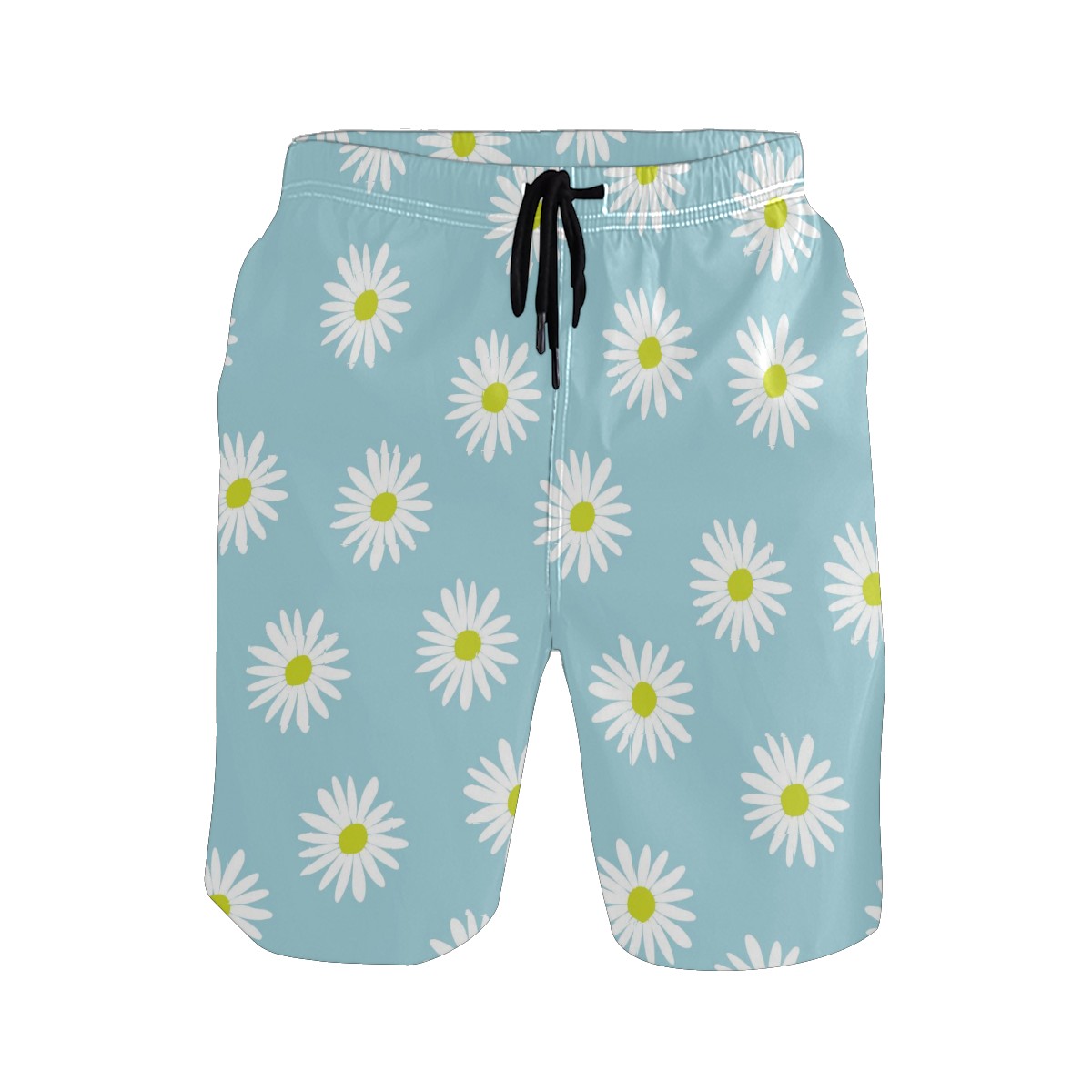 Mens Swim Trunks Light Blue White Daisies Flower Pattern Beach Board Shorts