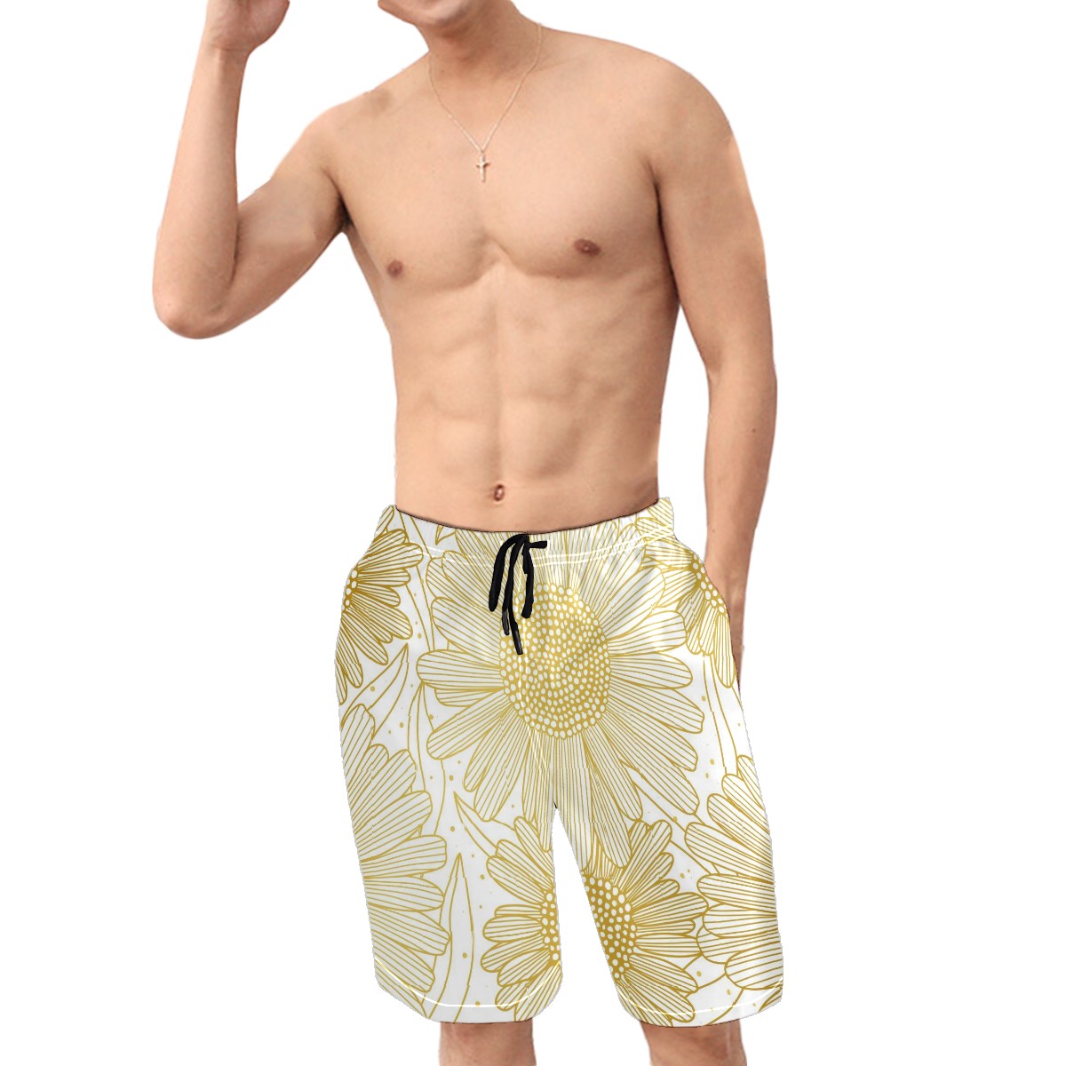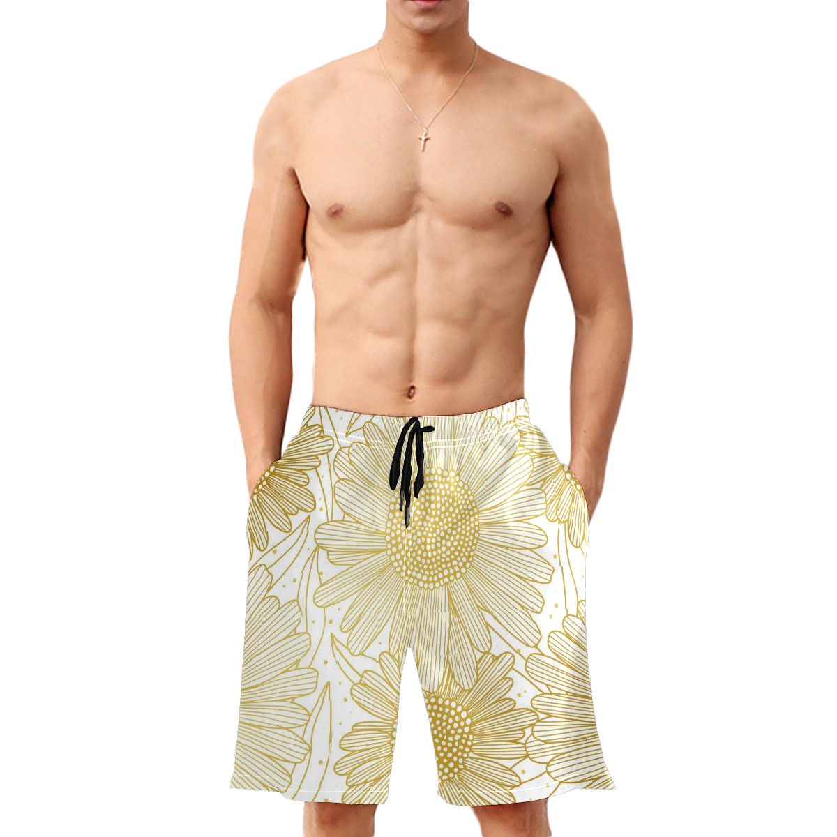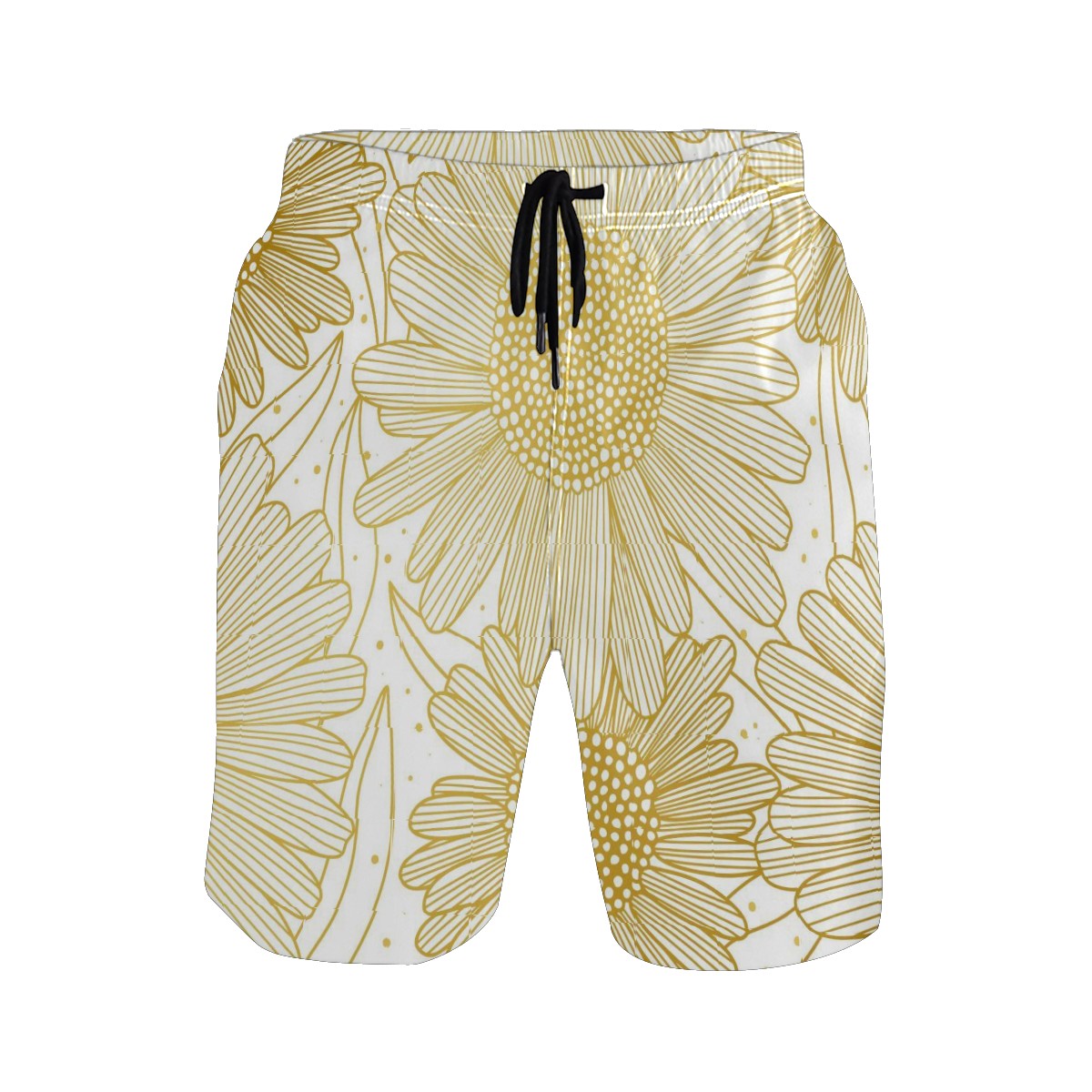 Mens Swim Trunks Golden Hand Drawn Sunflower Pattern Beach Board Shorts