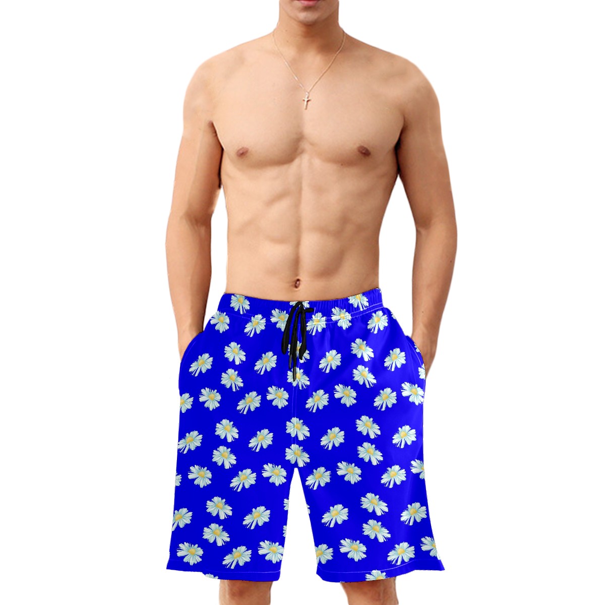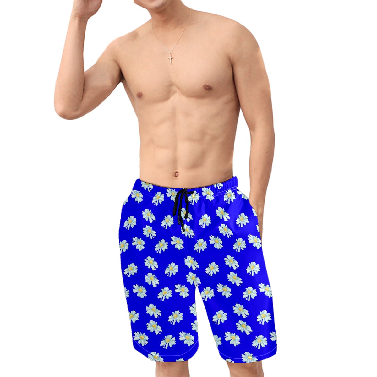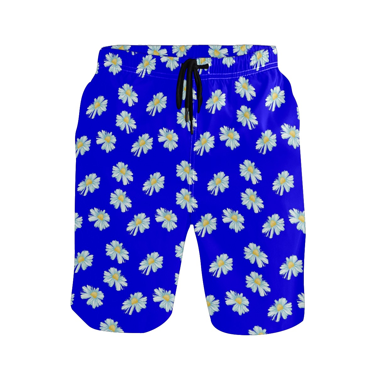 Mens Swim Trunks Chamomile Daisy Pattern Royal Blue Beach Board Shorts
