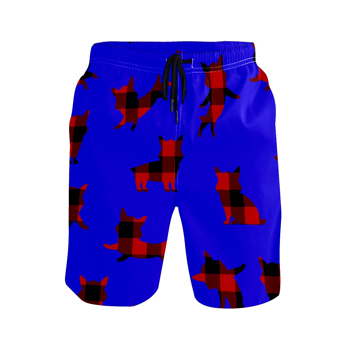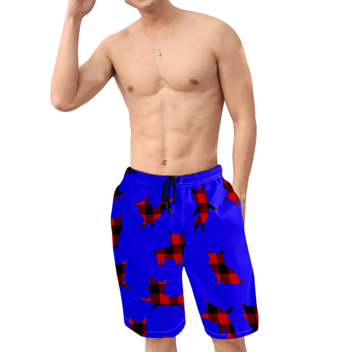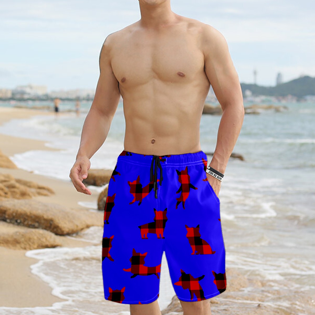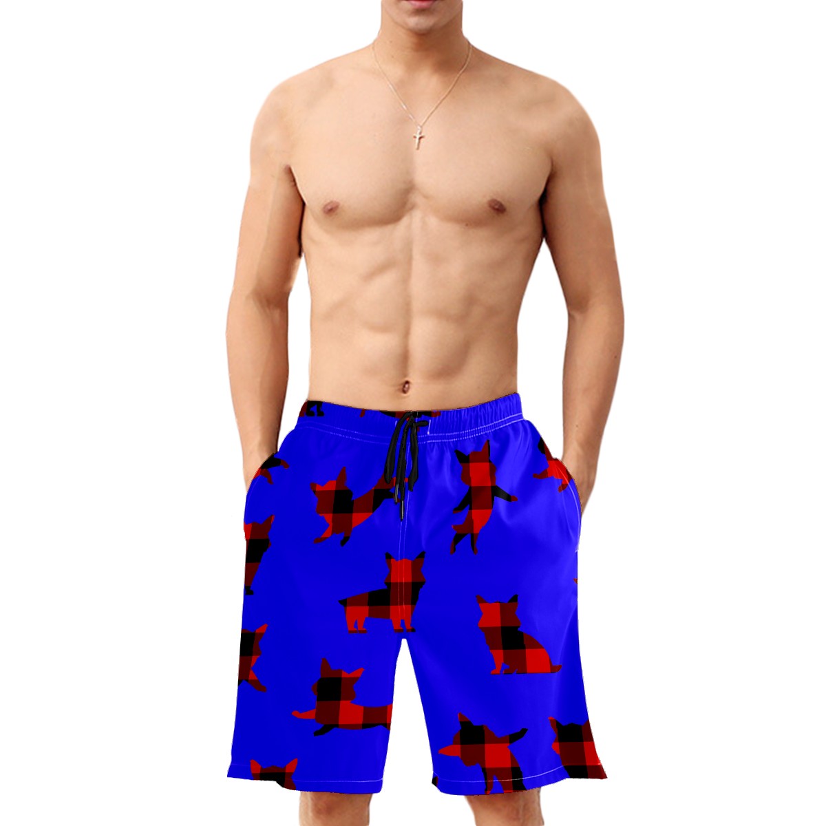 Mens Swim Trunks Black Red Plaid Corgi Dog Royal Blue Beach Board Shorts