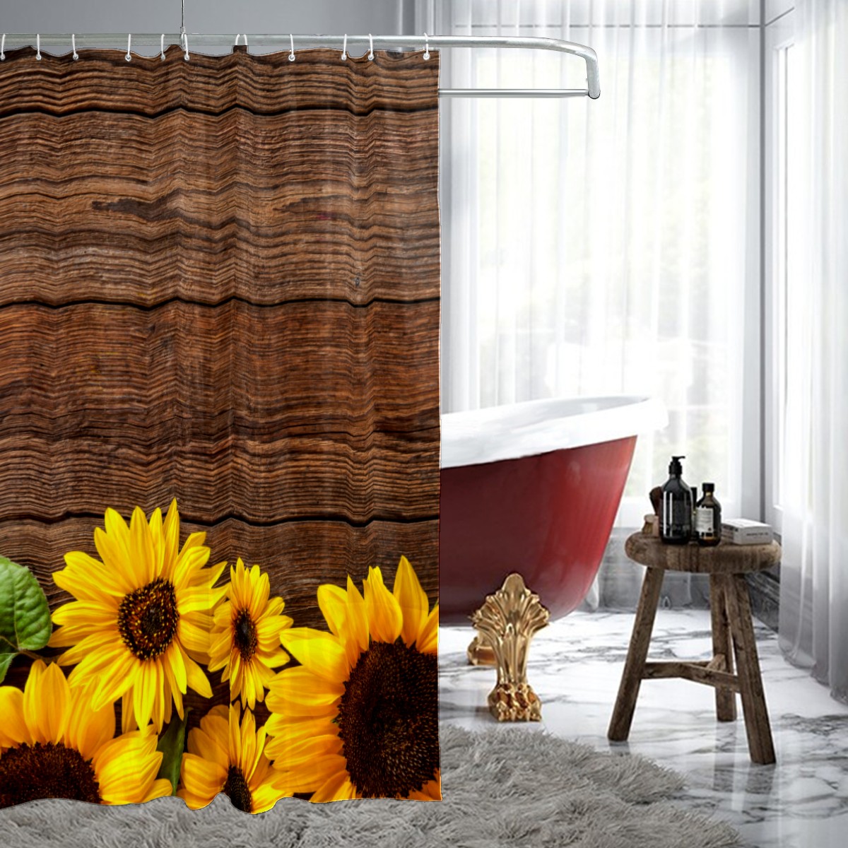 Sunflowers Wooden Retro Colorful Shower Curtain Waterproof Bathroom Shower Curtains for Hotel Bathtub Bathroom Decor Curtains with 12pcs Hooks, 60x72 inch