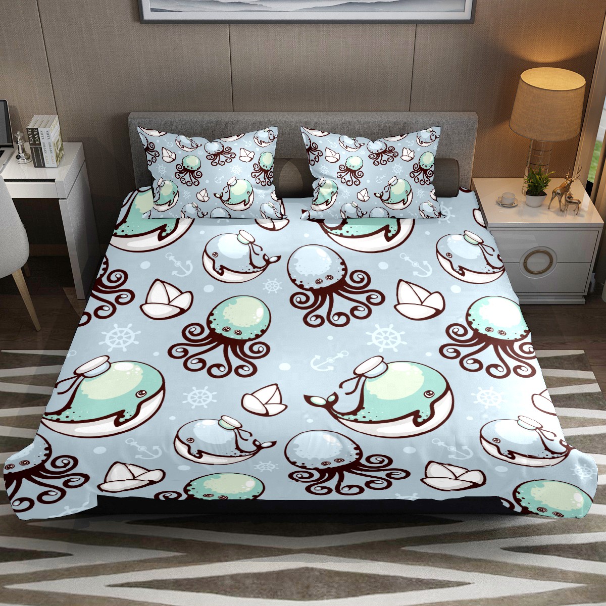 3 Piece Bedding Sets Cute Cartoon Dolphin Octopus Rudder Duvet Cover Set Twin Size 55'' x 79'' Comforter Set Home Decor for Bedroom Girls Boys Kid's Room with 2 Pillow Cases