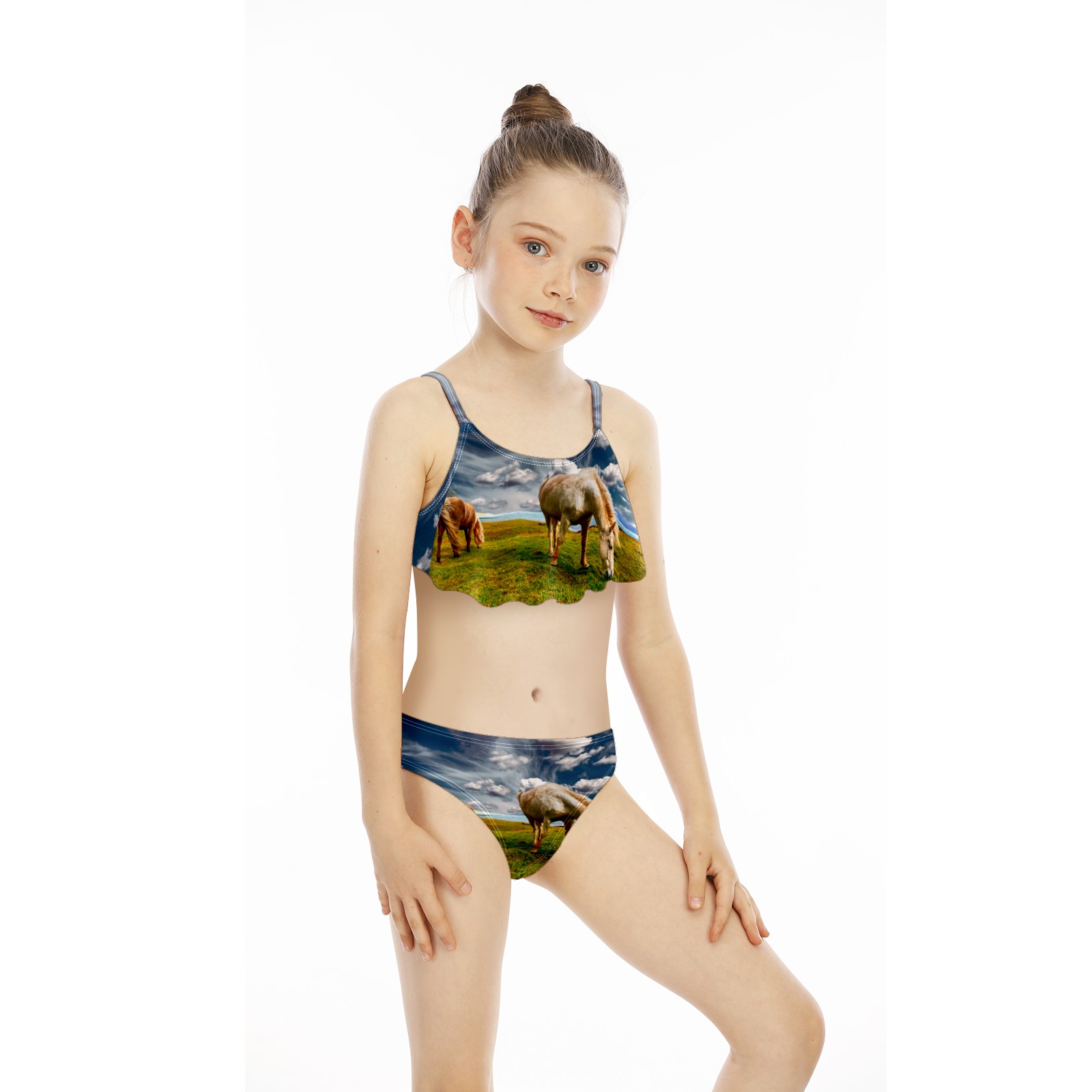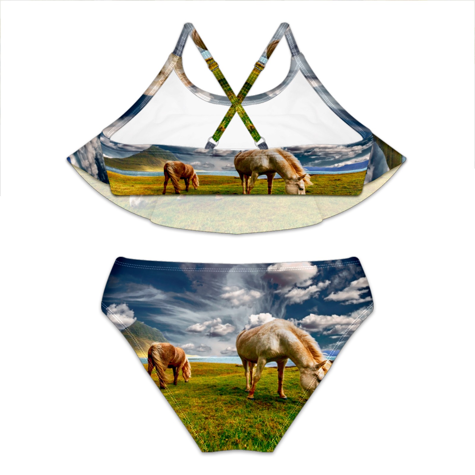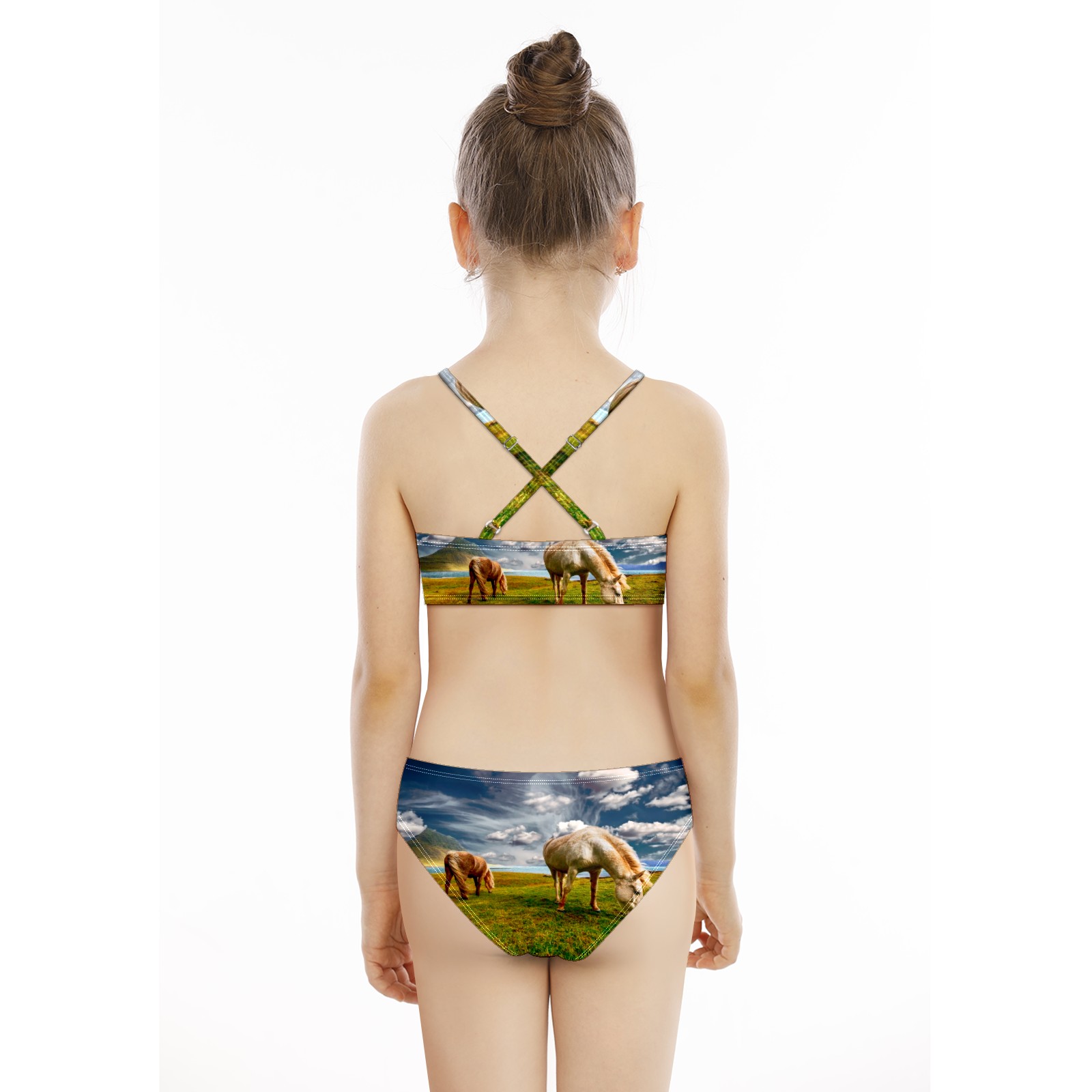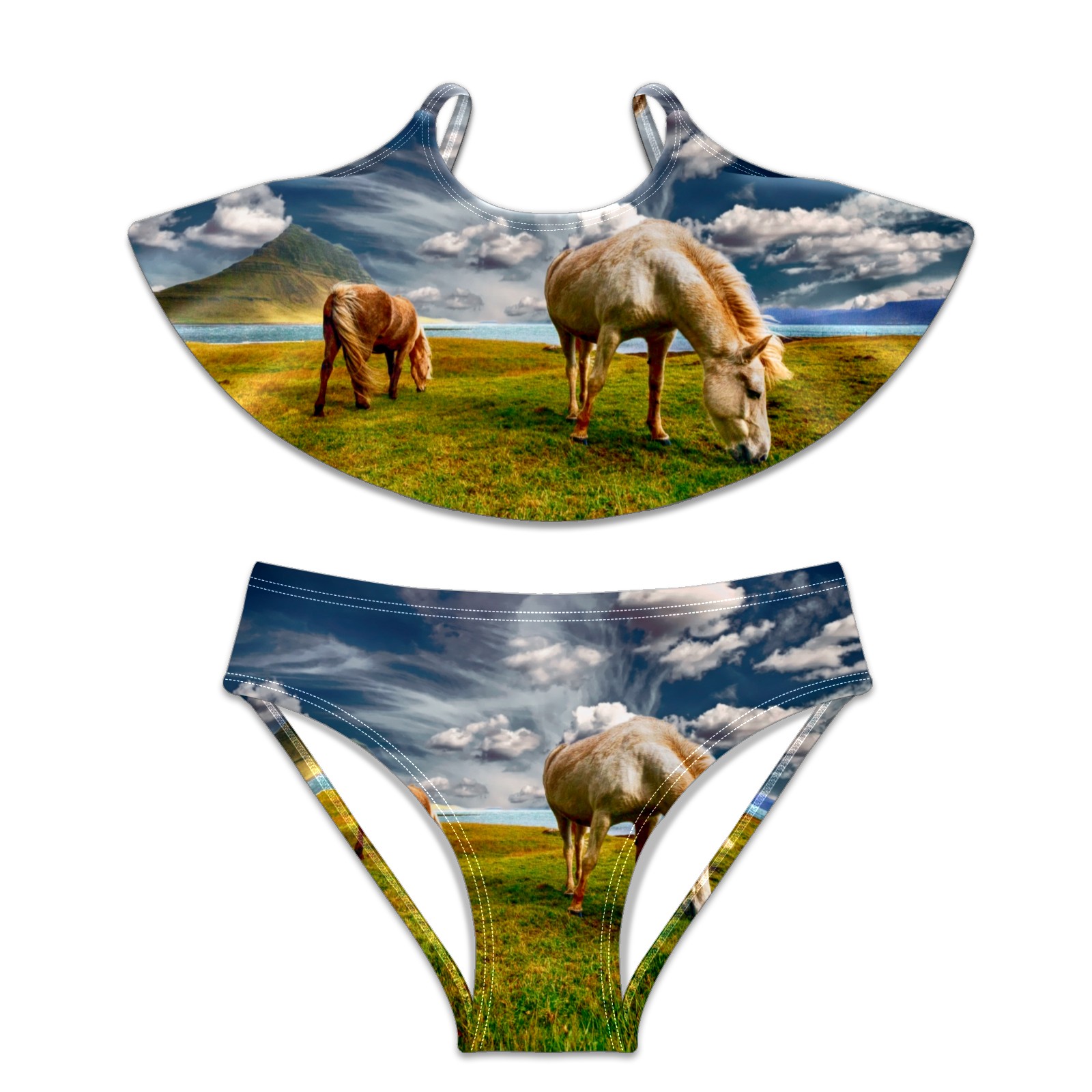 Swimsuits for Girls Two Pieces Bathing Suit Quick Dry Swimwear Grassland Horse Iceland Farm Blue Sky S