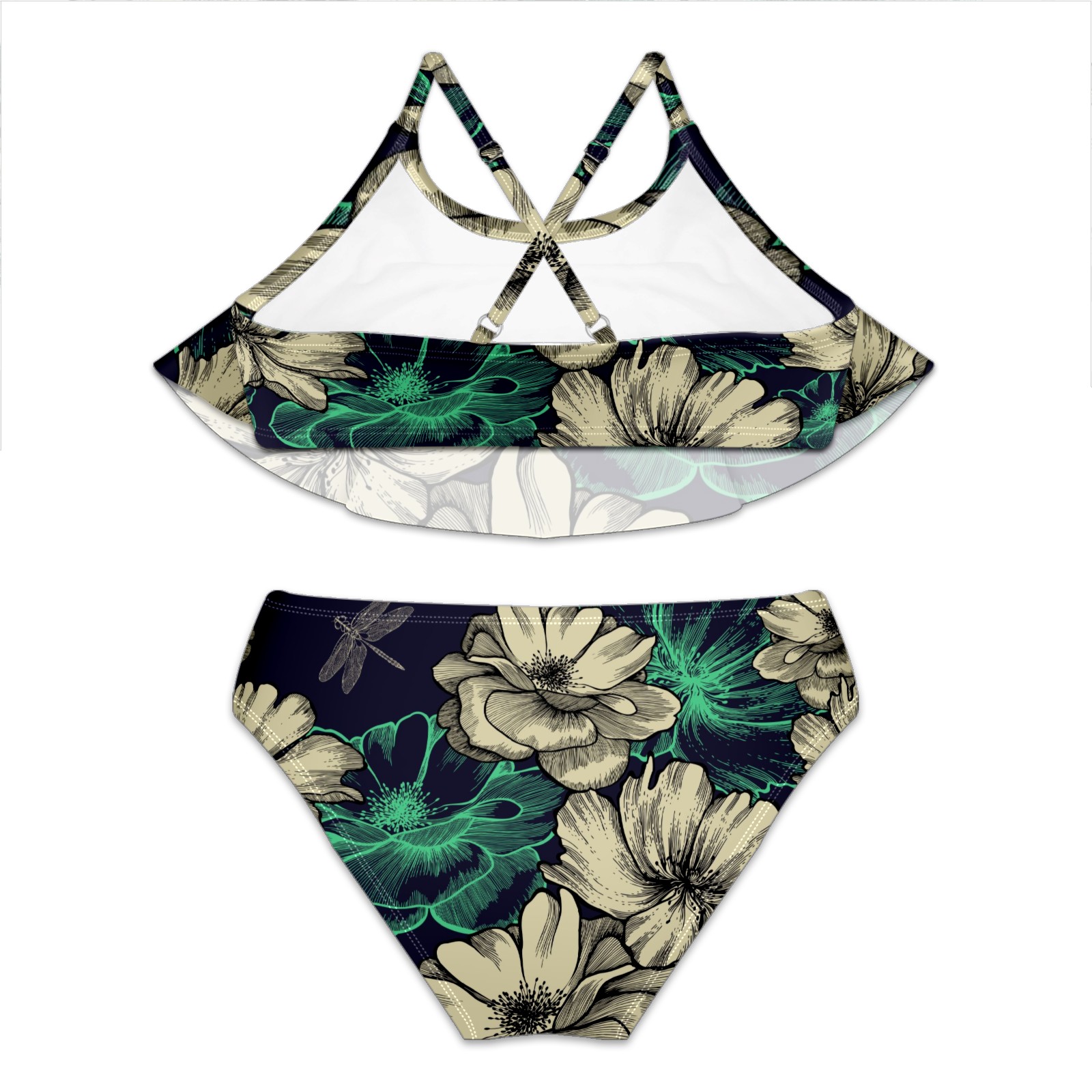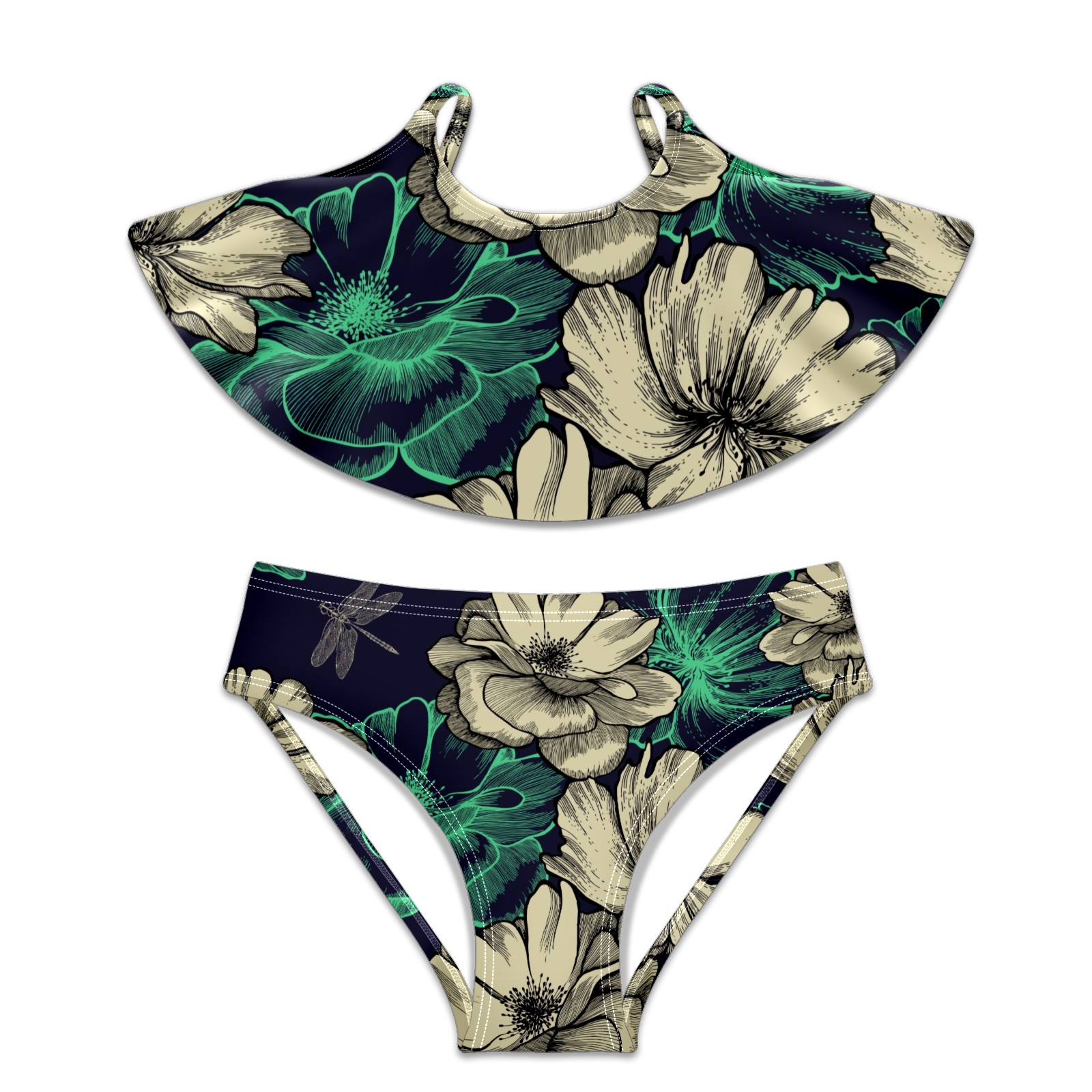 Swimsuits for Girls Two Pieces Bathing Suit Quick Dry Swimwear Retro Dragonfly Flower Green Yellow S