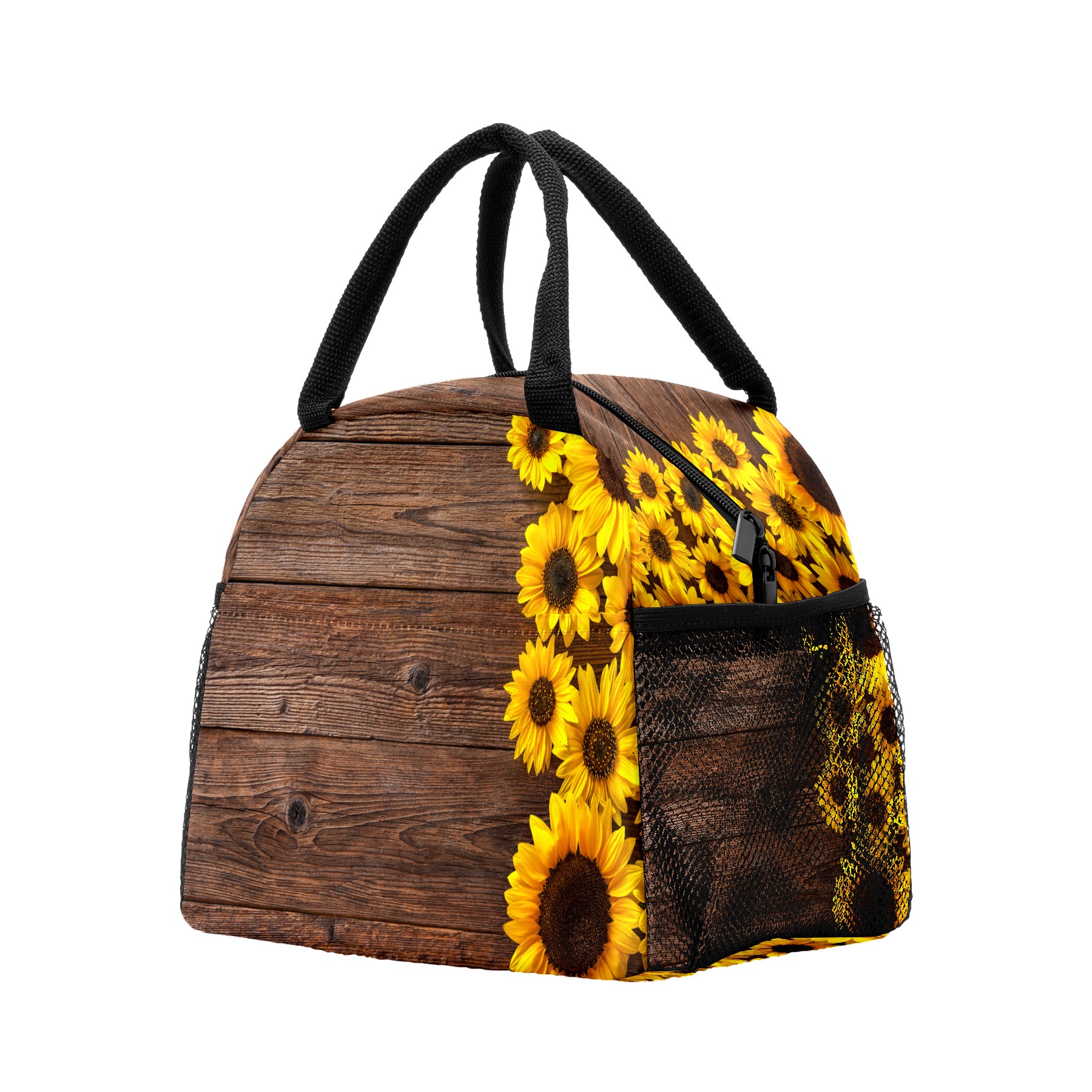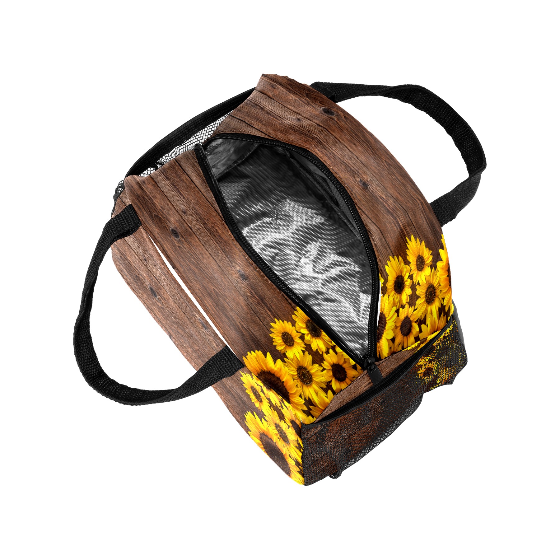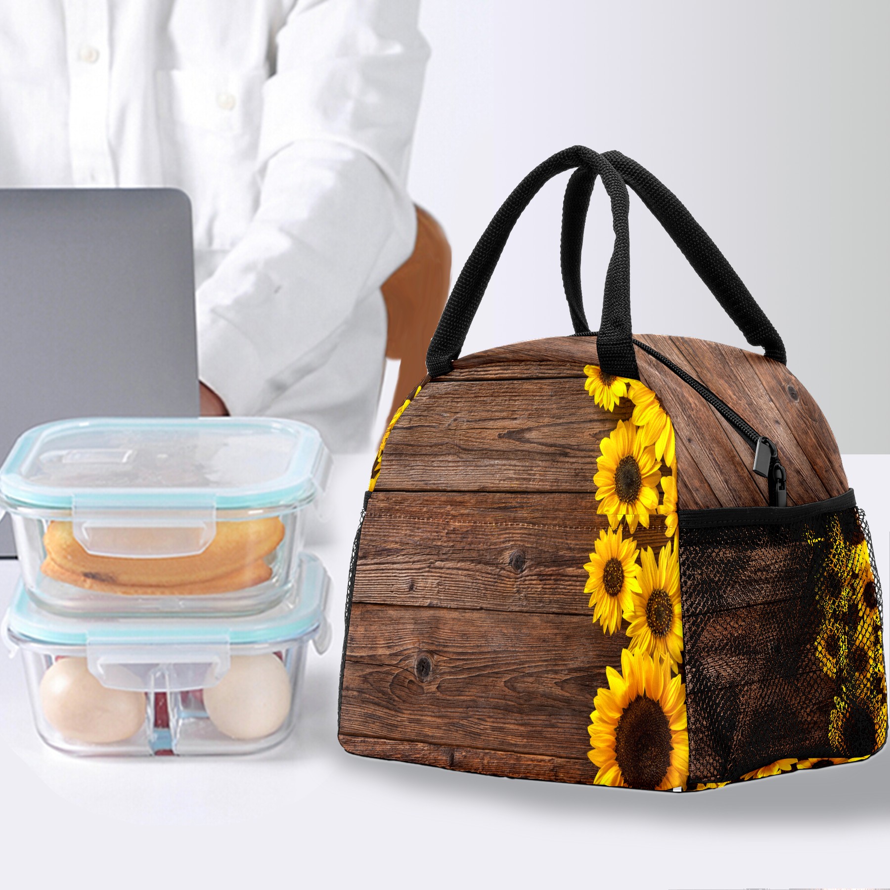 Lunch Bag for Women Men, Vintage Sunflower Blooming Retro Wood Insulated Reusable Lunch Box Thermal Cooler Tote Bag for Work Picnic Hiking Travel Beach