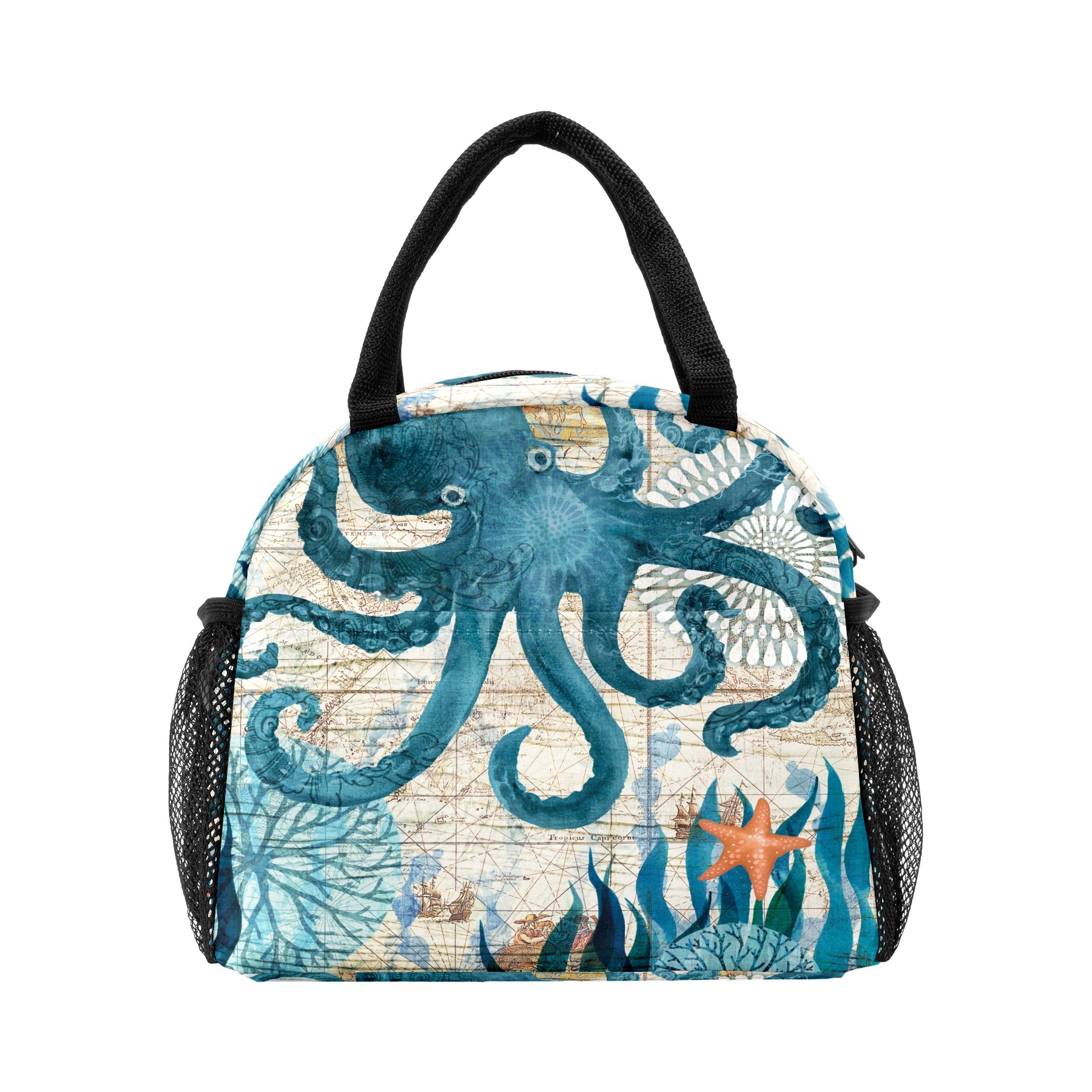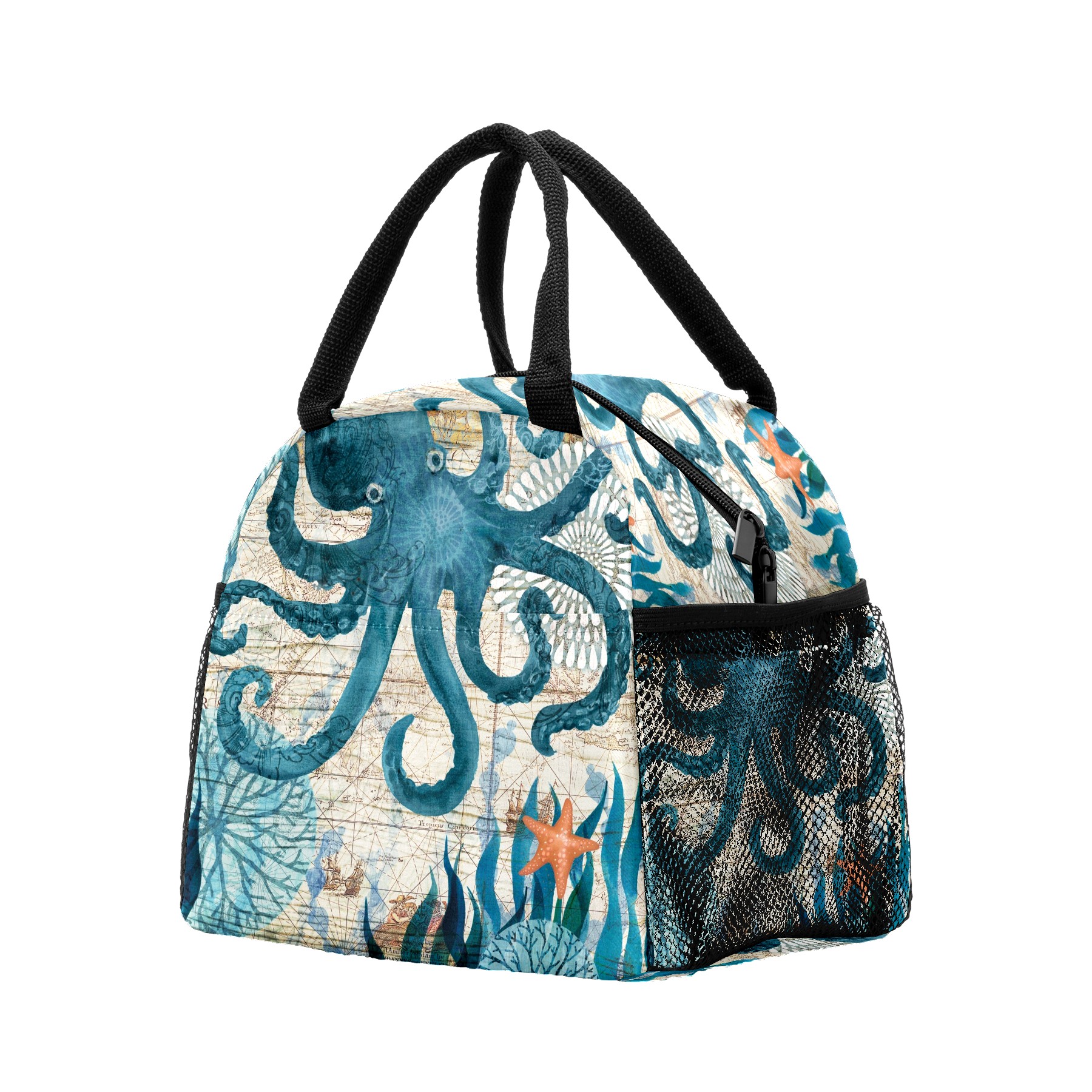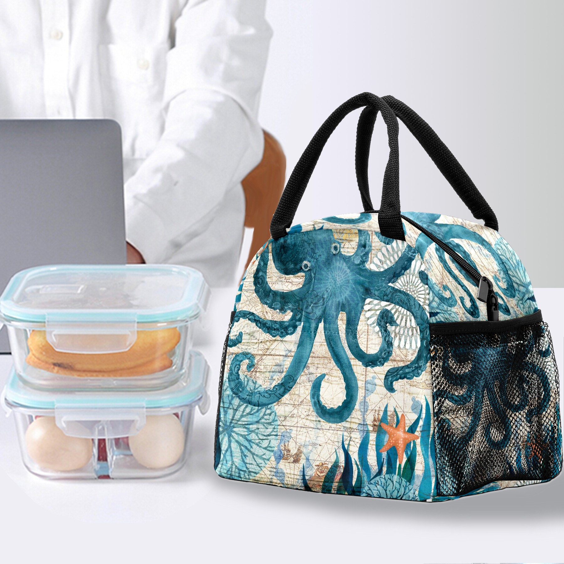 Lunch Bag for Women Men, Retro Octopus Nautical Map Blue Insulated Reusable Lunch Box Thermal Cooler Tote Bag for Work Picnic Hiking Travel Beach