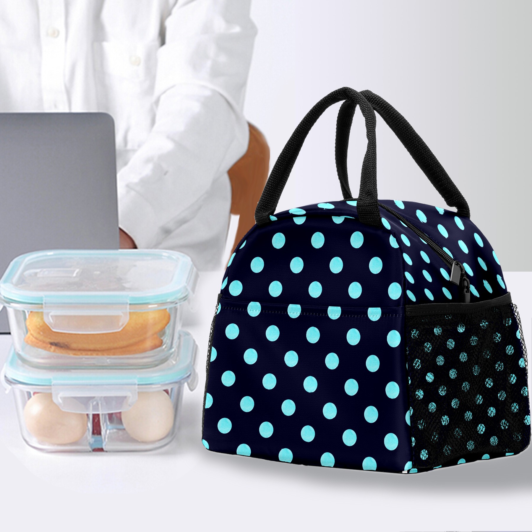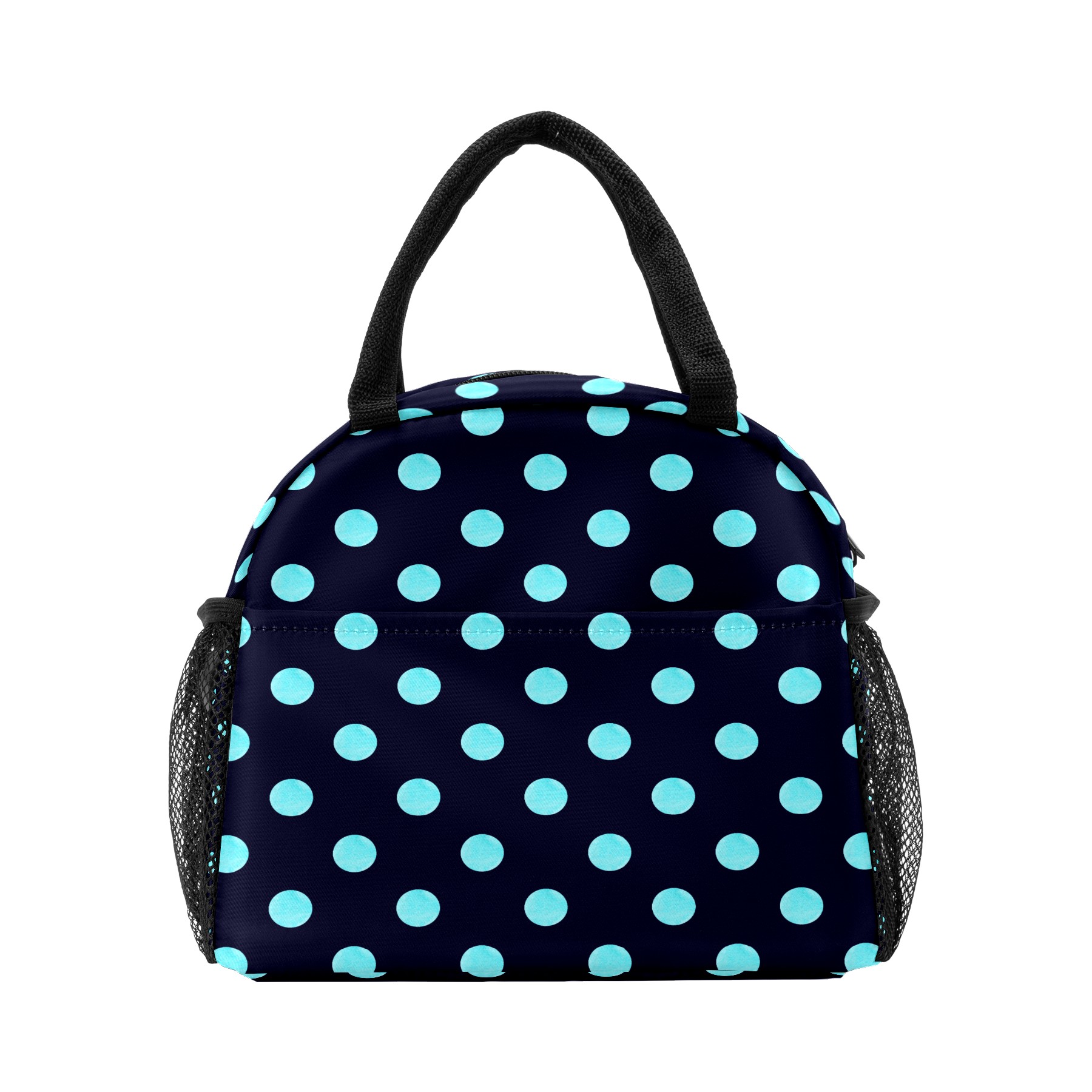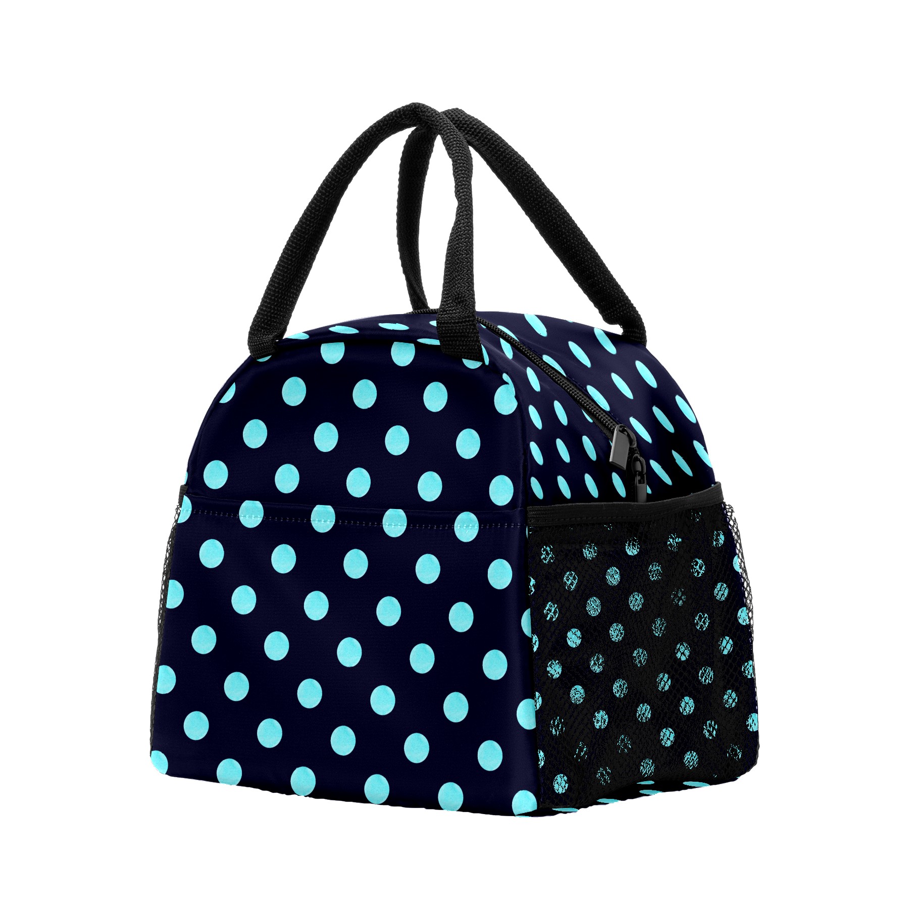 Lunch Bag for Women Men, Blue Black Polka Dot Insulated Reusable Lunch Box Thermal Cooler Tote Bag for Work Picnic Hiking Travel Beach