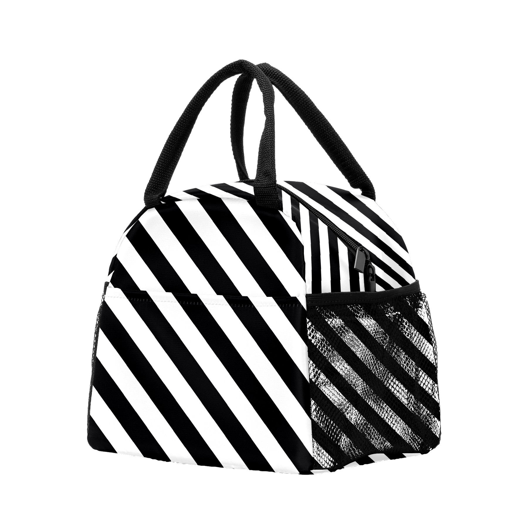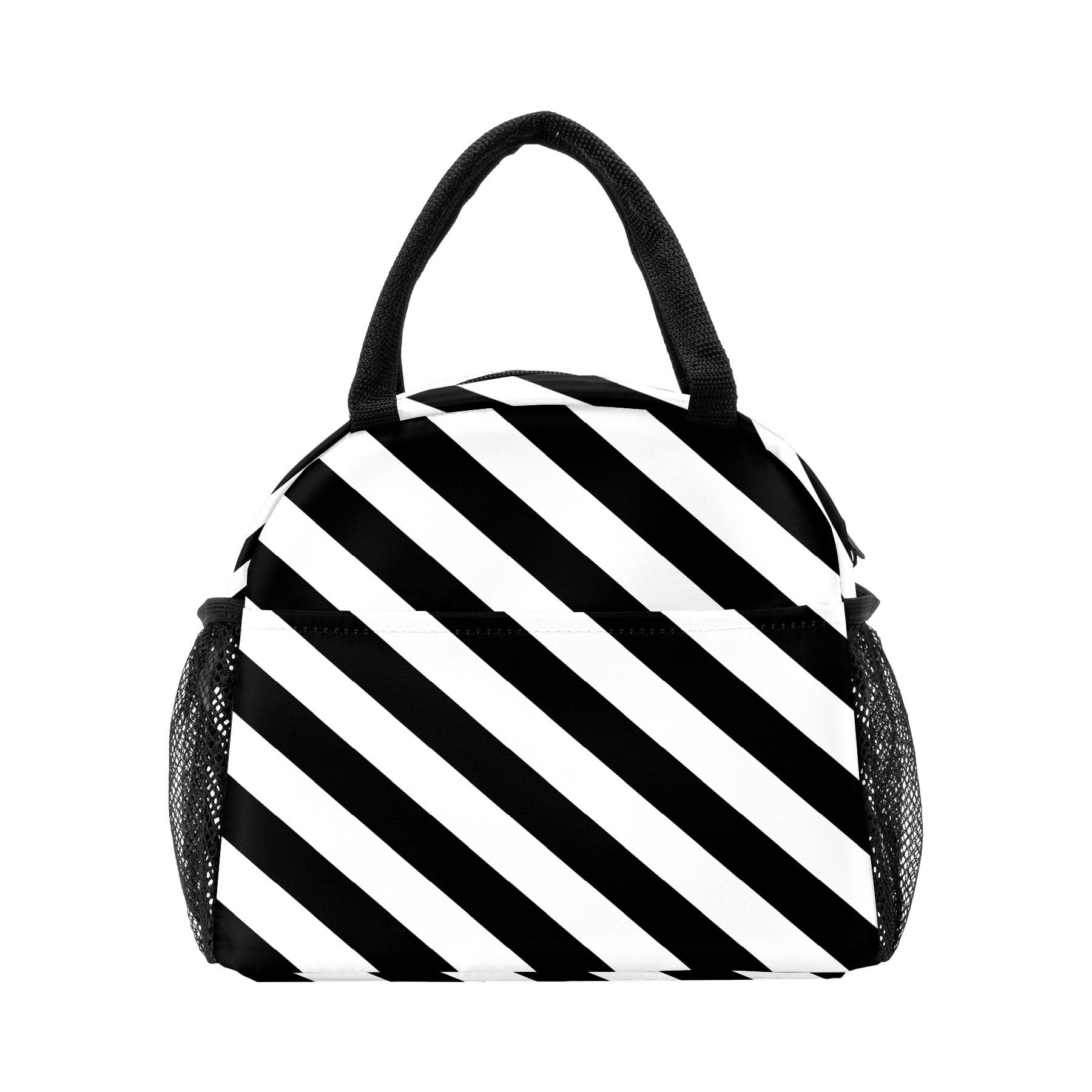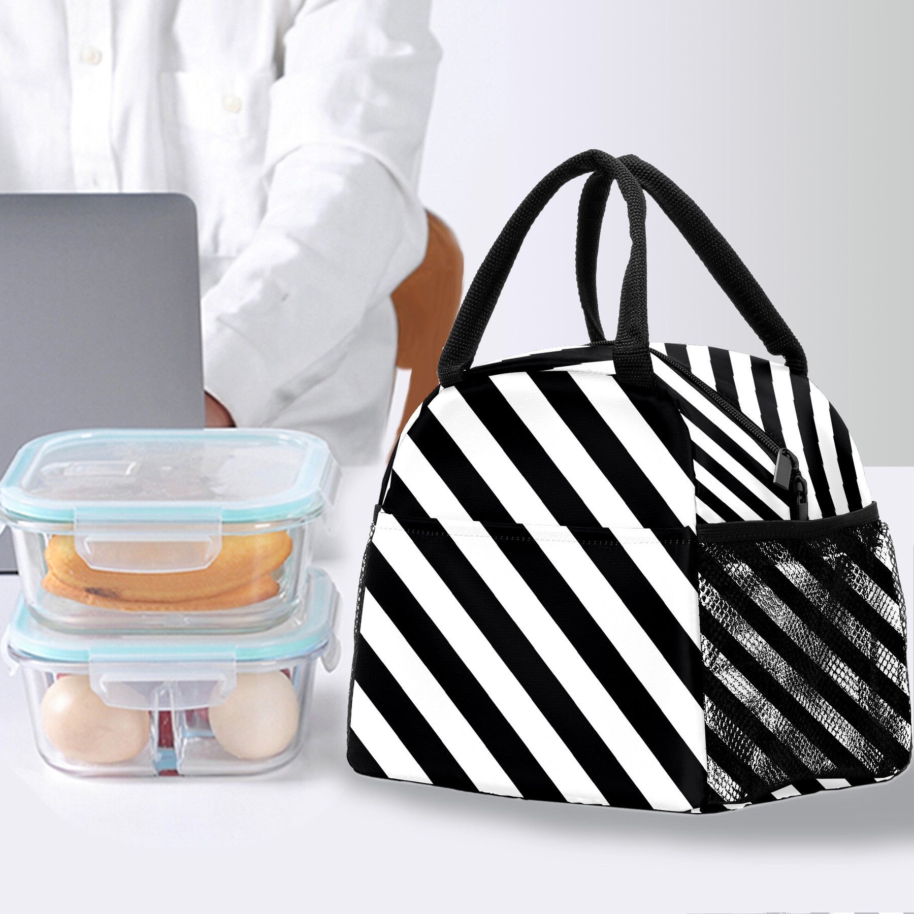 Lunch Bag for Women Men, Black White Stripe Insulated Reusable Lunch Box Thermal Cooler Tote Bag for Work Picnic Hiking Travel Beach