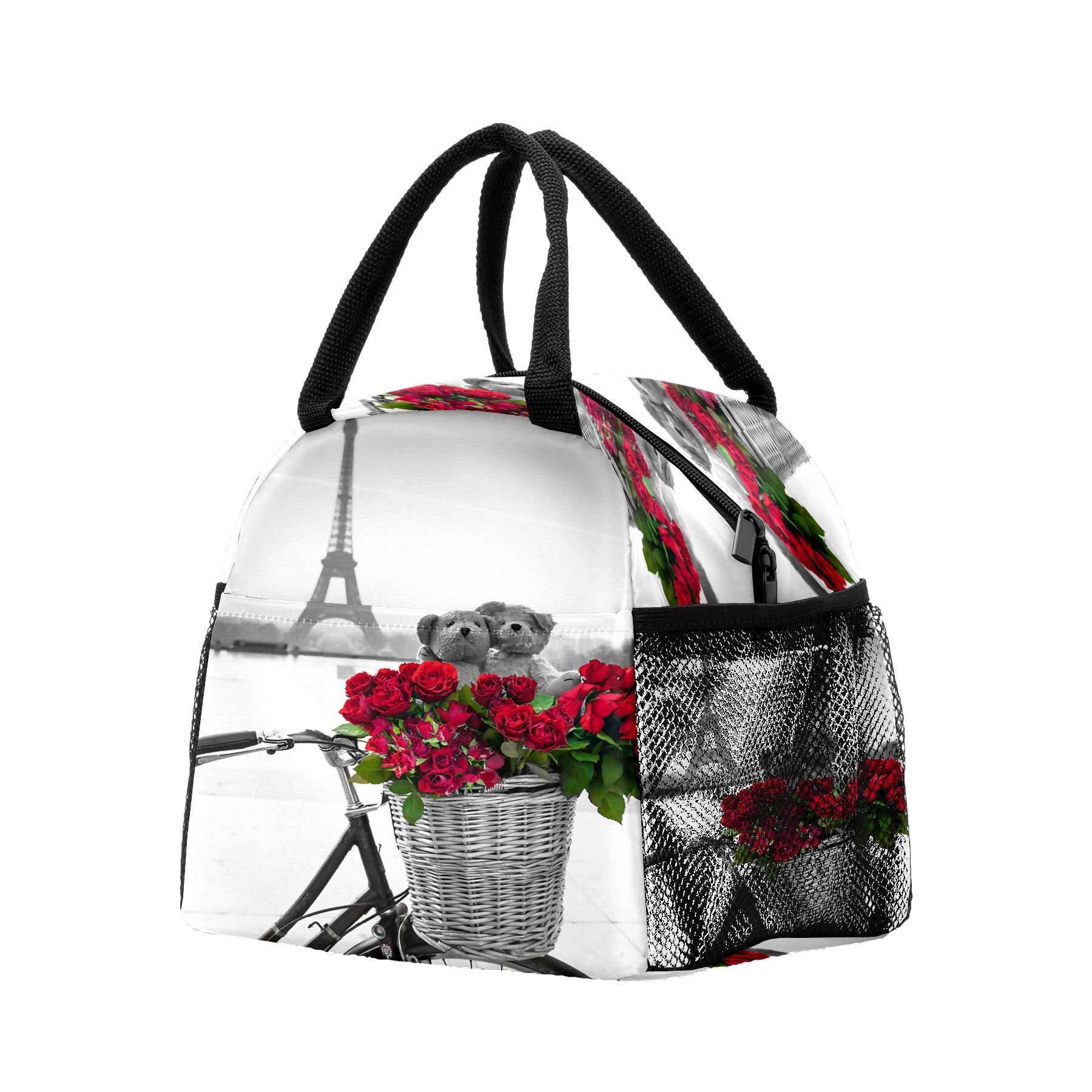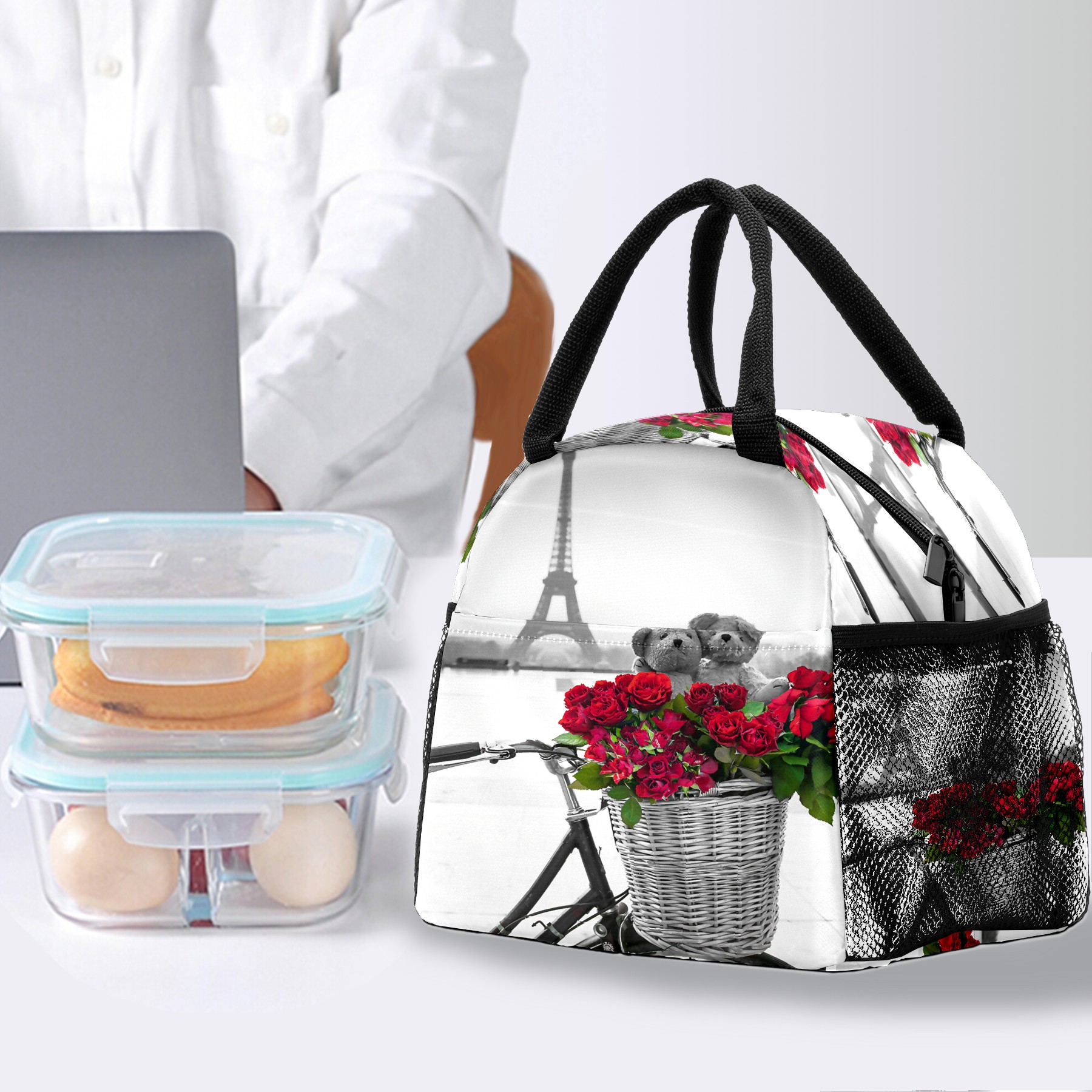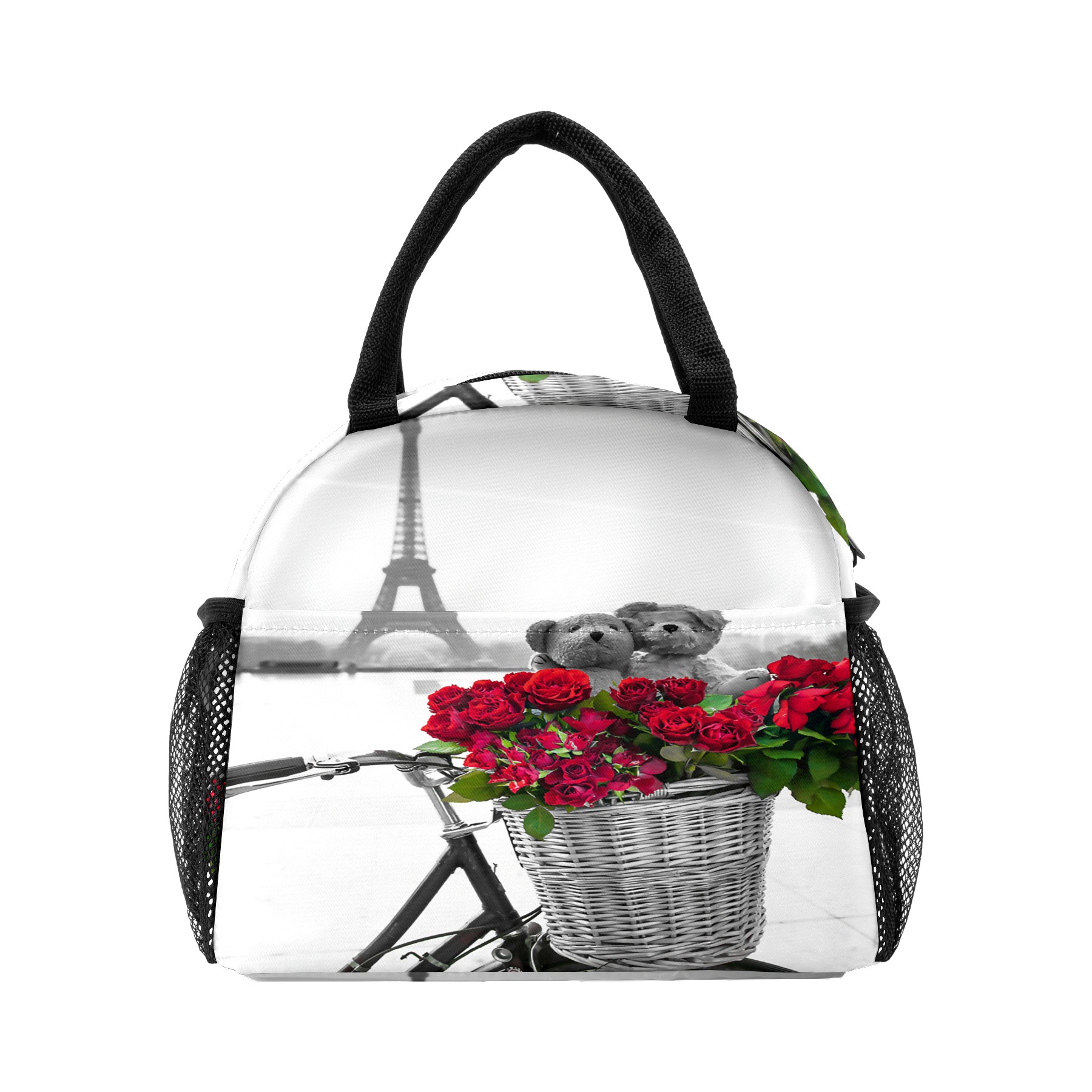 Lunch Bag for Women Men, Paris Eiffel Tower With Bike Rose Insulated Reusable Lunch Box Thermal Cooler Tote Bag for Work Picnic Hiking Travel Beach