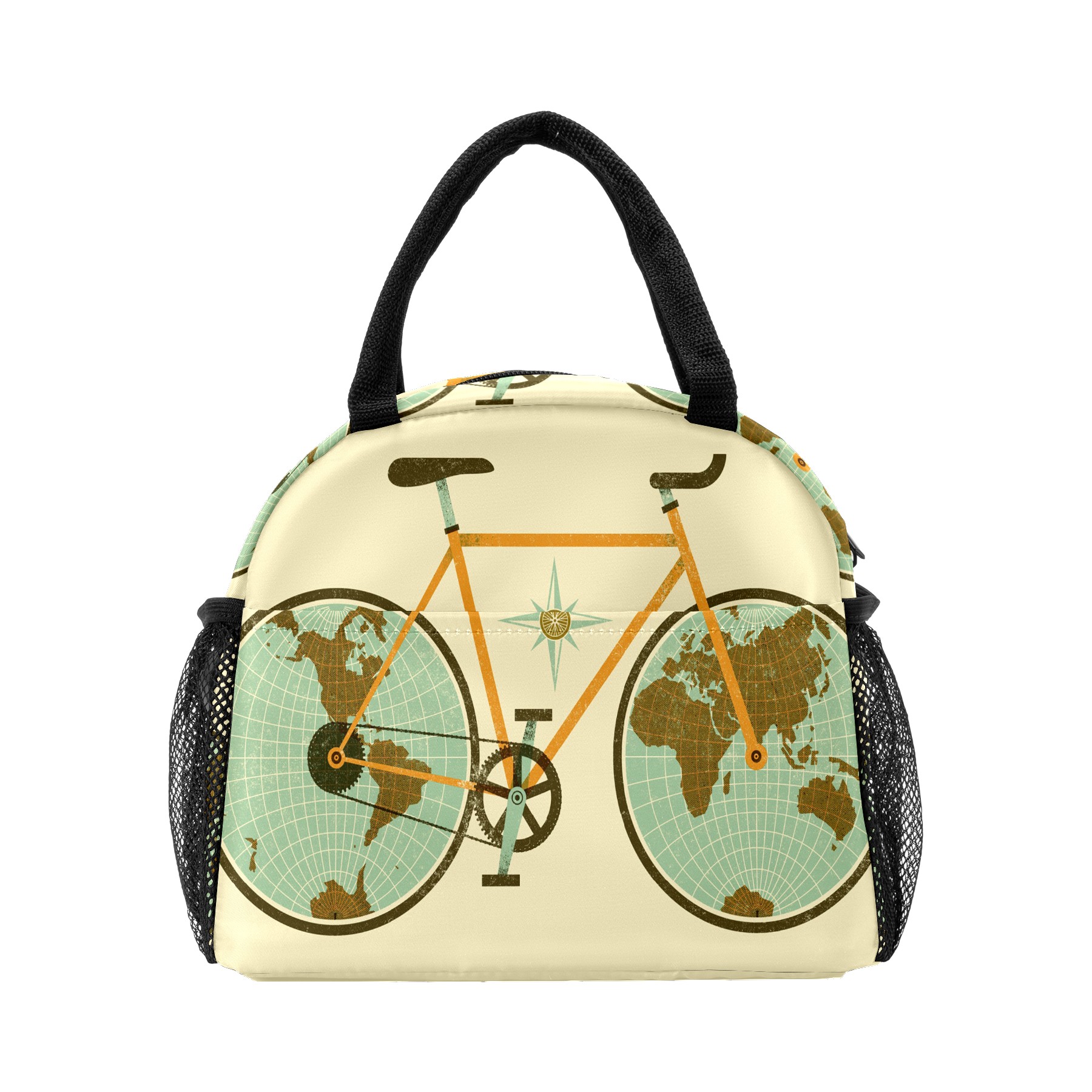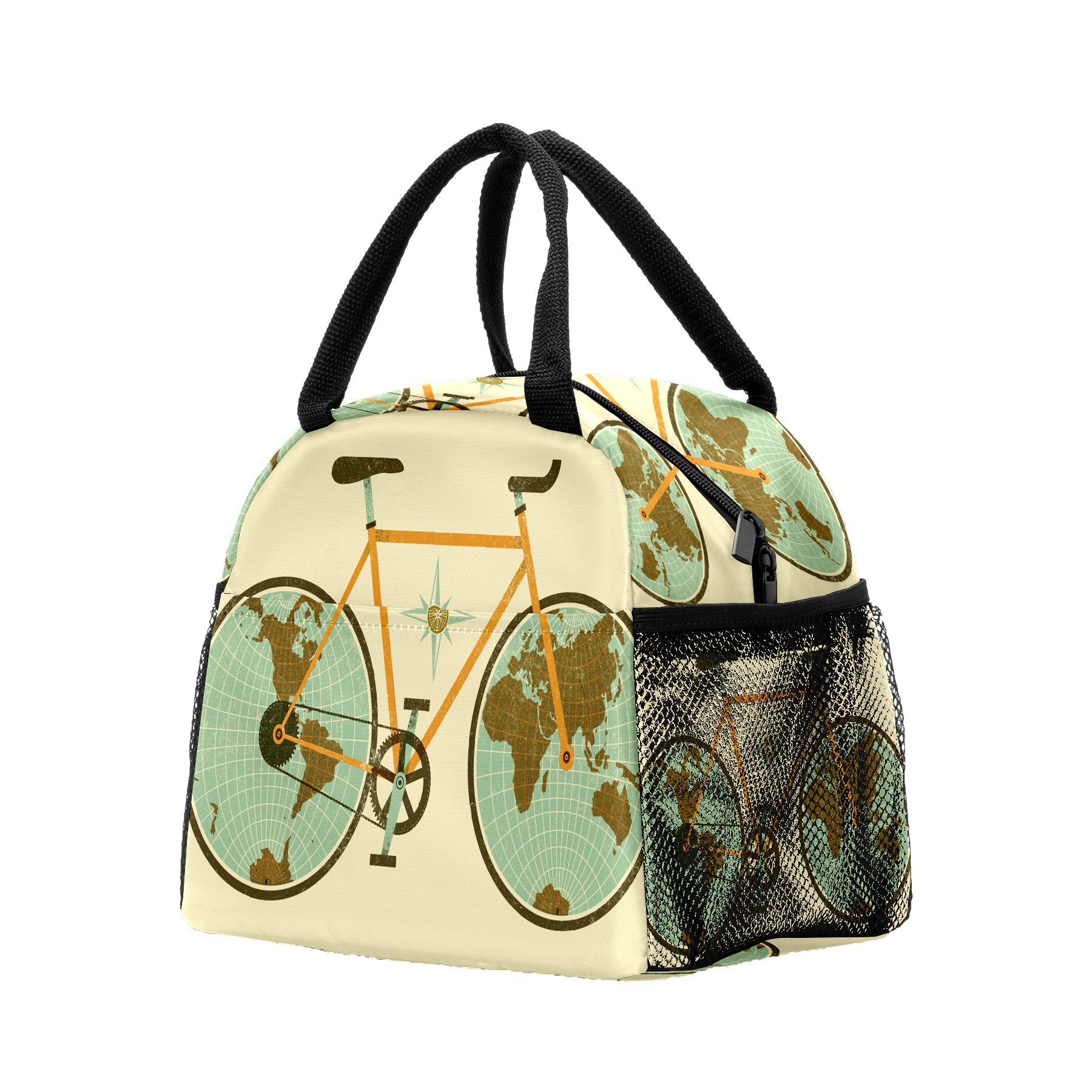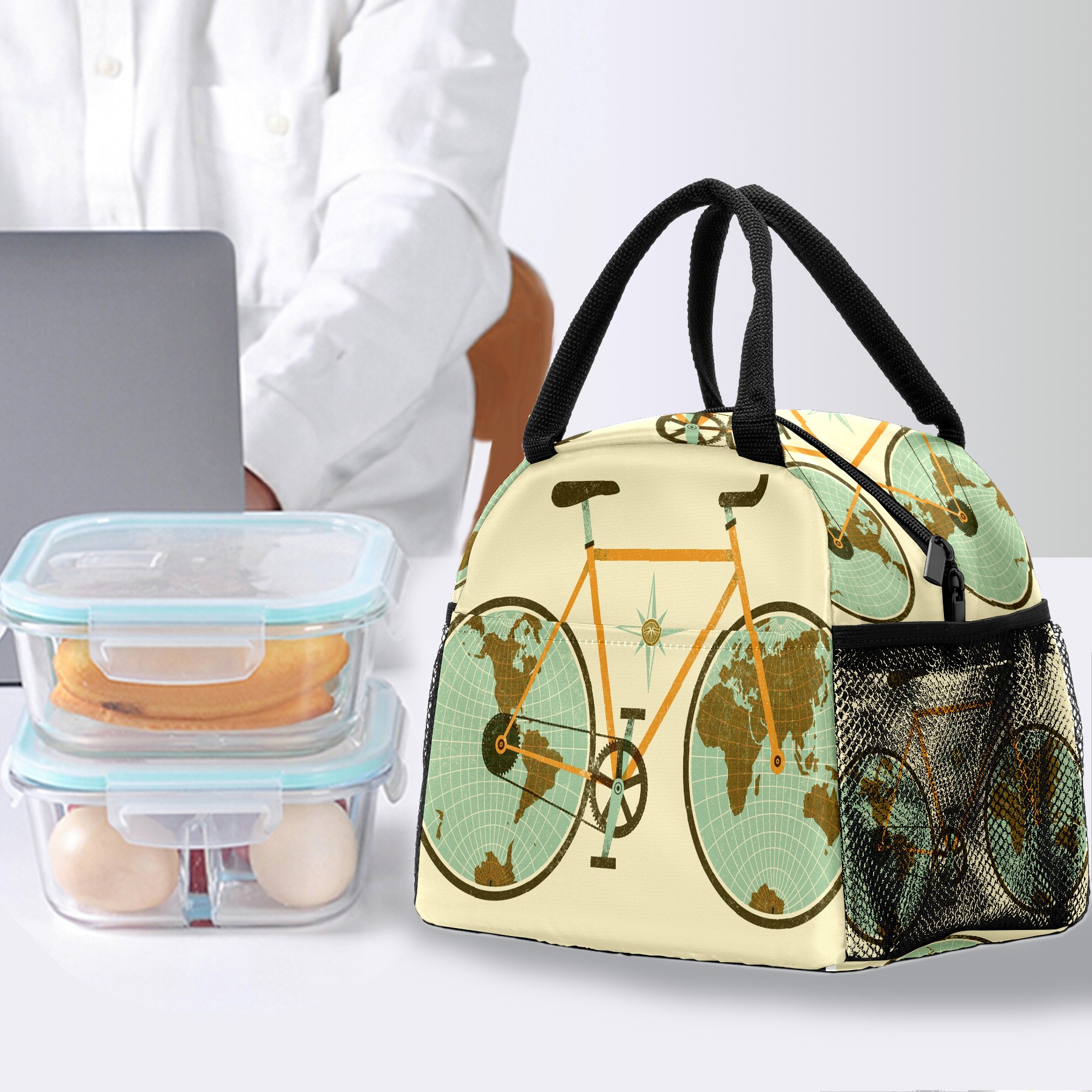 Lunch Bag for Women Men, Funny Retro World Map With Bike Insulated Reusable Lunch Box Thermal Cooler Tote Bag for Work Picnic Hiking Travel Beach