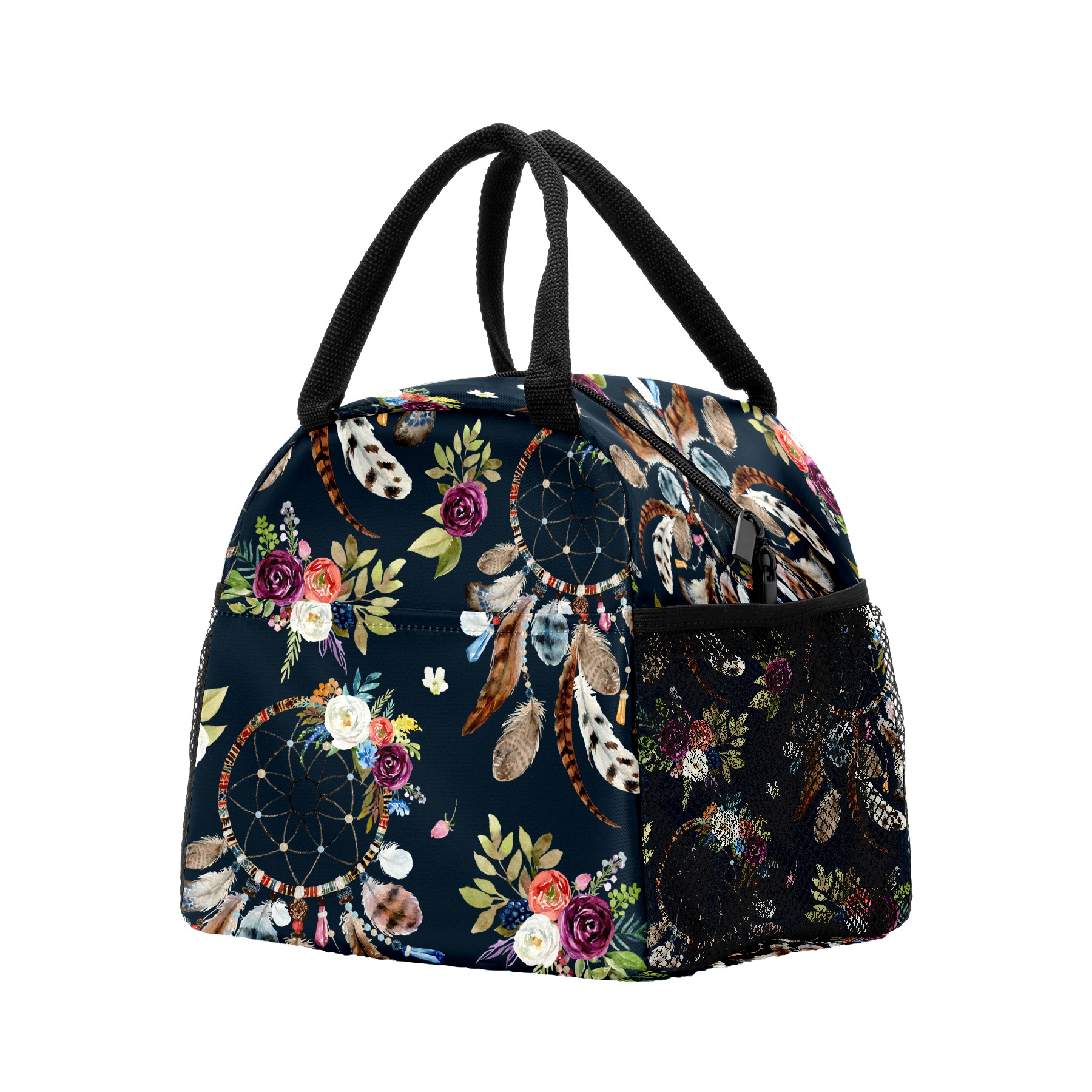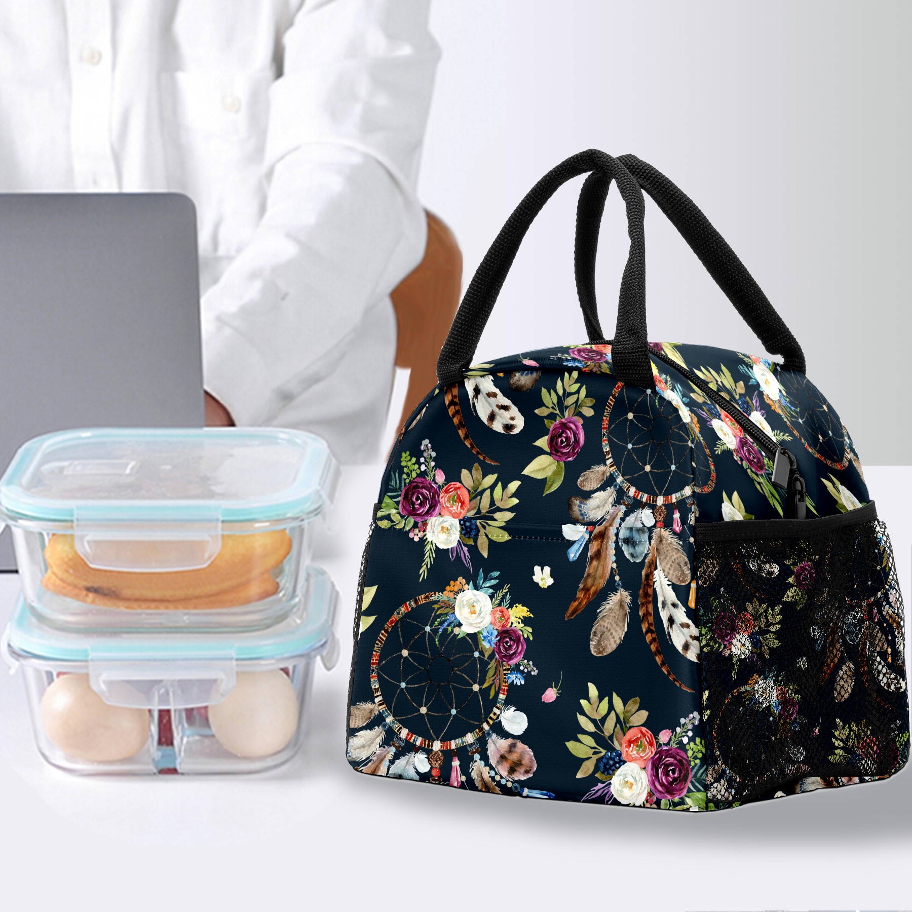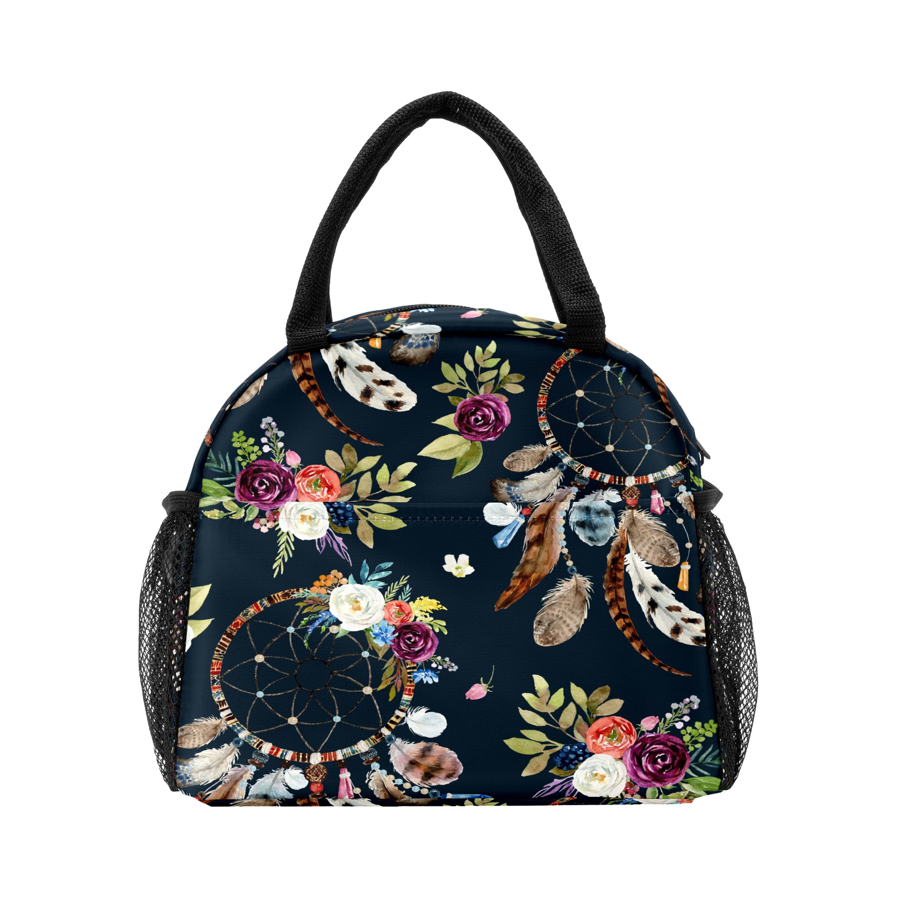 Lunch Bag for Women Men, Vintage Ethnic Dreamcather Feather Floral Insulated Reusable Lunch Box Thermal Cooler Tote Bag for Work Picnic Hiking Travel Beach