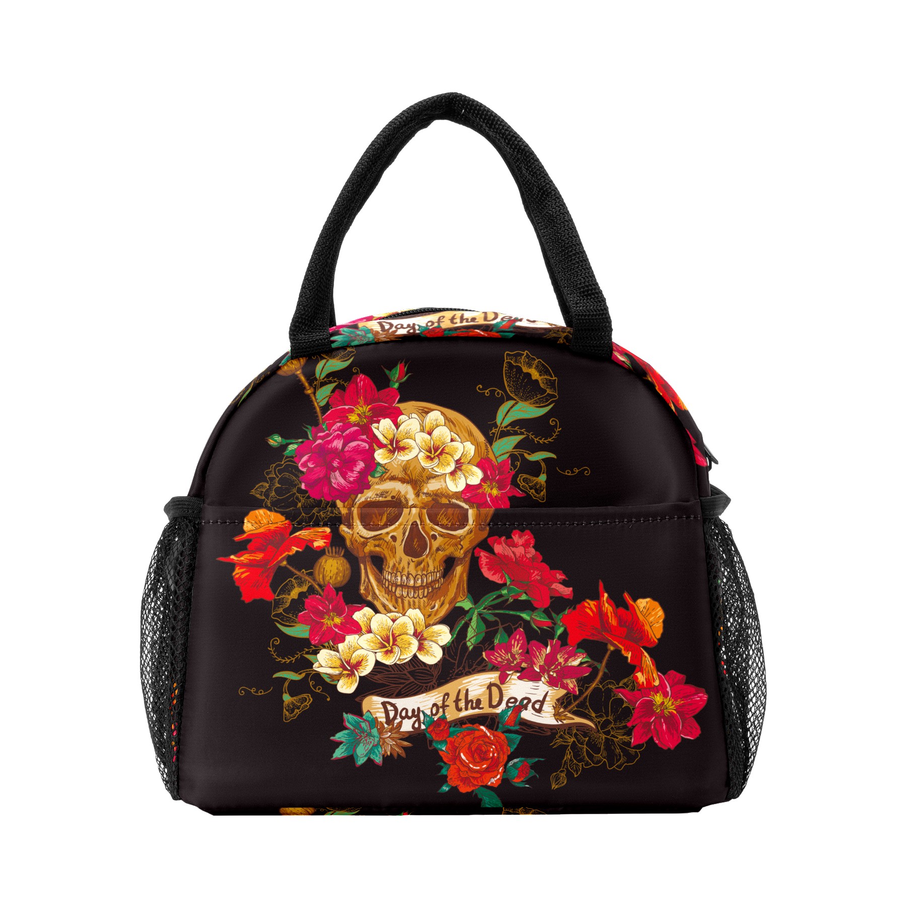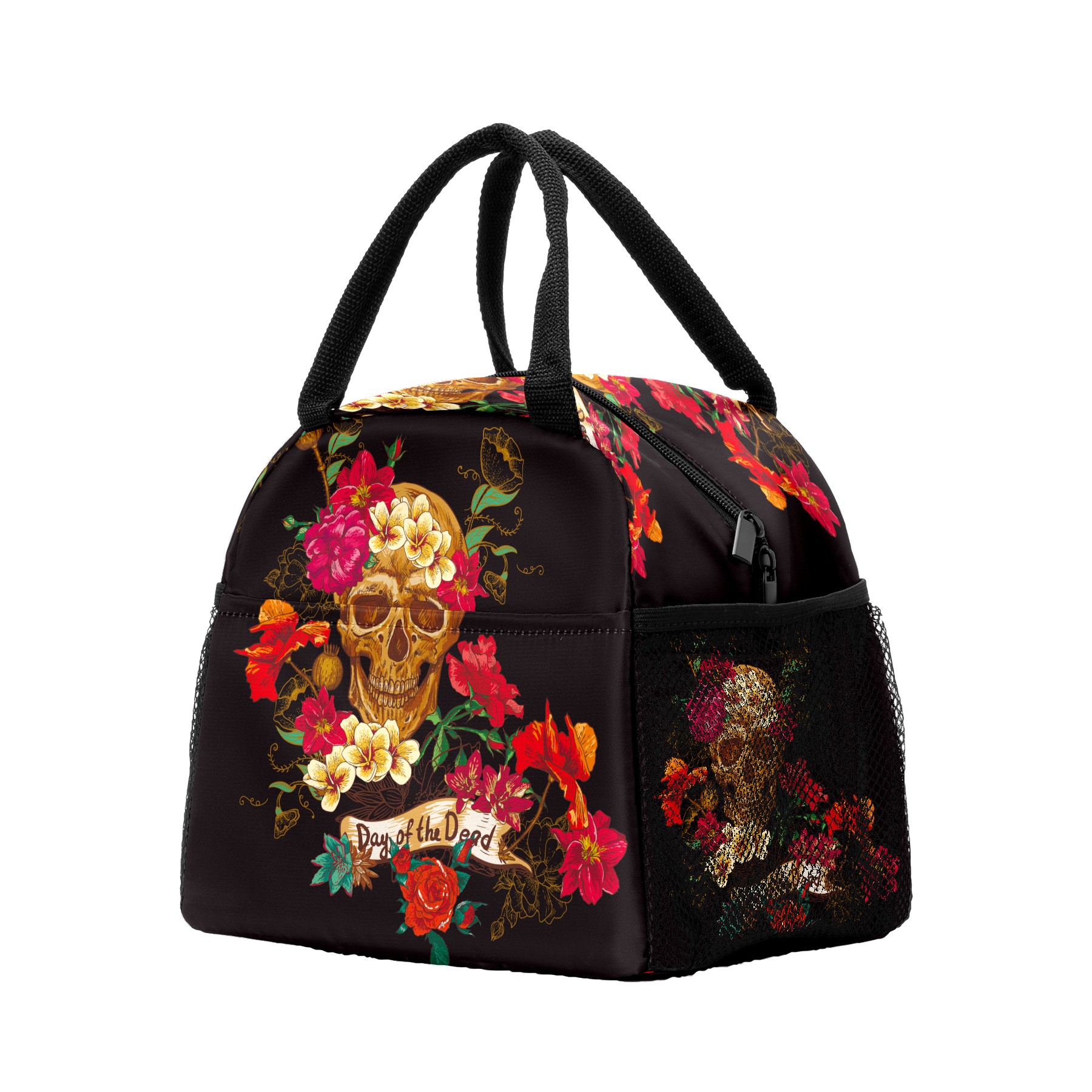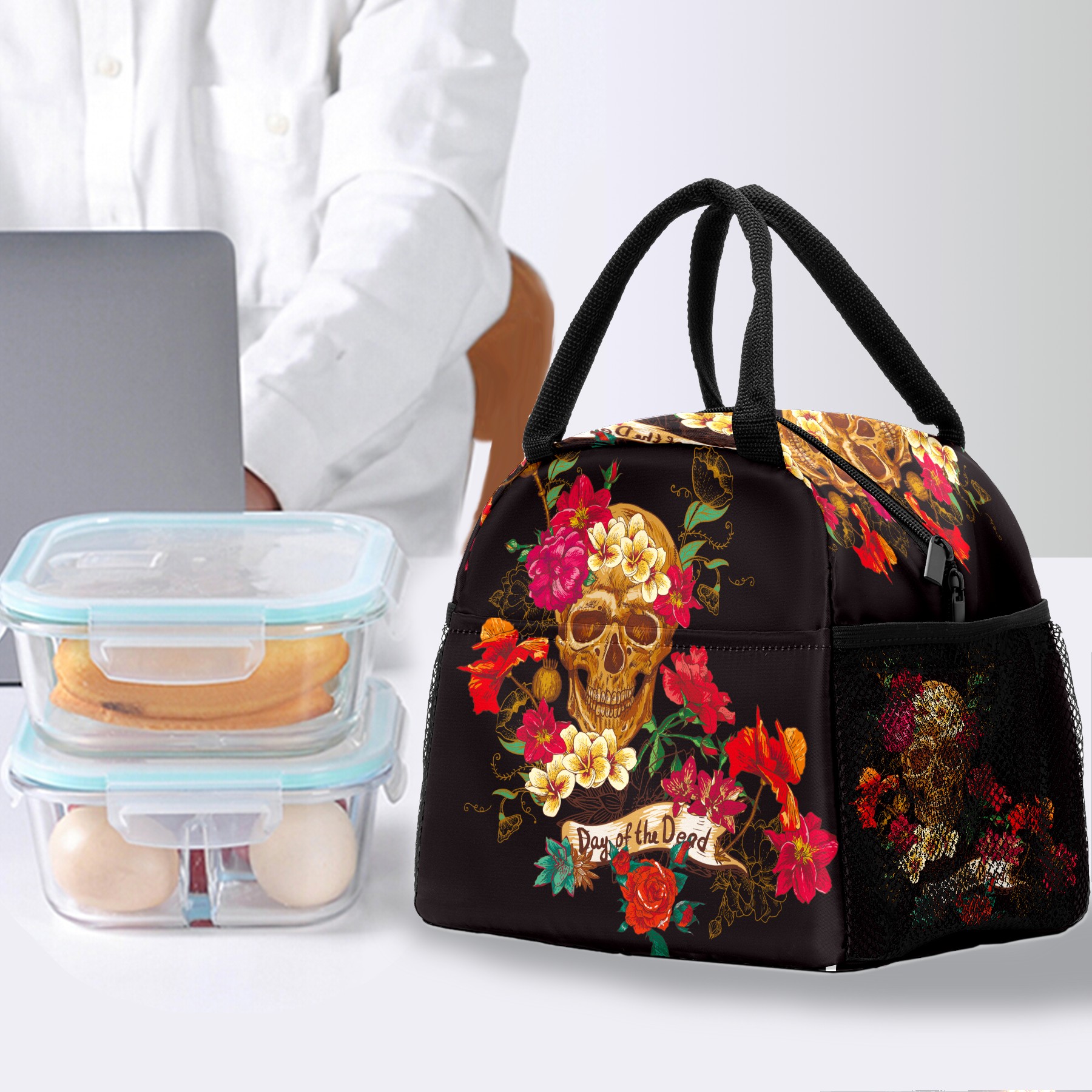 Lunch Bag for Women Men, Day Of The Dead Sugar Skull Flower Insulated Reusable Lunch Box Thermal Cooler Tote Bag for Work Picnic Hiking Travel Beach
