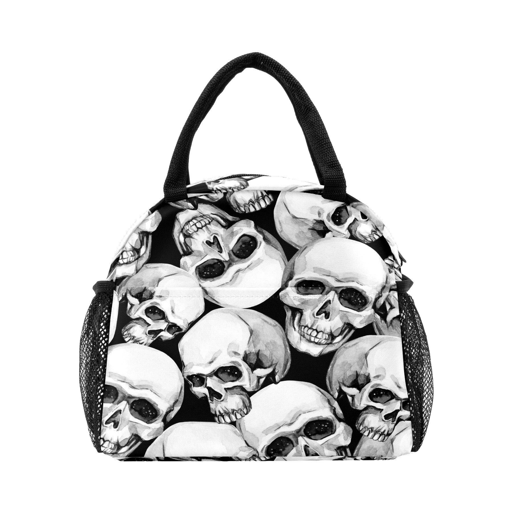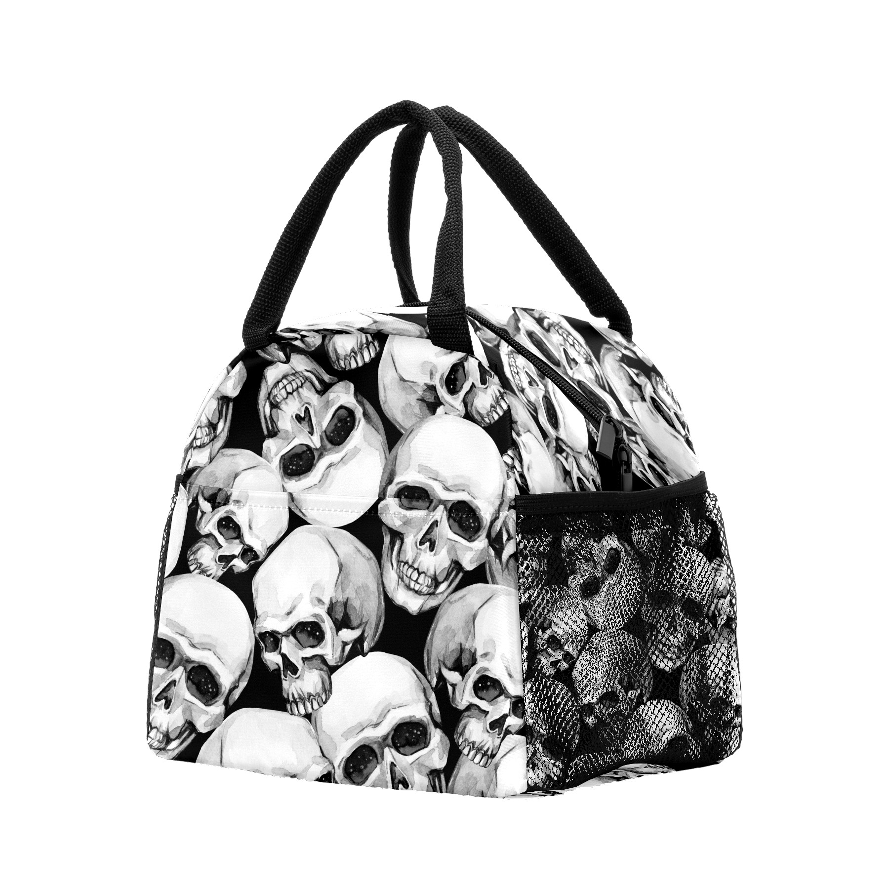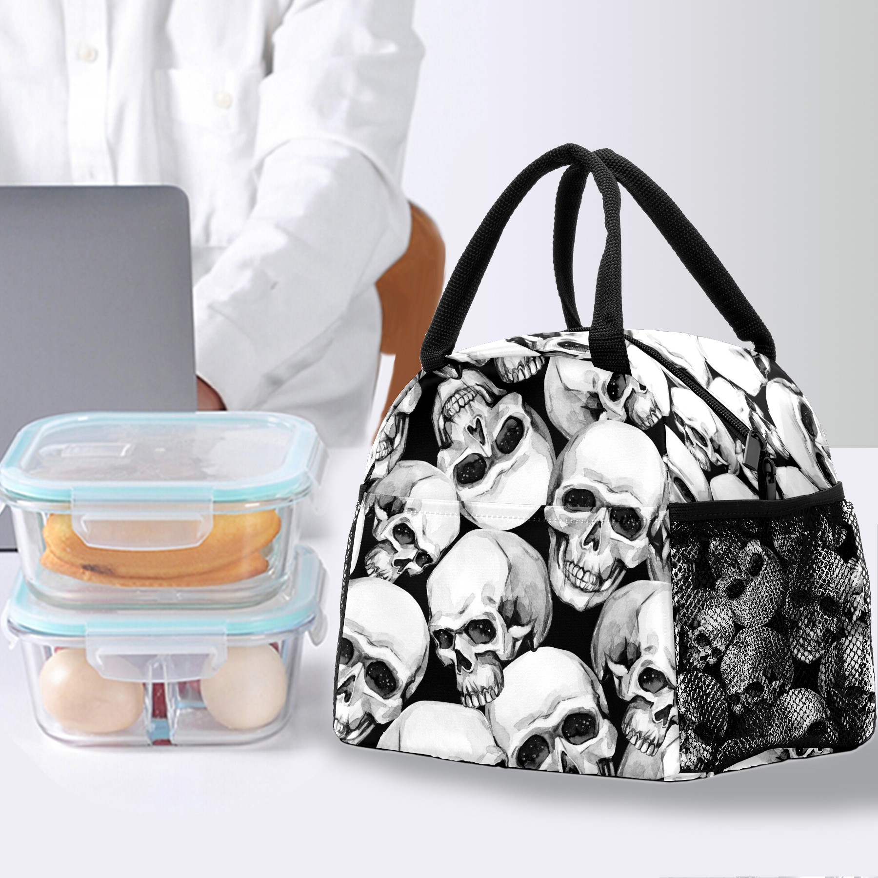 Lunch Bag for Women Men, Black White Skull Pattern Insulated Reusable Lunch Box Thermal Cooler Tote Bag for Work Picnic Hiking Travel Beach