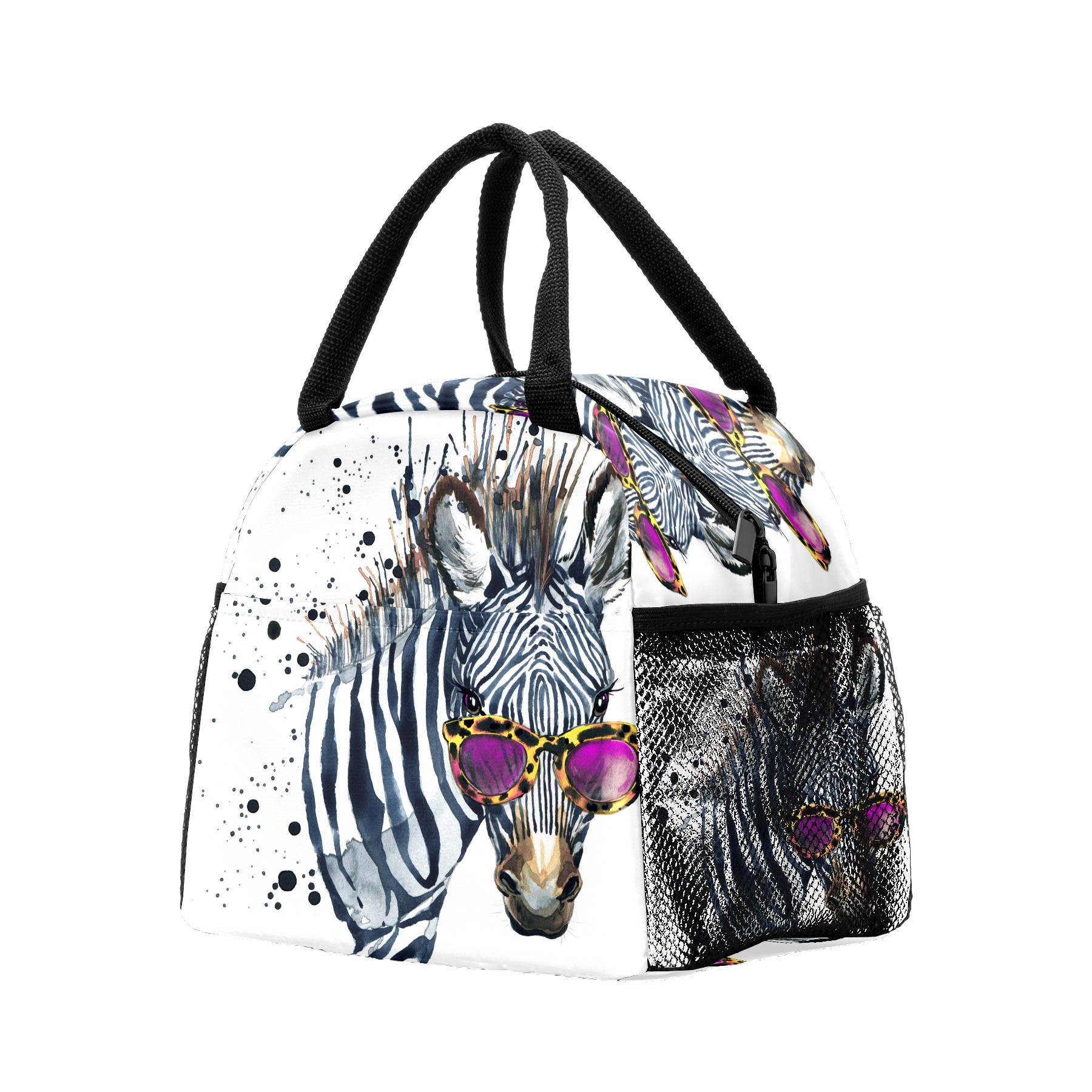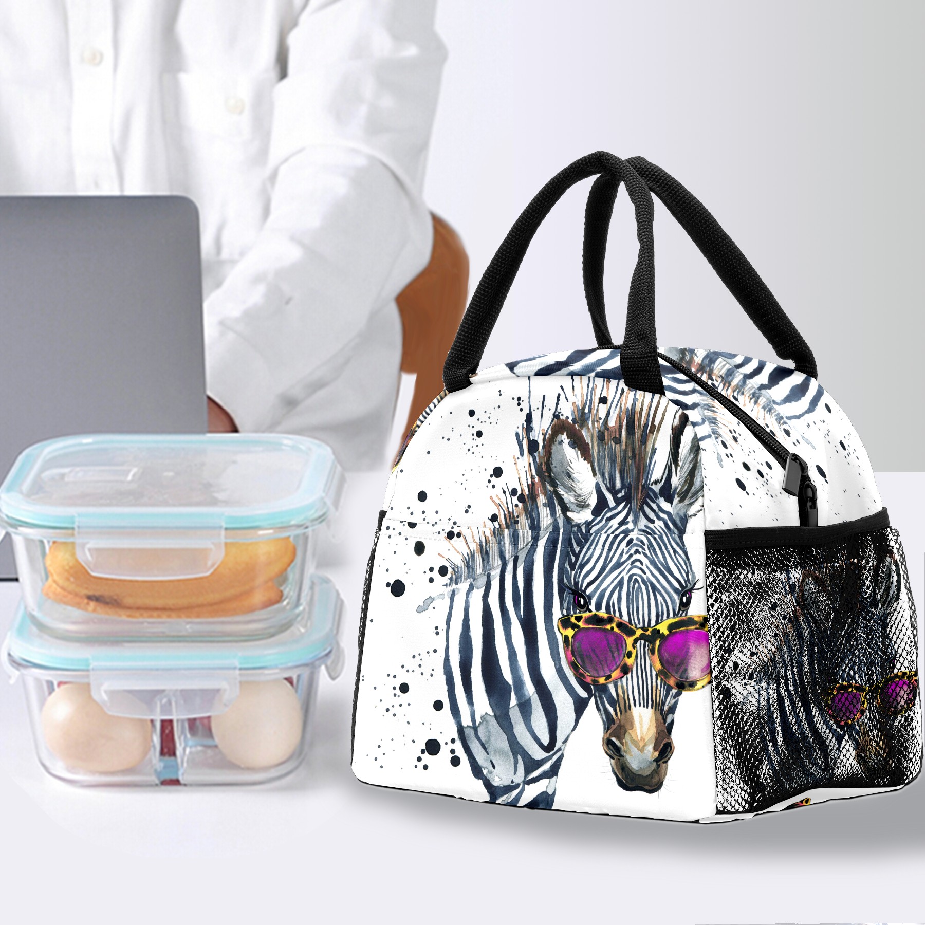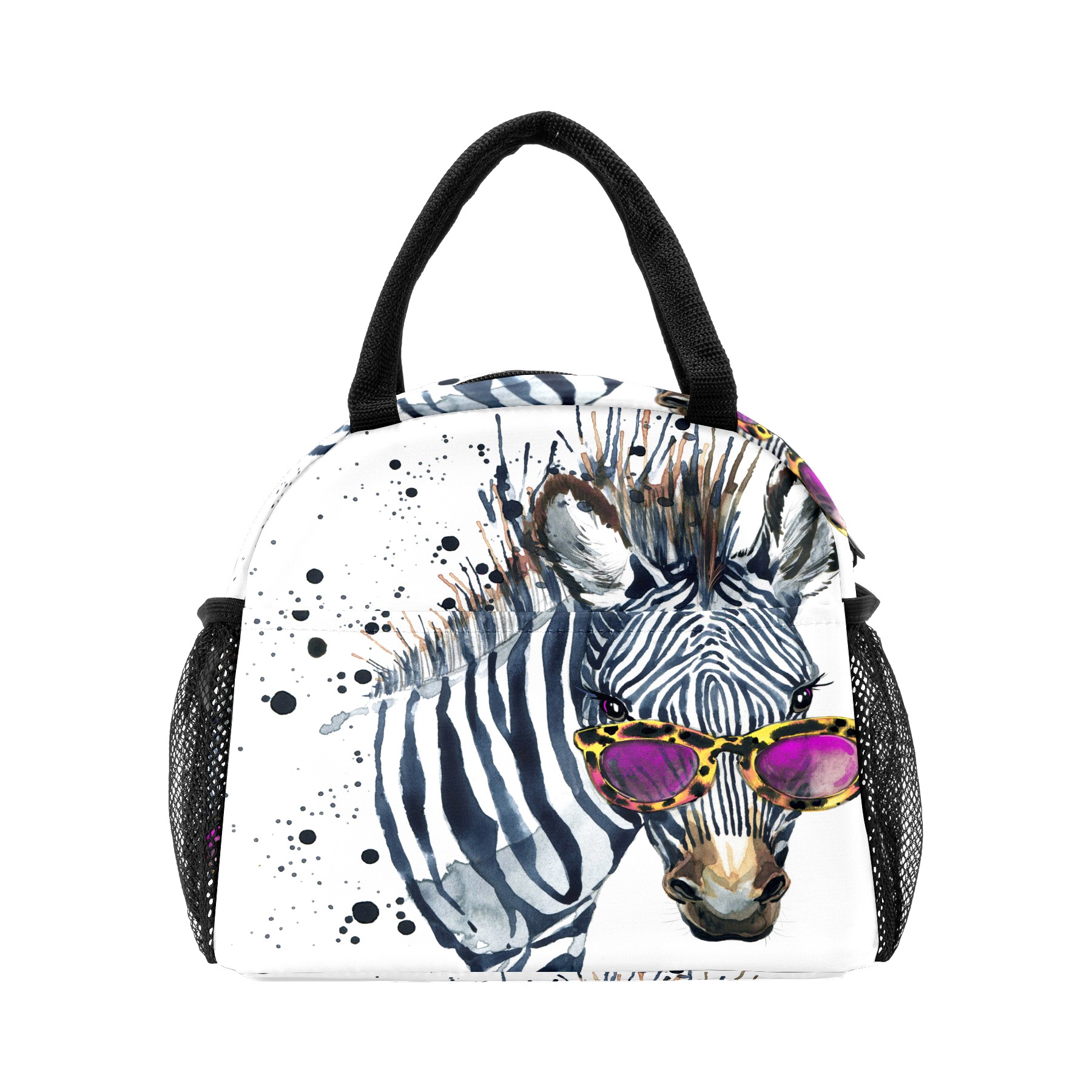 Lunch Bag for Women Men, Watercolor Hipster Zebra With Glasses Insulated Reusable Lunch Box Thermal Cooler Tote Bag for Work Picnic Hiking Travel Beach