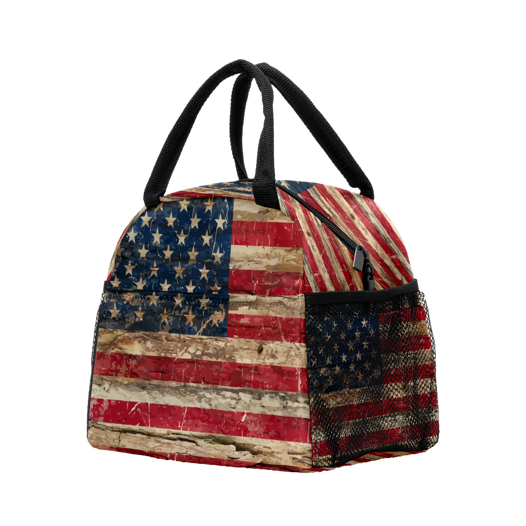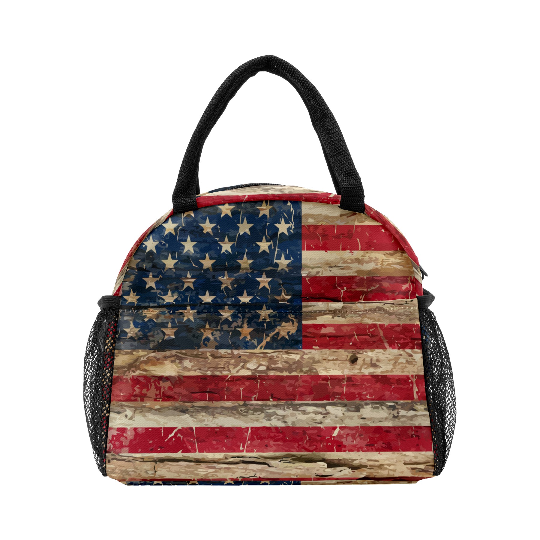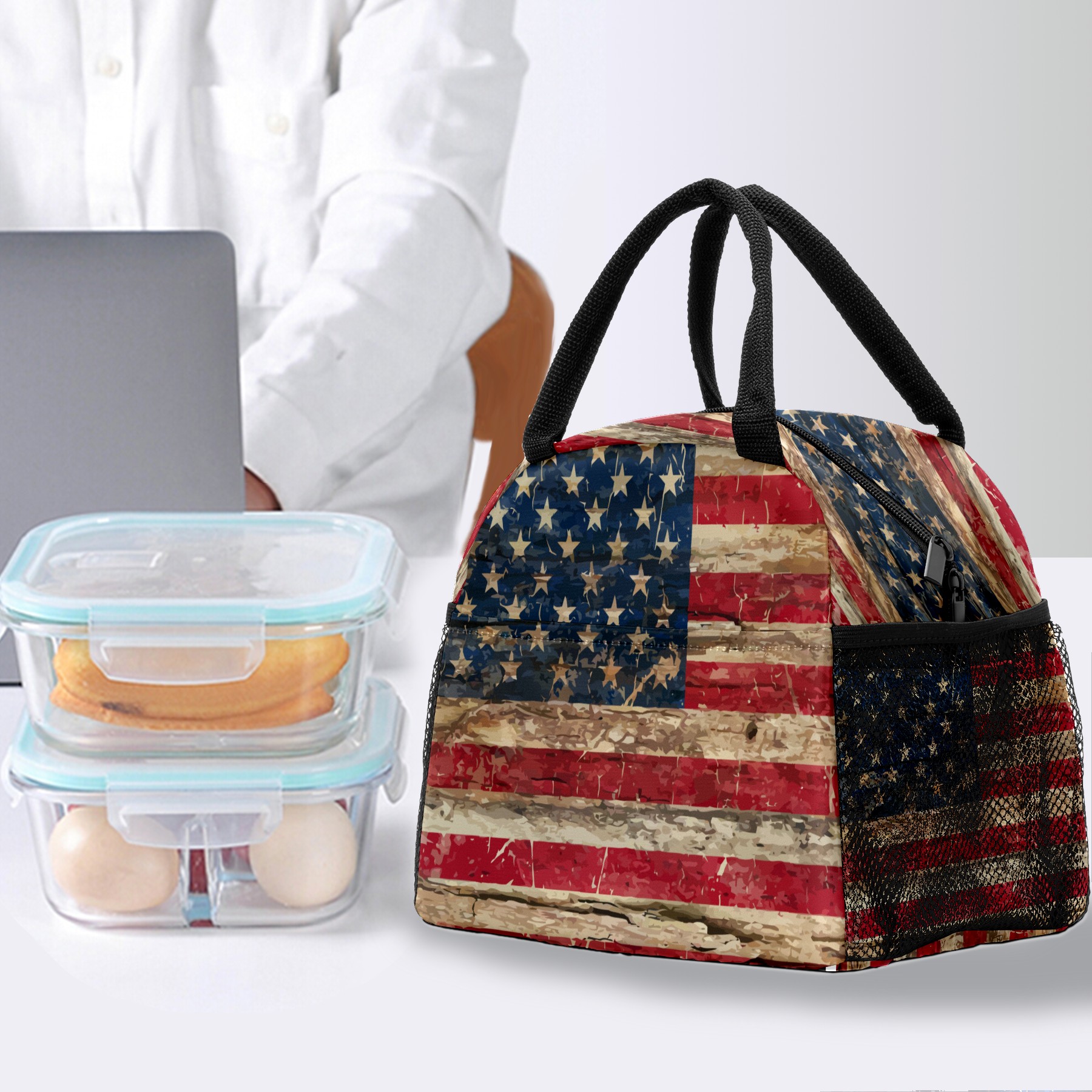 Lunch Bag for Women Men, Wooden Vintage American Flag Insulated Reusable Lunch Box Thermal Cooler Tote Bag for Work Picnic Hiking Travel Beach
