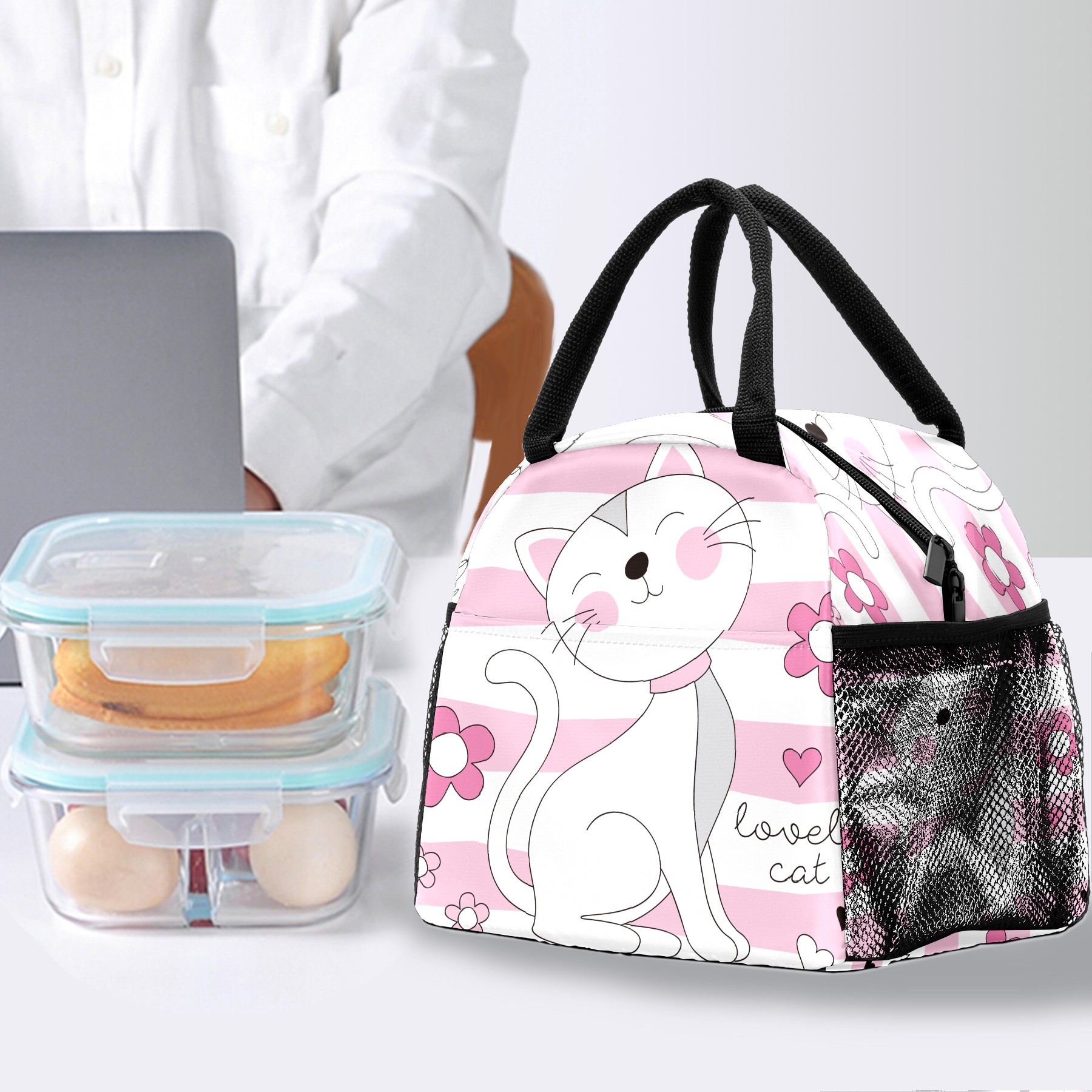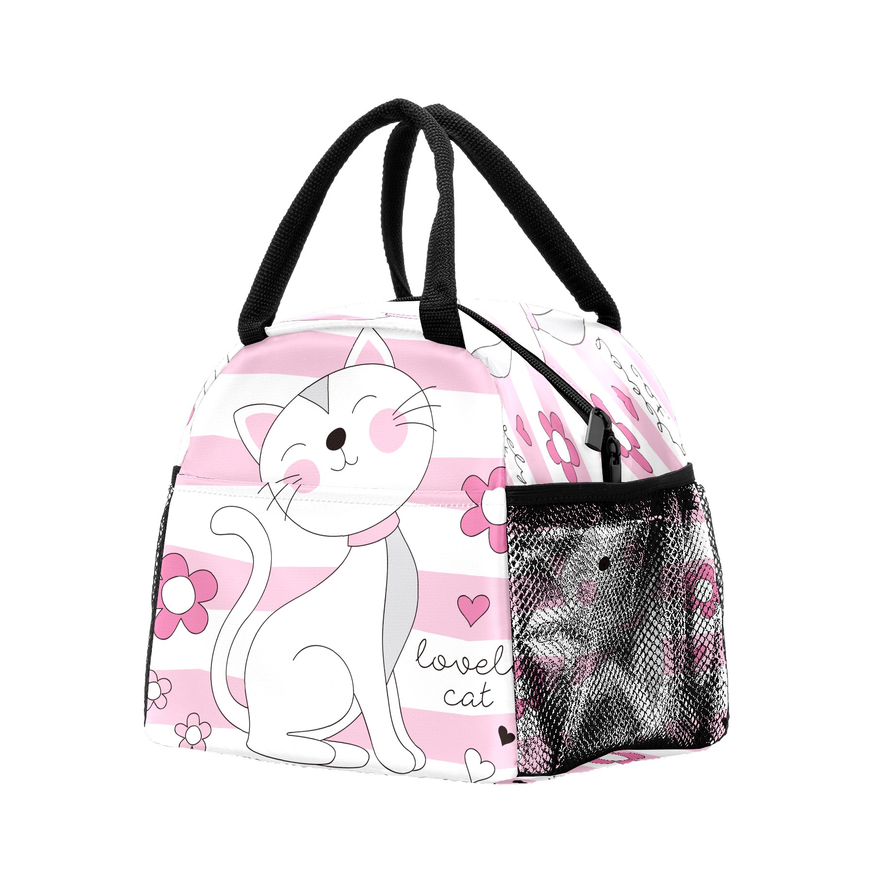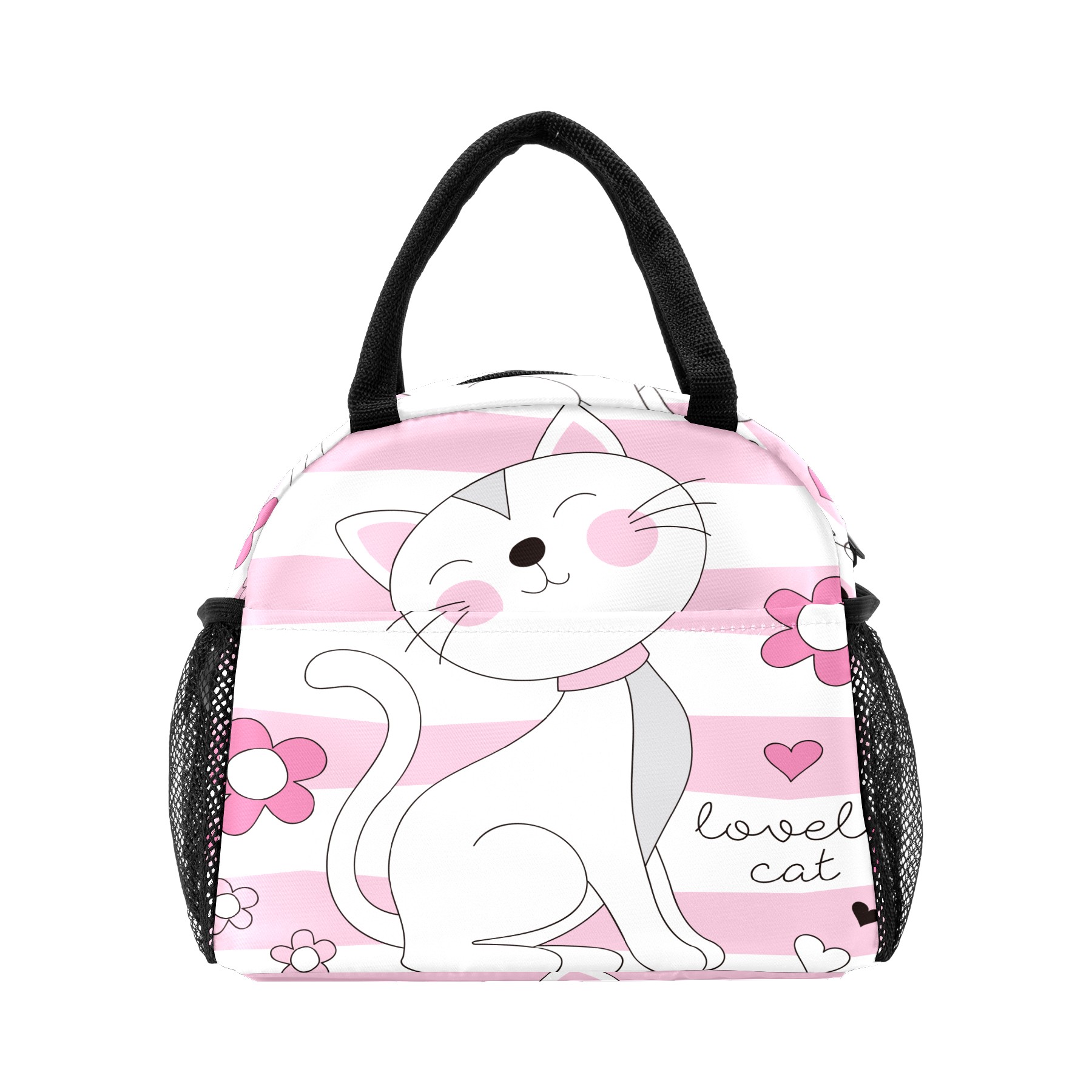 Lunch Bag for Women Men, Pink Cute Lovely Cat Cartoon Flower Insulated Reusable Lunch Box Thermal Cooler Tote Bag for Work Picnic Hiking Travel Beach