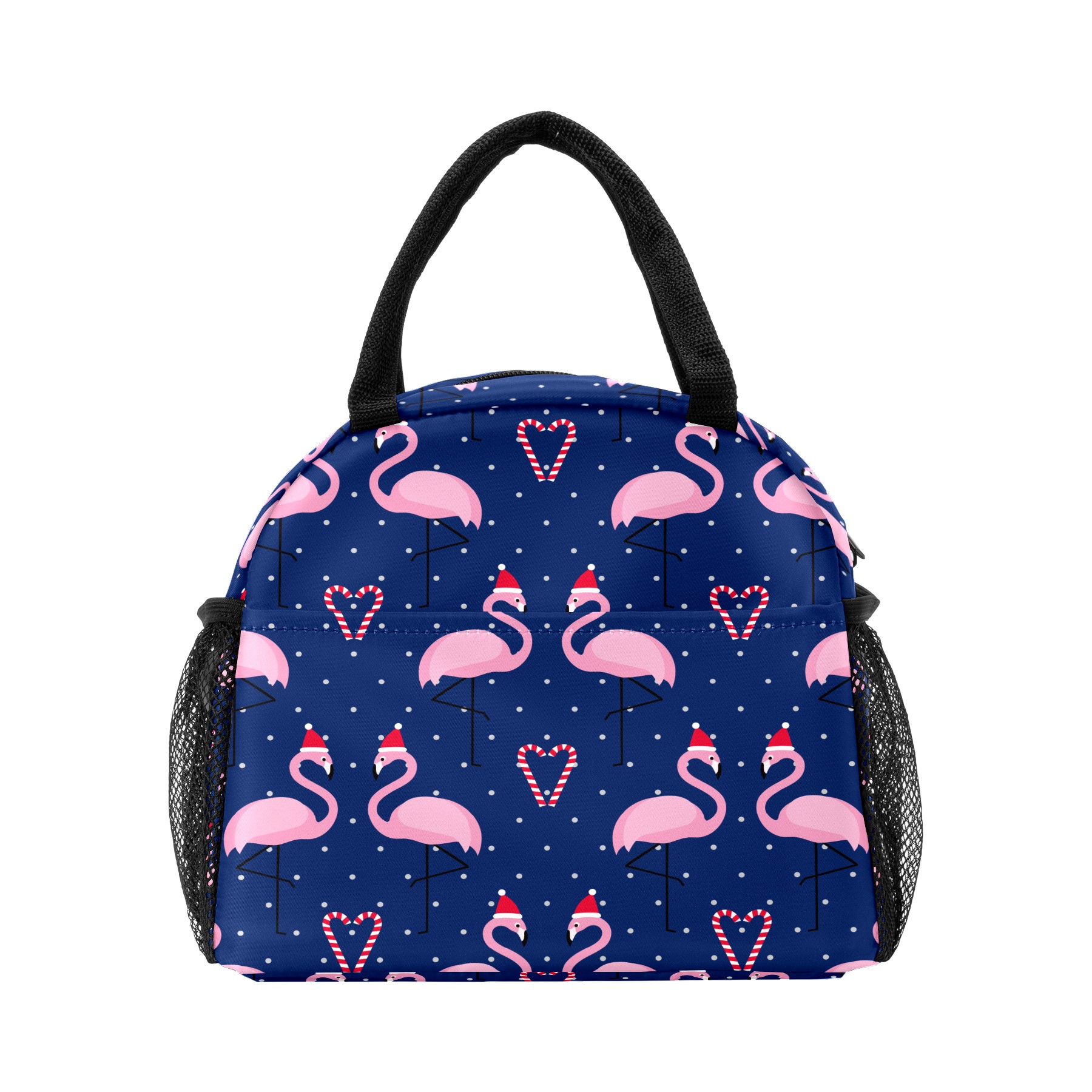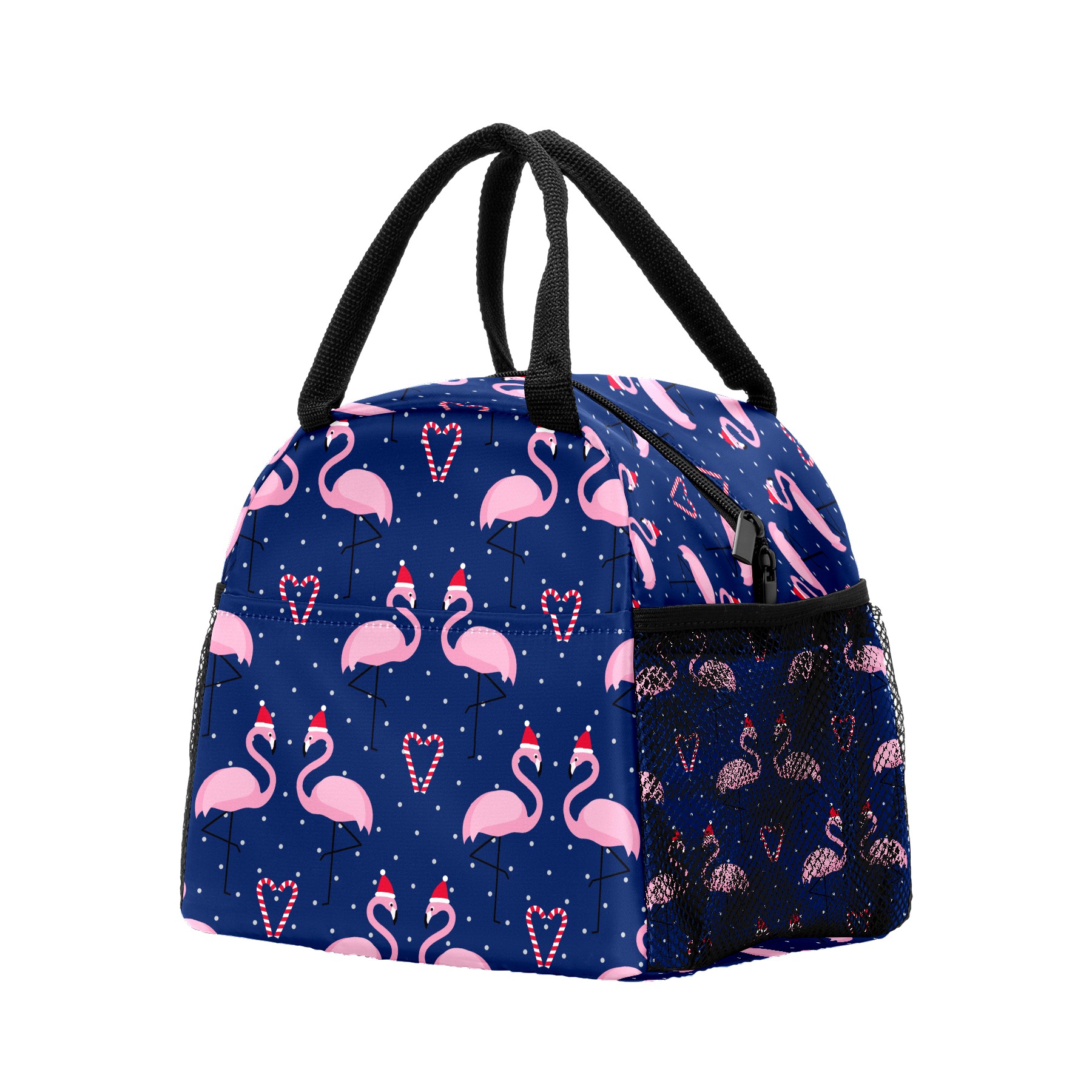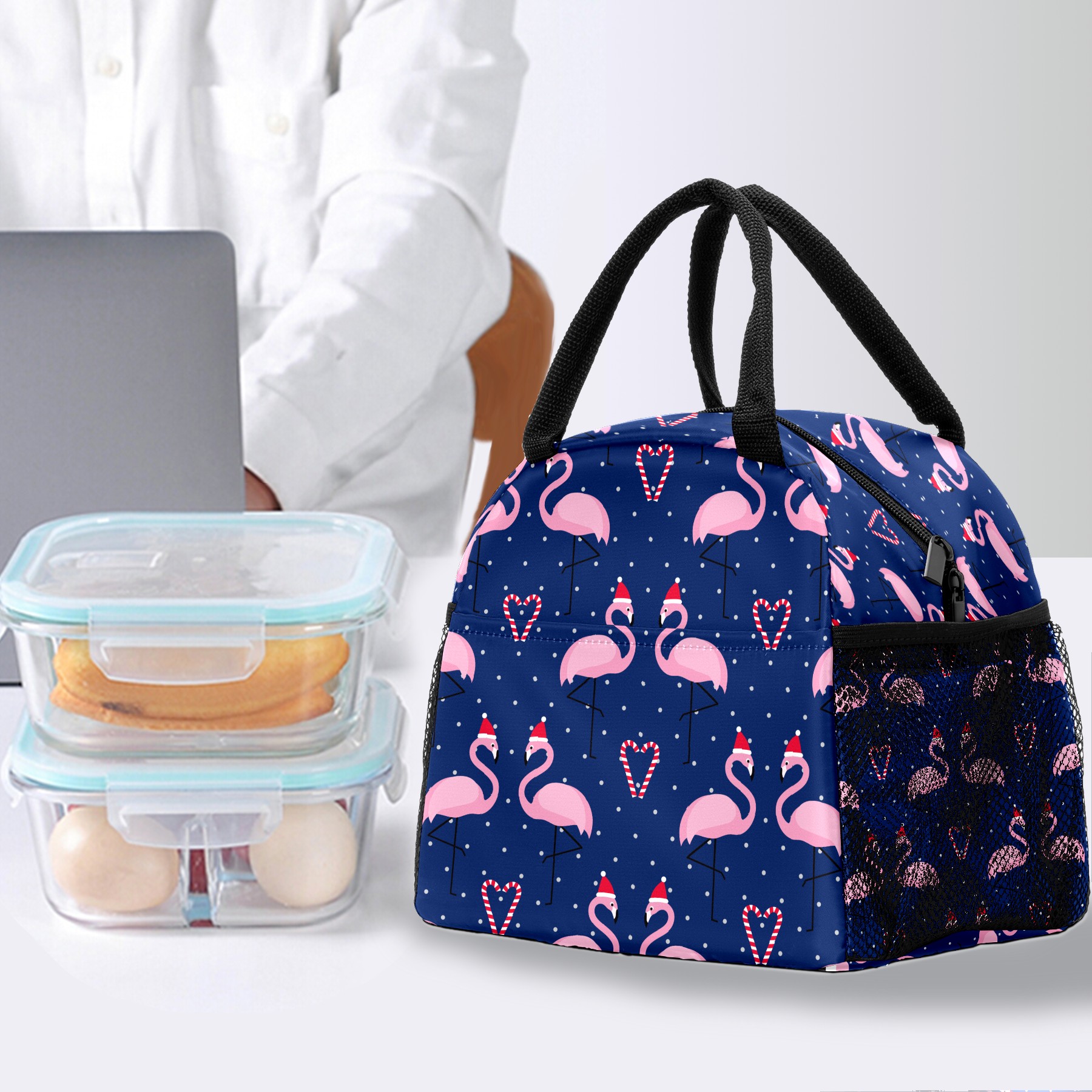 Lunch Bag for Women Men, Love Flamingo With Chirstmas Hat Pattern Insulated Reusable Lunch Box Thermal Cooler Tote Bag for Work Picnic Hiking Travel Beach