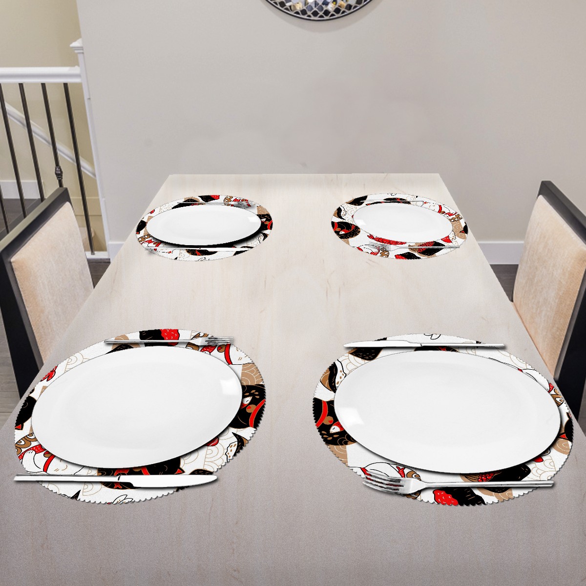 • <p><b>The fashionable design with this table placemat will makes your table look more outstanding and pretty.</b></p> <p><b>Diameter:</b> 15.4 In / 39 cm.</p> <p><b>Packing:</b> 1 PCS/4 PCS/6 PCS.</p> <p><b>Care Instructions:</b></p> <p>1.Wash with water and dry in a cool place. If there are stains on the placemat, you can wipe it with a damp sponge or damp cloth.</p> <p>2.Do not machine wash or sterilize in a microwave oven.</p> <p>3.Note: The package has been rolled up. If you encounter crease problems, please immerse it in warm water and take it out and place a flat object on the mat. The crease will disappear.</p> <p><b>Quality you can trust:</b></p> <p><b>1.Material:High Quality Polyester.</b></p> <p>2.Environmental protection material, no pollution, can be cleaned directly, non-slip, heat-resistant.</p> <p>3.Durable, no deformation,not fade,wrinkle resistant,wear resistant,easy to clean.</p> <p>4.Personalized design. One-Side High Quality Printing Technology.Vivid color and clear images.&nbsp;</p> <p><b>Home Decoration: Suitable for kitchen table,dinner hall,restaurant,hotel,business office,cafe,BBQ,picnic,party,etc.Both practical and decorative.</b></p> <p><b>Best Birthday/Christmas/Halloween/easter/thanksgiving/wedding/engagement anniversary gift to your baby/children/kids/family/boys/girls/parents/friends/girlfriend/boyfriend/wife, etc.</b></p>