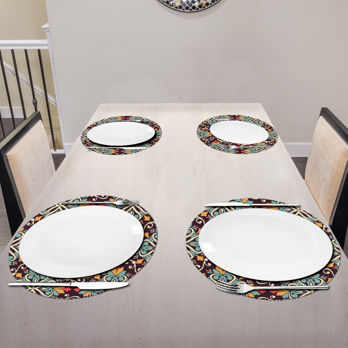 • <p><b>The fashionable design with this table placemat will makes your table look more outstanding and pretty.</b></p> <p><b>Diameter:</b> 15.4 In / 39 cm.</p> <p><b>Packing:</b> 1 PCS/4 PCS/6 PCS.</p> <p><b>Care Instructions:</b></p> <p>1.Wash with water and dry in a cool place. If there are stains on the placemat, you can wipe it with a damp sponge or damp cloth.</p> <p>2.Do not machine wash or sterilize in a microwave oven.</p> <p>3.Note: The package has been rolled up. If you encounter crease problems, please immerse it in warm water and take it out and place a flat object on the mat. The crease will disappear.</p> <p><b>Quality you can trust:</b></p> <p><b>1.Material:High Quality Polyester.</b></p> <p>2.Environmental protection material, no pollution, can be cleaned directly, non-slip, heat-resistant.</p> <p>3.Durable, no deformation,not fade,wrinkle resistant,wear resistant,easy to clean.</p> <p>4.Personalized design. One-Side High Quality Printing Technology.Vivid color and clear images.&nbsp;</p> <p><b>Home Decoration: Suitable for kitchen table,dinner hall,restaurant,hotel,business office,cafe,BBQ,picnic,party,etc.Both practical and decorative.</b></p> <p><b>Best Birthday/Christmas/Halloween/easter/thanksgiving/wedding/engagement anniversary gift to your baby/children/kids/family/boys/girls/parents/friends/girlfriend/boyfriend/wife, etc.</b></p>