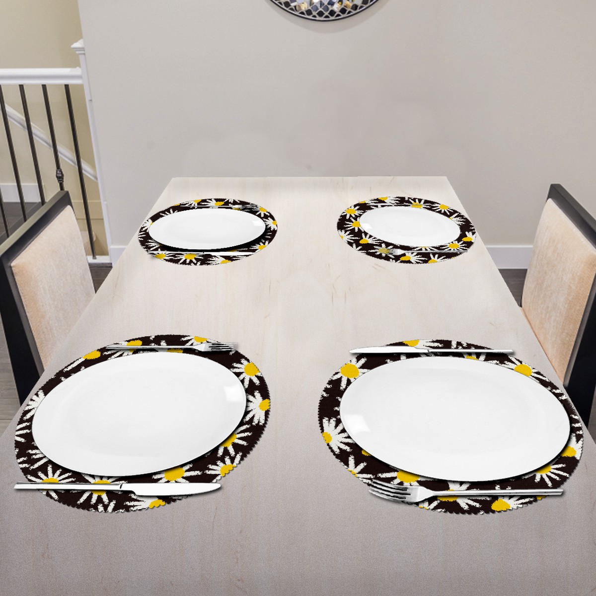 • <p><b>The fashionable design with this table placemat will makes your table look more outstanding and pretty.</b></p> <p><b>Diameter:</b> 15.4 In / 39 cm.</p> <p><b>Packing:</b> 1 PCS/4 PCS/6 PCS.</p> <p><b>Care Instructions:</b></p> <p>1.Wash with water and dry in a cool place. If there are stains on the placemat, you can wipe it with a damp sponge or damp cloth.</p> <p>2.Do not machine wash or sterilize in a microwave oven.</p> <p>3.Note: The package has been rolled up. If you encounter crease problems, please immerse it in warm water and take it out and place a flat object on the mat. The crease will disappear.</p> <p><b>Quality you can trust:</b></p> <p><b>1.Material:High Quality Polyester.</b></p> <p>2.Environmental protection material, no pollution, can be cleaned directly, non-slip, heat-resistant.</p> <p>3.Durable, no deformation,not fade,wrinkle resistant,wear resistant,easy to clean.</p> <p>4.Personalized design. One-Side High Quality Printing Technology.Vivid color and clear images.&nbsp;</p> <p><b>Home Decoration: Suitable for kitchen table,dinner hall,restaurant,hotel,business office,cafe,BBQ,picnic,party,etc.Both practical and decorative.</b></p> <p><b>Best Birthday/Christmas/Halloween/easter/thanksgiving/wedding/engagement anniversary gift to your baby/children/kids/family/boys/girls/parents/friends/girlfriend/boyfriend/wife, etc.</b></p>