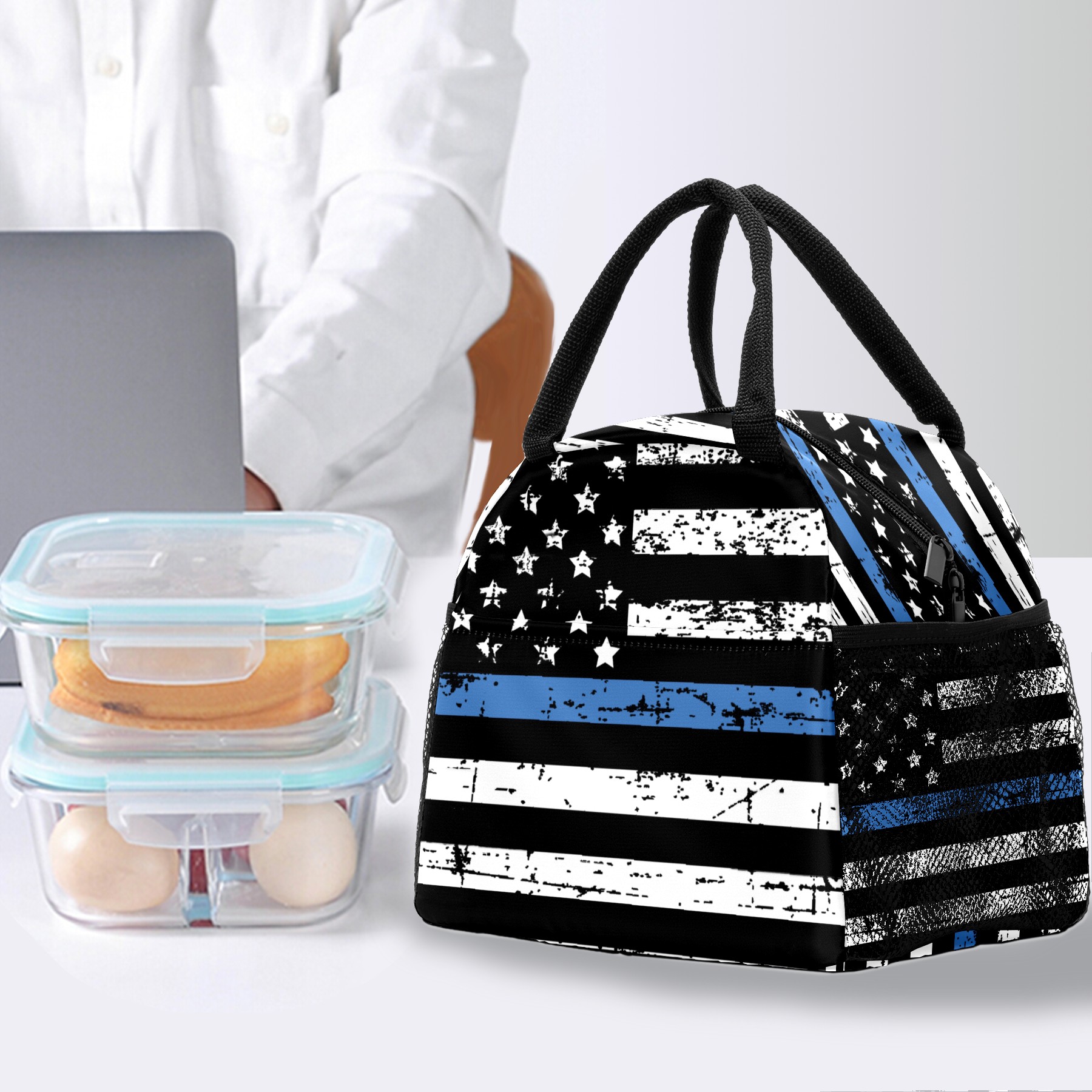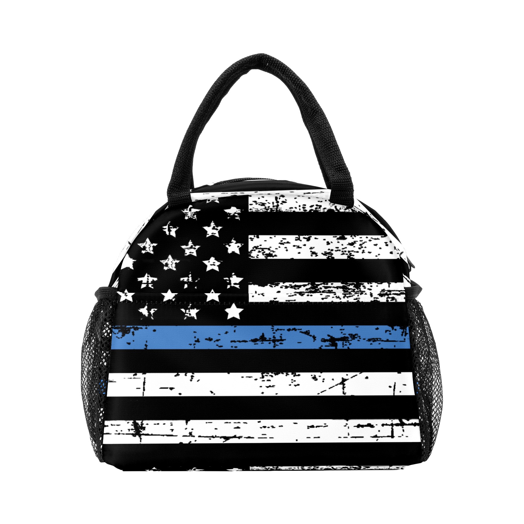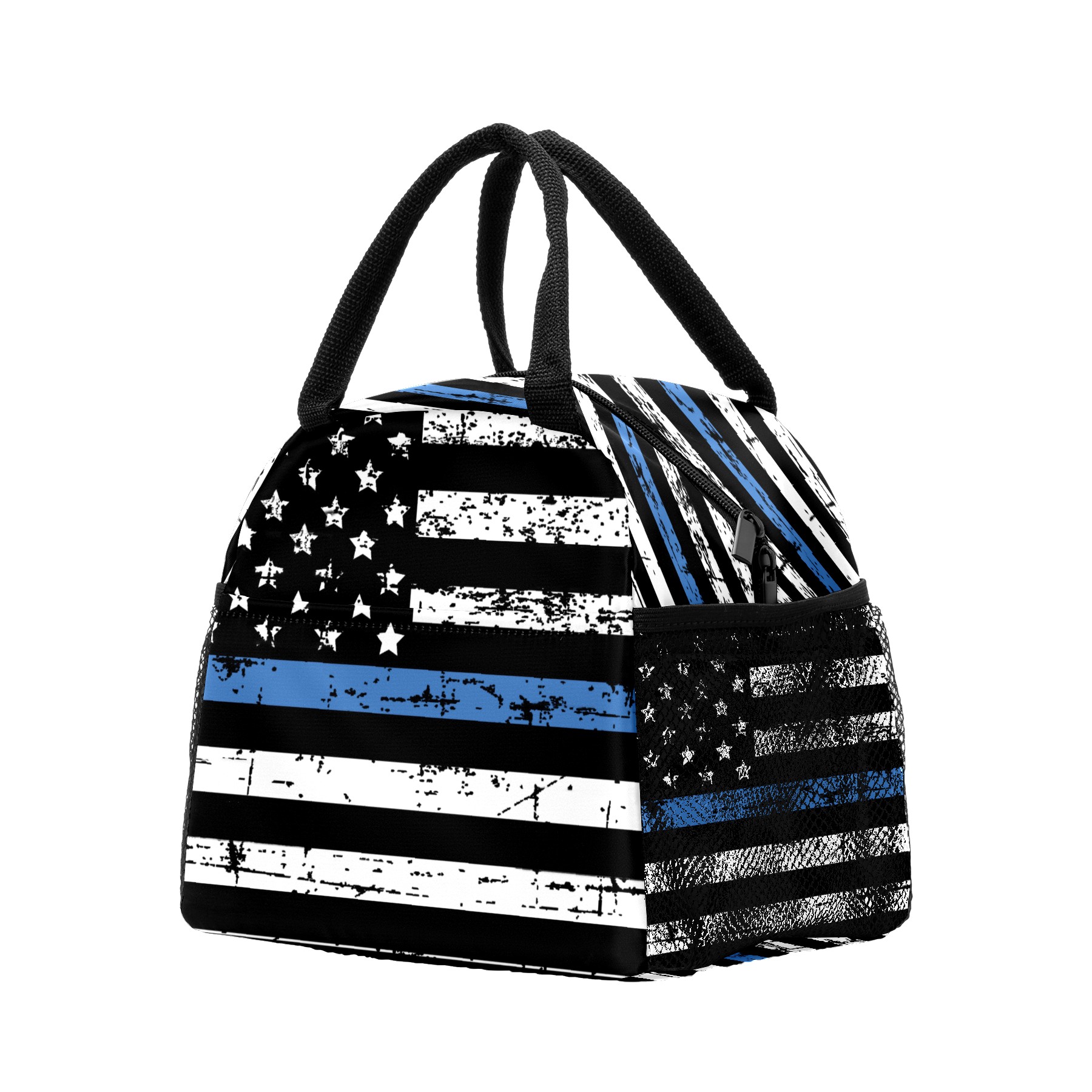Lunch Bag for Women Men, Grunge Thin Blue Line American Flag Insulated Reusable Lunch Box Thermal Cooler Tote Bag for Work Picnic Hiking Travel Beach