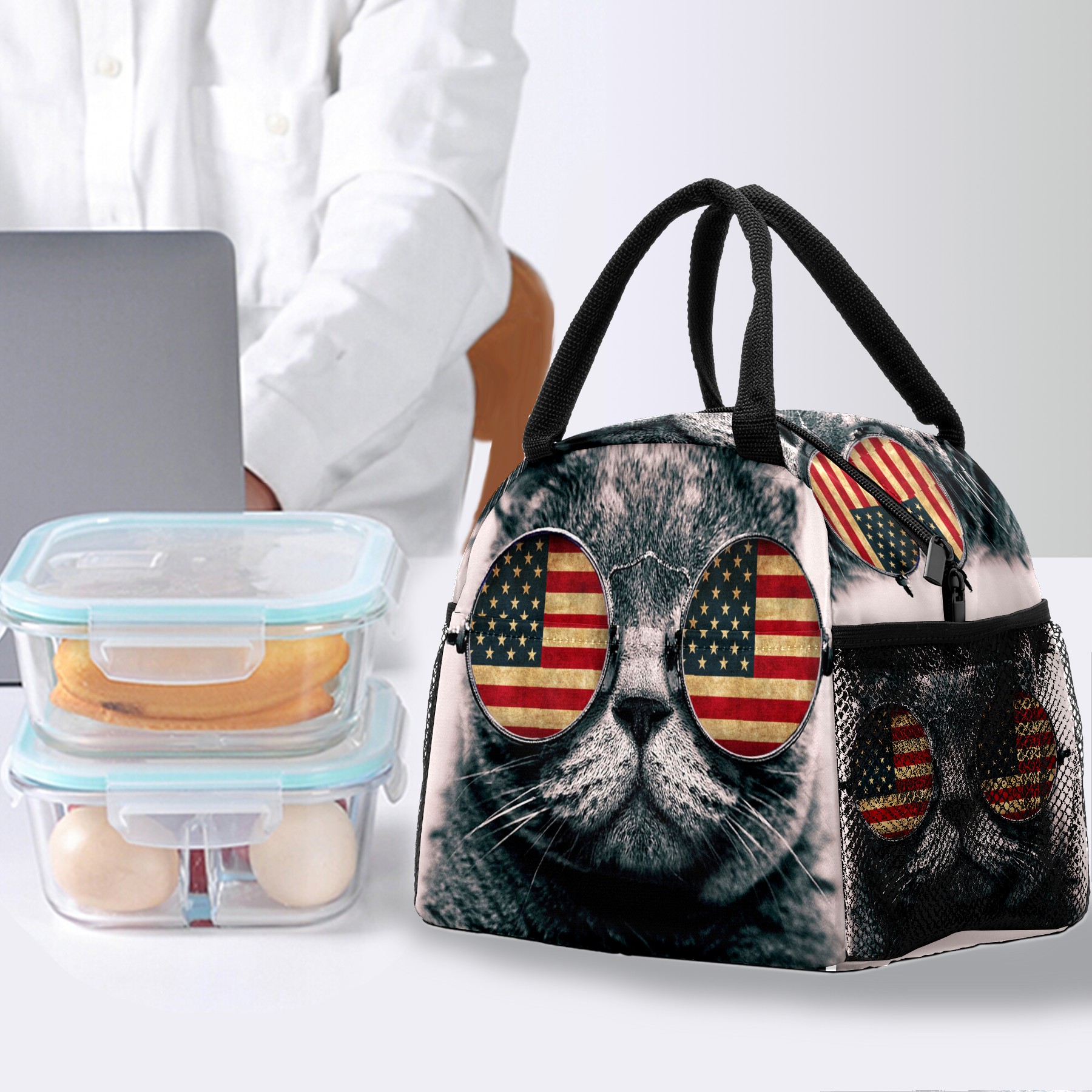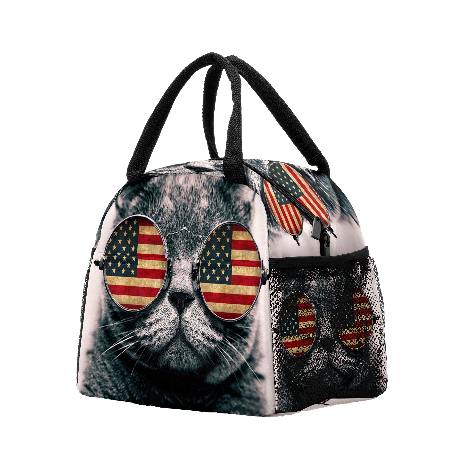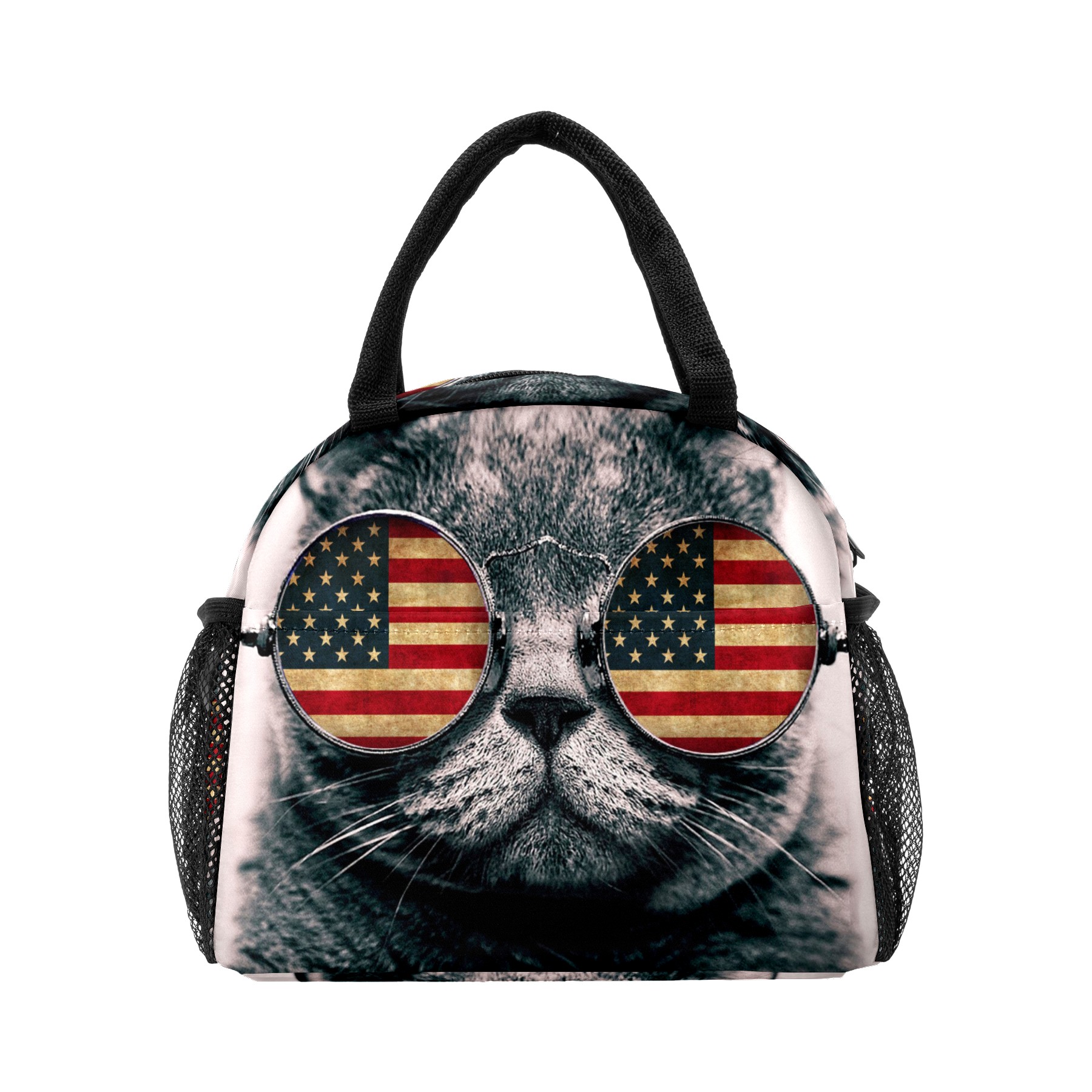 Lunch Bag for Women Men, Funny Cat With American Flag Insulated Reusable Lunch Box Thermal Cooler Tote Bag for Work Picnic Hiking Travel Beach