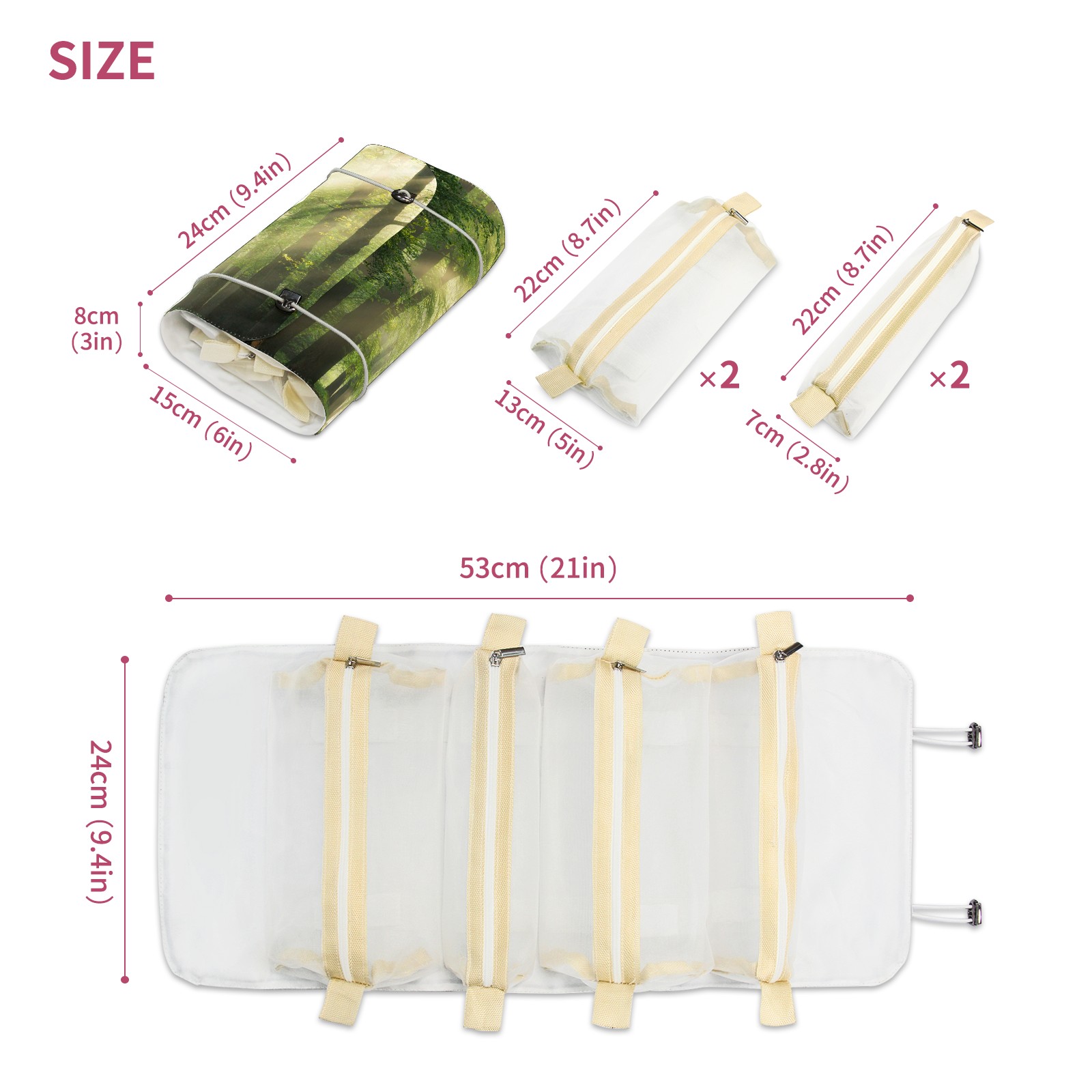 • <p> This is a nice and compact travel/ organizer bag. All the pouches are removable. This makes it very easy to use or pull out what you need in the moment, and not get stuck rummaging through a bag and not being able to find your items. It folds up nicely, and has 2 bungee straps that you can sinch tight to hold. It works great for traveling. </p> <p> </p> <p><b> Notes:&nbsp; </b></p> <p> 1.Due to the difference between different monitors,the picture may not reflect the actual color of the item. We guarantee the style is the same as shown in the pictures.&nbsp; </p> <p> 2.Due to the manual measurement and different measurement methods, please allow 1-3cm deviation.Thanks! </p>