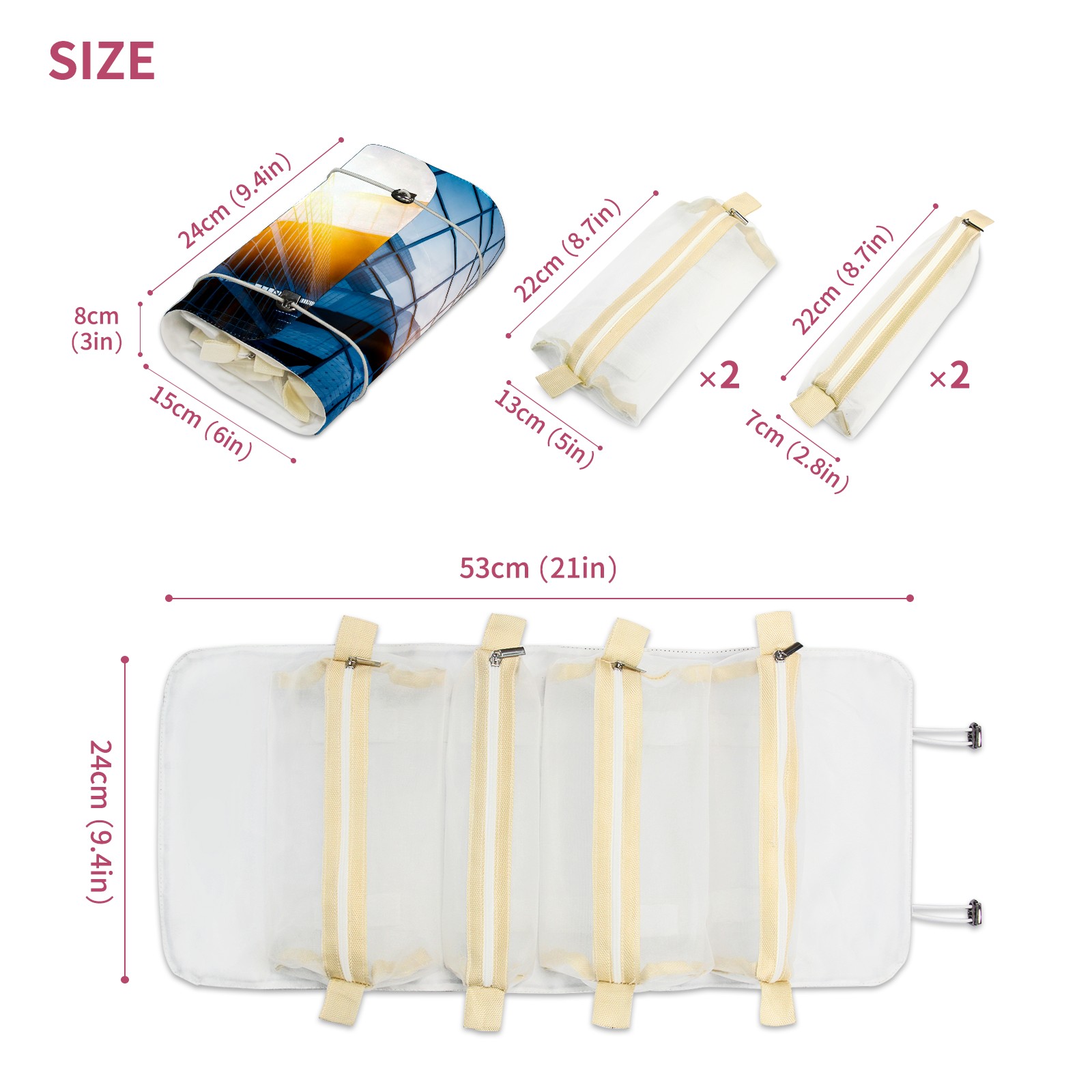 • <p> This is a nice and compact travel/ organizer bag. All the pouches are removable. This makes it very easy to use or pull out what you need in the moment, and not get stuck rummaging through a bag and not being able to find your items. It folds up nicely, and has 2 bungee straps that you can sinch tight to hold. It works great for traveling. </p> <p> </p> <p><b> Notes:&nbsp; </b></p> <p> 1.Due to the difference between different monitors,the picture may not reflect the actual color of the item. We guarantee the style is the same as shown in the pictures.&nbsp; </p> <p> 2.Due to the manual measurement and different measurement methods, please allow 1-3cm deviation.Thanks! </p>