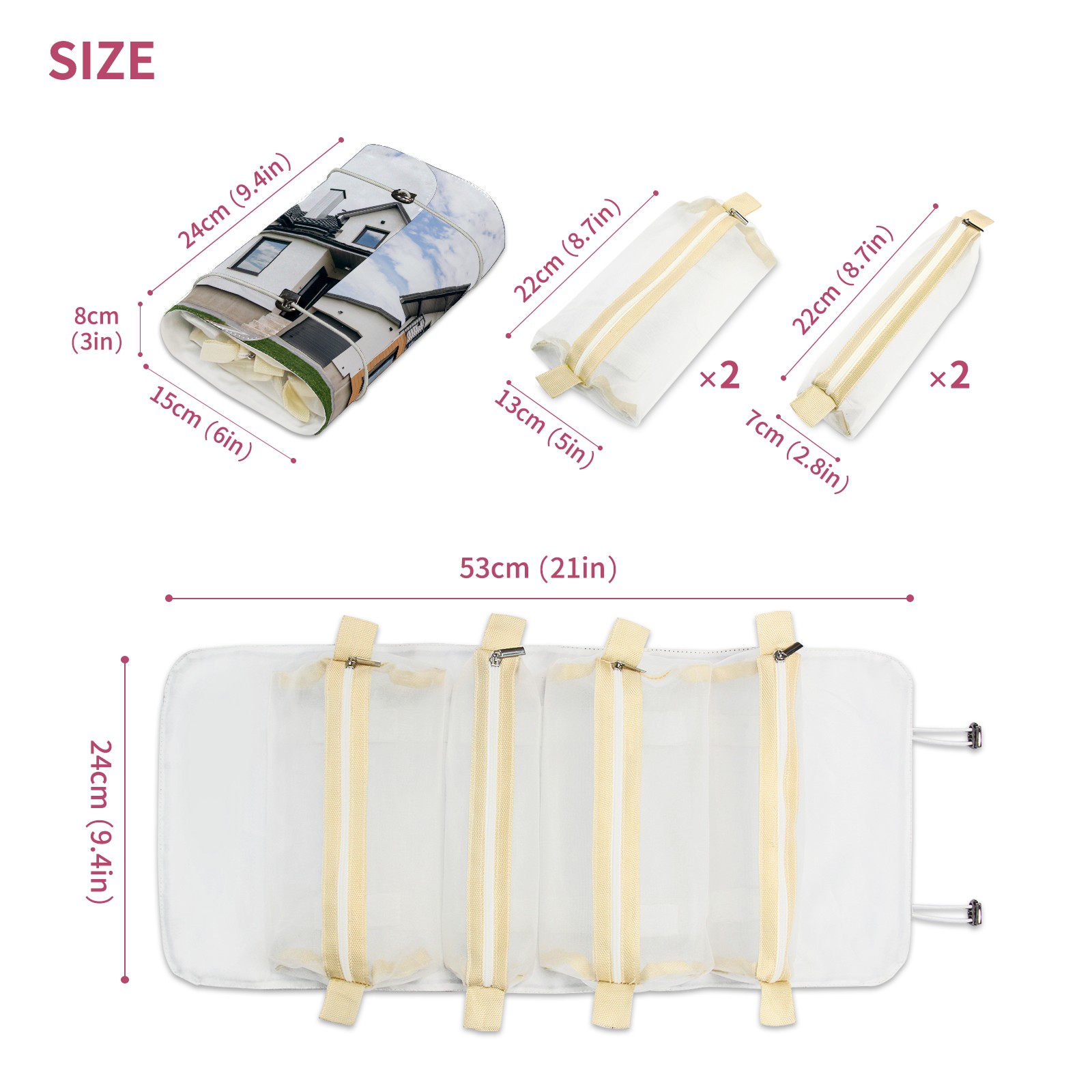 <p> This is a nice and compact travel/ organizer bag. All the pouches are removable. This makes it very easy to use or pull out what you need in the moment, and not get stuck rummaging through a bag and not being able to find your items. It folds up nicely, and has 2 bungee straps that you can sinch tight to hold. It works great for traveling. </p> <p> </p> <p><b> Notes:&nbsp; </b></p> <p> 1.Due to the difference between different monitors,the picture may not reflect the actual color of the item. We guarantee the style is the same as shown in the pictures.&nbsp; </p> <p> 2.Due to the manual measurement and different measurement methods, please allow 1-3cm deviation.Thanks! </p>