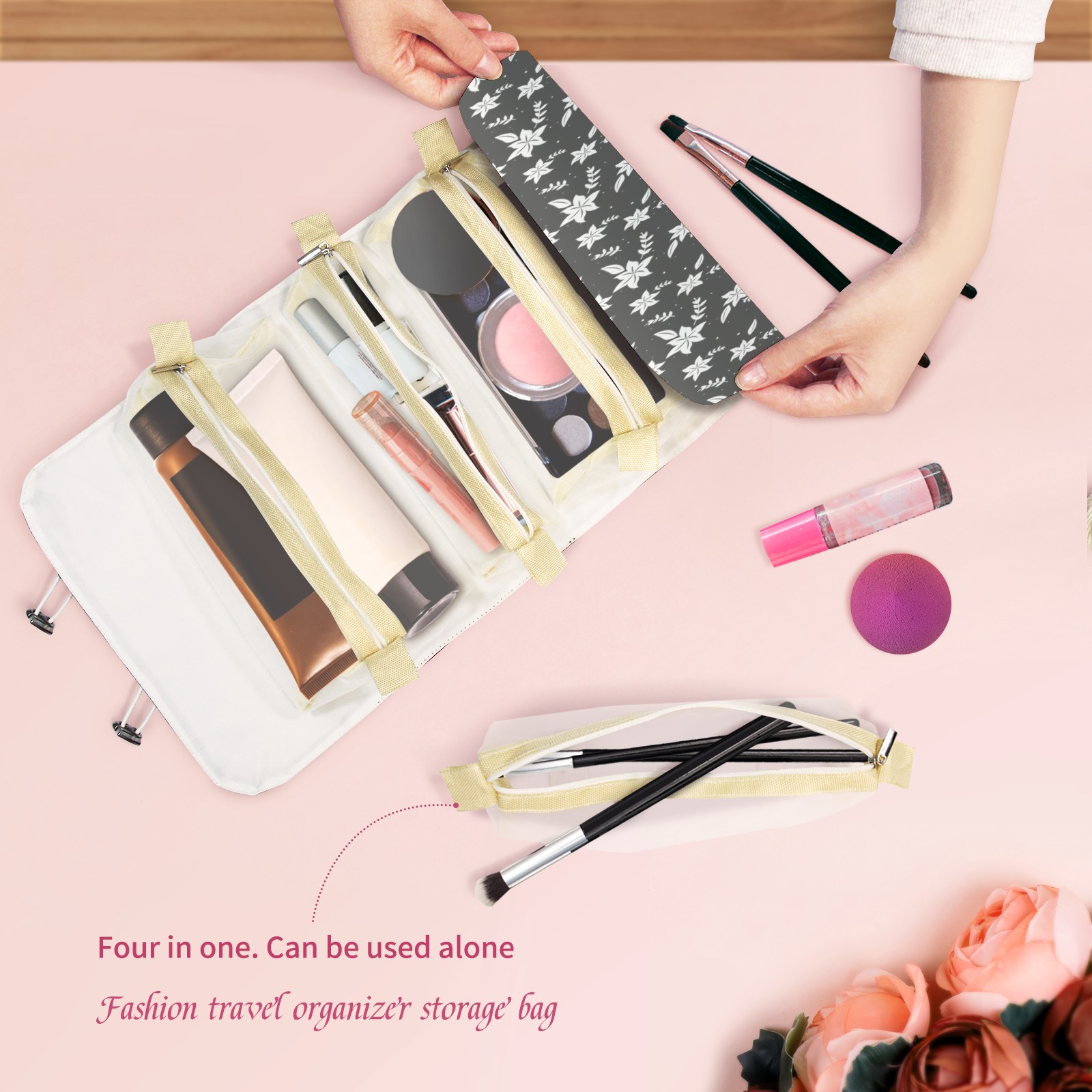 <p> This is a nice and compact travel/ organizer bag. All the pouches are removable. This makes it very easy to use or pull out what you need in the moment, and not get stuck rummaging through a bag and not being able to find your items. It folds up nicely, and has 2 bungee straps that you can sinch tight to hold. It works great for traveling. </p> <p> </p> <p><b> Notes:&nbsp; </b></p> <p> 1.Due to the difference between different monitors,the picture may not reflect the actual color of the item. We guarantee the style is the same as shown in the pictures.&nbsp; </p> <p> 2.Due to the manual measurement and different measurement methods, please allow 1-3cm deviation.Thanks! </p>
