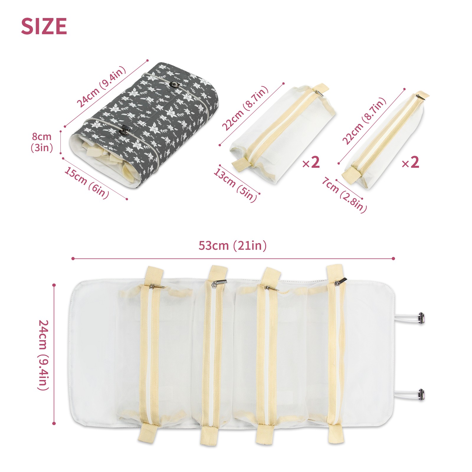• <p> This is a nice and compact travel/ organizer bag. All the pouches are removable. This makes it very easy to use or pull out what you need in the moment, and not get stuck rummaging through a bag and not being able to find your items. It folds up nicely, and has 2 bungee straps that you can sinch tight to hold. It works great for traveling. </p> <p> </p> <p><b> Notes:&nbsp; </b></p> <p> 1.Due to the difference between different monitors,the picture may not reflect the actual color of the item. We guarantee the style is the same as shown in the pictures.&nbsp; </p> <p> 2.Due to the manual measurement and different measurement methods, please allow 1-3cm deviation.Thanks! </p>
