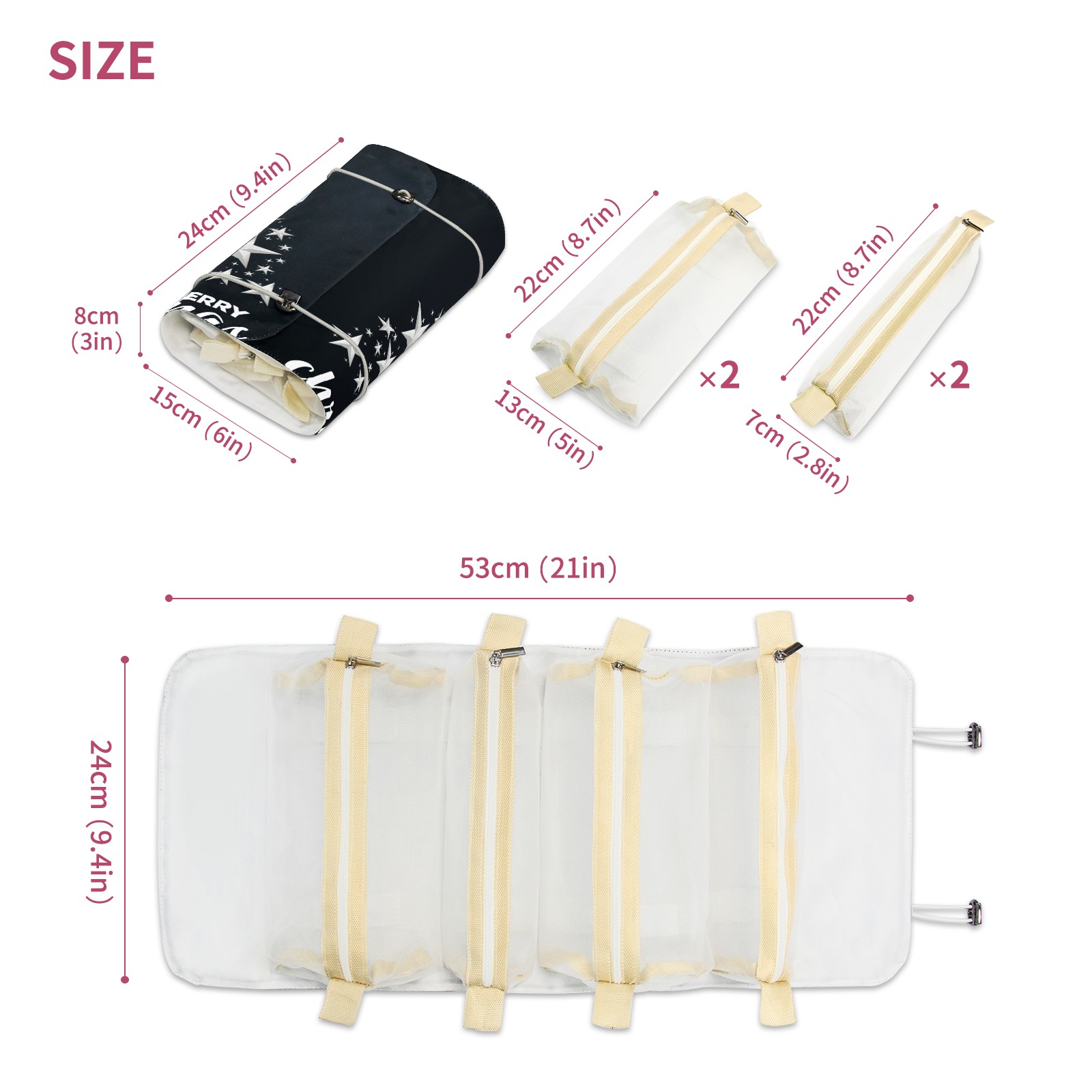 • <p> This is a nice and compact travel/ organizer bag. All the pouches are removable. This makes it very easy to use or pull out what you need in the moment, and not get stuck rummaging through a bag and not being able to find your items. It folds up nicely, and has 2 bungee straps that you can sinch tight to hold. It works great for traveling. </p> <p> </p> <p><b> Notes:&nbsp; </b></p> <p> 1.Due to the difference between different monitors,the picture may not reflect the actual color of the item. We guarantee the style is the same as shown in the pictures.&nbsp; </p> <p> 2.Due to the manual measurement and different measurement methods, please allow 1-3cm deviation.Thanks! </p>