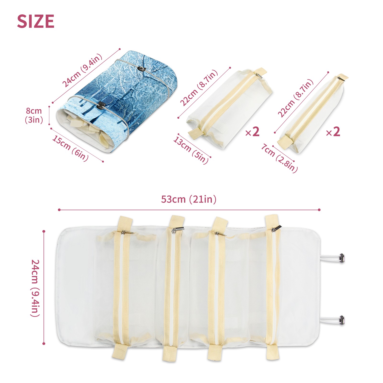 • <p> This is a nice and compact travel/ organizer bag. All the pouches are removable. This makes it very easy to use or pull out what you need in the moment, and not get stuck rummaging through a bag and not being able to find your items. It folds up nicely, and has 2 bungee straps that you can sinch tight to hold. It works great for traveling. </p> <p> </p> <p><b> Notes:&nbsp; </b></p> <p> 1.Due to the difference between different monitors,the picture may not reflect the actual color of the item. We guarantee the style is the same as shown in the pictures.&nbsp; </p> <p> 2.Due to the manual measurement and different measurement methods, please allow 1-3cm deviation.Thanks! </p>