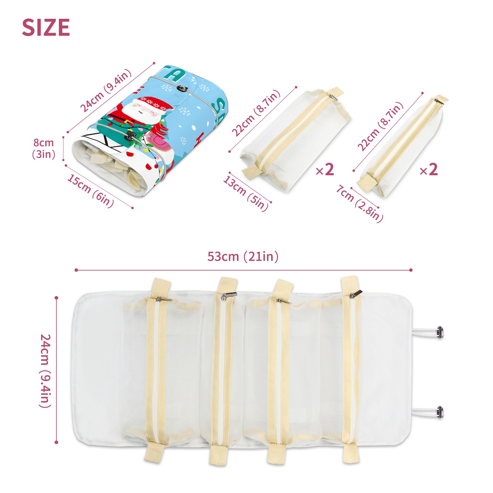 • <p> This is a nice and compact travel/ organizer bag. All the pouches are removable. This makes it very easy to use or pull out what you need in the moment, and not get stuck rummaging through a bag and not being able to find your items. It folds up nicely, and has 2 bungee straps that you can sinch tight to hold. It works great for traveling. </p> <p> </p> <p><b> Notes:&nbsp; </b></p> <p> 1.Due to the difference between different monitors,the picture may not reflect the actual color of the item. We guarantee the style is the same as shown in the pictures.&nbsp; </p> <p> 2.Due to the manual measurement and different measurement methods, please allow 1-3cm deviation.Thanks! </p>