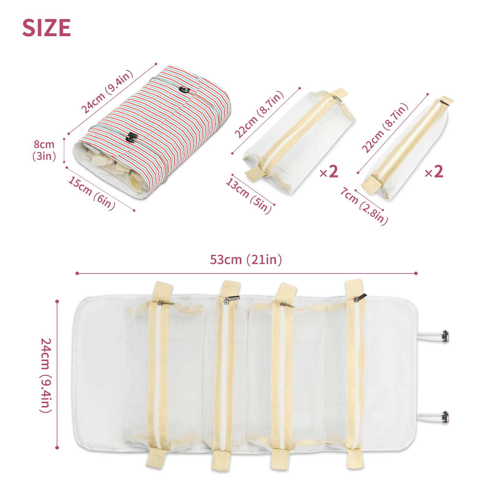 • <p> This is a nice and compact travel/ organizer bag. All the pouches are removable. This makes it very easy to use or pull out what you need in the moment, and not get stuck rummaging through a bag and not being able to find your items. It folds up nicely, and has 2 bungee straps that you can sinch tight to hold. It works great for traveling. </p> <p> </p> <p><b> Notes:&nbsp; </b></p> <p> 1.Due to the difference between different monitors,the picture may not reflect the actual color of the item. We guarantee the style is the same as shown in the pictures.&nbsp; </p> <p> 2.Due to the manual measurement and different measurement methods, please allow 1-3cm deviation.Thanks! </p>
