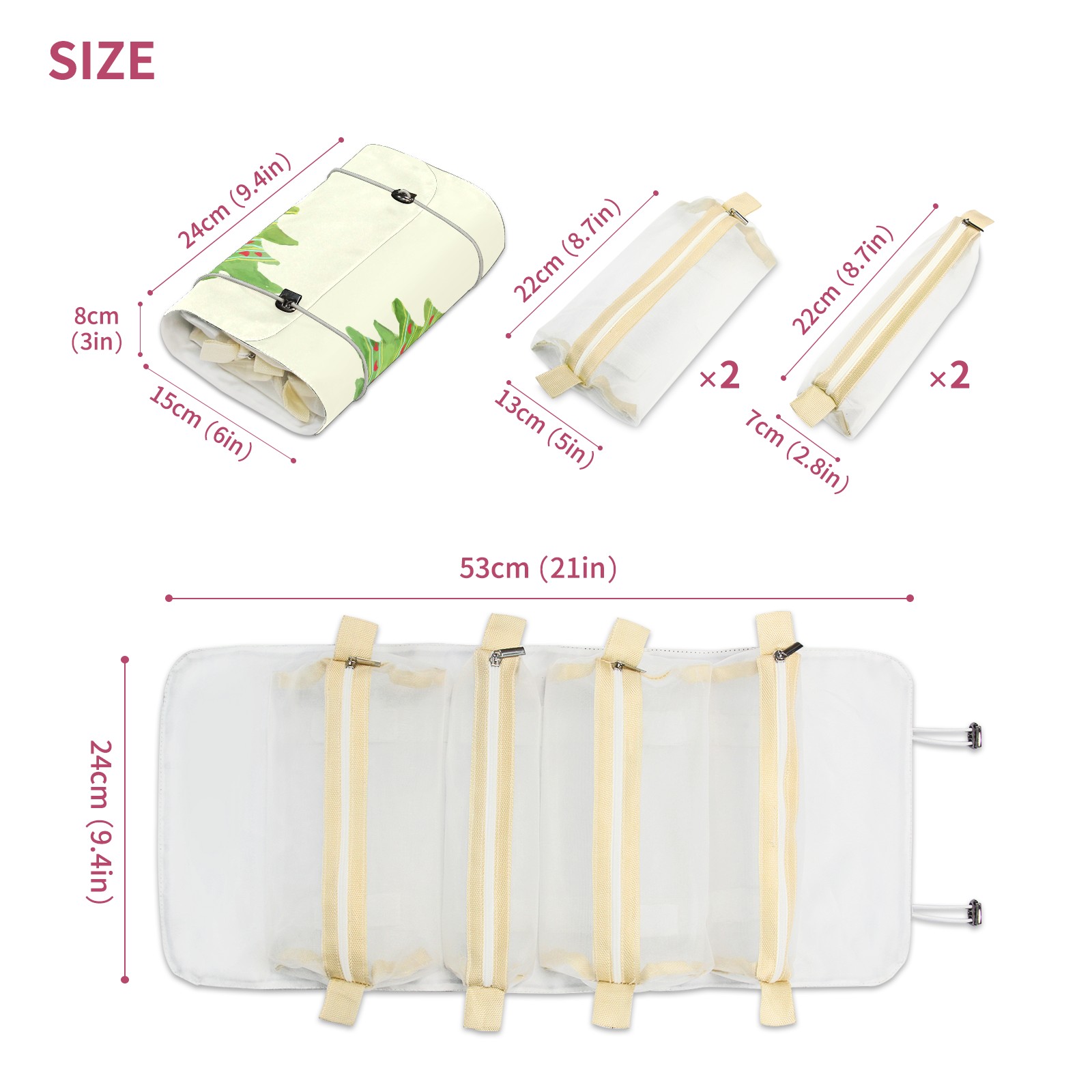 • <p> This is a nice and compact travel/ organizer bag. All the pouches are removable. This makes it very easy to use or pull out what you need in the moment, and not get stuck rummaging through a bag and not being able to find your items. It folds up nicely, and has 2 bungee straps that you can sinch tight to hold. It works great for traveling. </p> <p> </p> <p><b> Notes:&nbsp; </b></p> <p> 1.Due to the difference between different monitors,the picture may not reflect the actual color of the item. We guarantee the style is the same as shown in the pictures.&nbsp; </p> <p> 2.Due to the manual measurement and different measurement methods, please allow 1-3cm deviation.Thanks! </p>