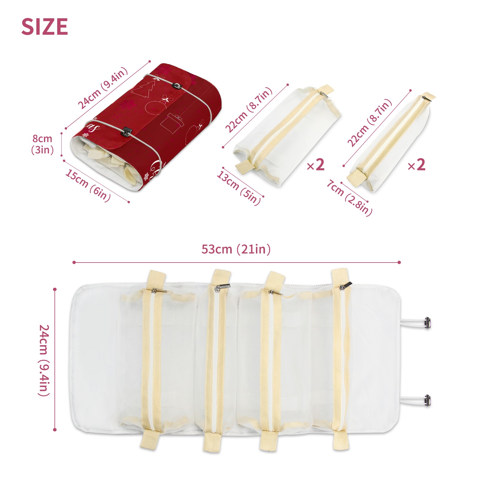 • <p> This is a nice and compact travel/ organizer bag. All the pouches are removable. This makes it very easy to use or pull out what you need in the moment, and not get stuck rummaging through a bag and not being able to find your items. It folds up nicely, and has 2 bungee straps that you can sinch tight to hold. It works great for traveling. </p> <p> </p> <p><b> Notes:&nbsp; </b></p> <p> 1.Due to the difference between different monitors,the picture may not reflect the actual color of the item. We guarantee the style is the same as shown in the pictures.&nbsp; </p> <p> 2.Due to the manual measurement and different measurement methods, please allow 1-3cm deviation.Thanks! </p>