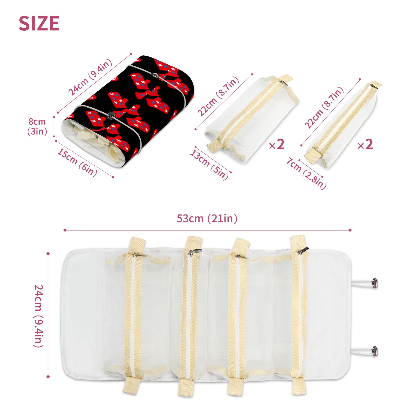 <p> This is a nice and compact travel/ organizer bag. All the pouches are removable. This makes it very easy to use or pull out what you need in the moment, and not get stuck rummaging through a bag and not being able to find your items. It folds up nicely, and has 2 bungee straps that you can sinch tight to hold. It works great for traveling. </p> <p> </p> <p><b> Notes:&nbsp; </b></p> <p> 1.Due to the difference between different monitors,the picture may not reflect the actual color of the item. We guarantee the style is the same as shown in the pictures.&nbsp; </p> <p> 2.Due to the manual measurement and different measurement methods, please allow 1-3cm deviation.Thanks! </p>