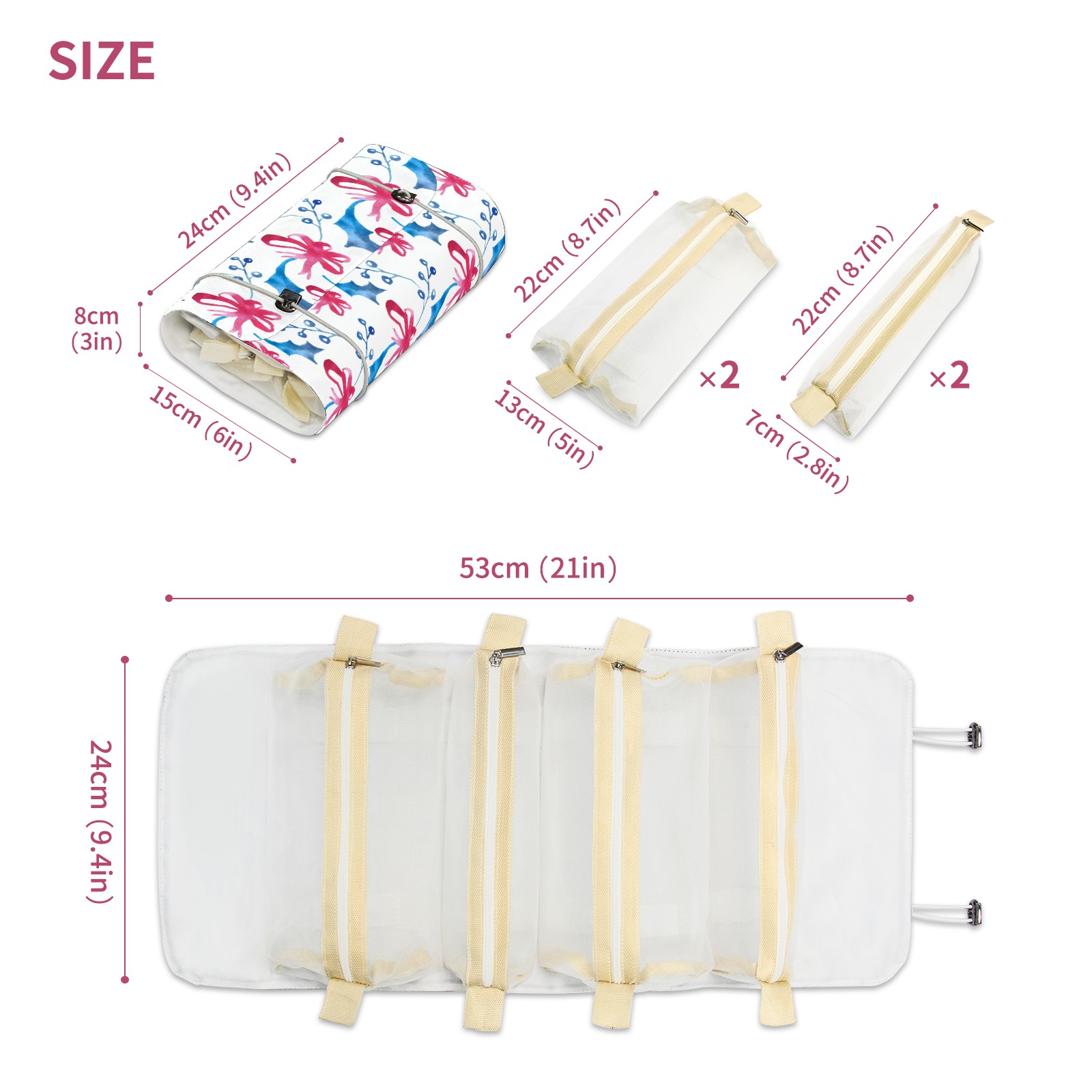 • <p> This is a nice and compact travel/ organizer bag. All the pouches are removable. This makes it very easy to use or pull out what you need in the moment, and not get stuck rummaging through a bag and not being able to find your items. It folds up nicely, and has 2 bungee straps that you can sinch tight to hold. It works great for traveling. </p> <p> </p> <p><b> Notes:&nbsp; </b></p> <p> 1.Due to the difference between different monitors,the picture may not reflect the actual color of the item. We guarantee the style is the same as shown in the pictures.&nbsp; </p> <p> 2.Due to the manual measurement and different measurement methods, please allow 1-3cm deviation.Thanks! </p>
