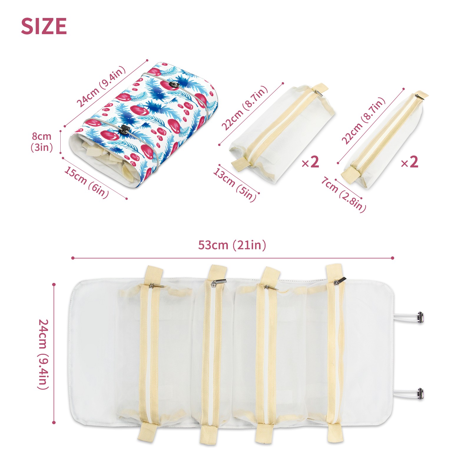 • <p> This is a nice and compact travel/ organizer bag. All the pouches are removable. This makes it very easy to use or pull out what you need in the moment, and not get stuck rummaging through a bag and not being able to find your items. It folds up nicely, and has 2 bungee straps that you can sinch tight to hold. It works great for traveling. </p> <p> </p> <p><b> Notes:&nbsp; </b></p> <p> 1.Due to the difference between different monitors,the picture may not reflect the actual color of the item. We guarantee the style is the same as shown in the pictures.&nbsp; </p> <p> 2.Due to the manual measurement and different measurement methods, please allow 1-3cm deviation.Thanks! </p>
