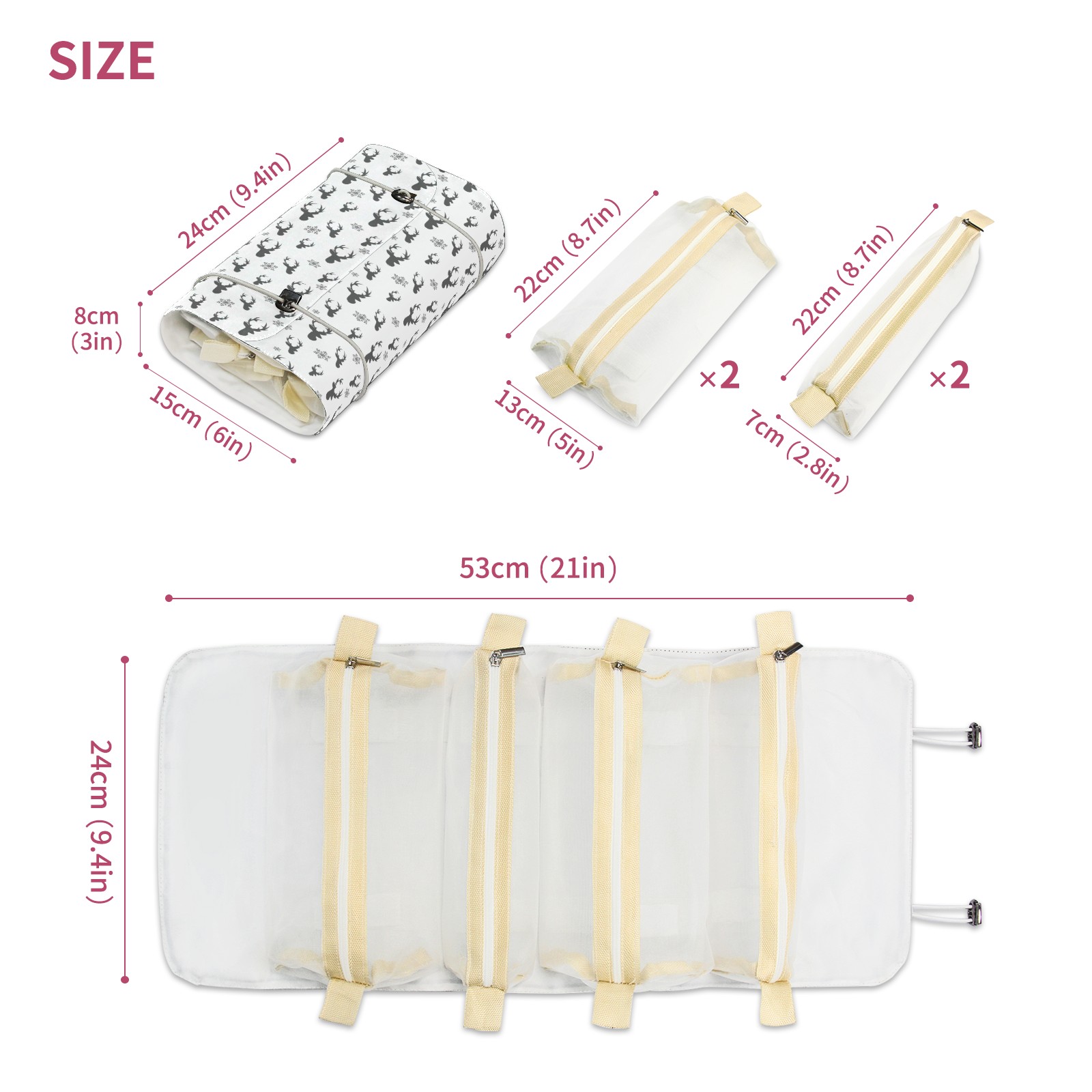 <p> This is a nice and compact travel/ organizer bag. All the pouches are removable. This makes it very easy to use or pull out what you need in the moment, and not get stuck rummaging through a bag and not being able to find your items. It folds up nicely, and has 2 bungee straps that you can sinch tight to hold. It works great for traveling. </p> <p> </p> <p><b> Notes:&nbsp; </b></p> <p> 1.Due to the difference between different monitors,the picture may not reflect the actual color of the item. We guarantee the style is the same as shown in the pictures.&nbsp; </p> <p> 2.Due to the manual measurement and different measurement methods, please allow 1-3cm deviation.Thanks! </p>